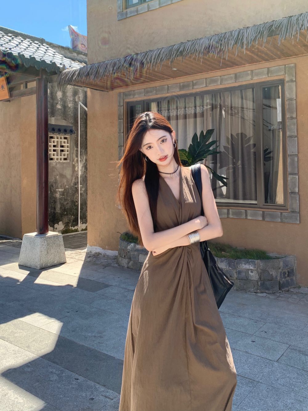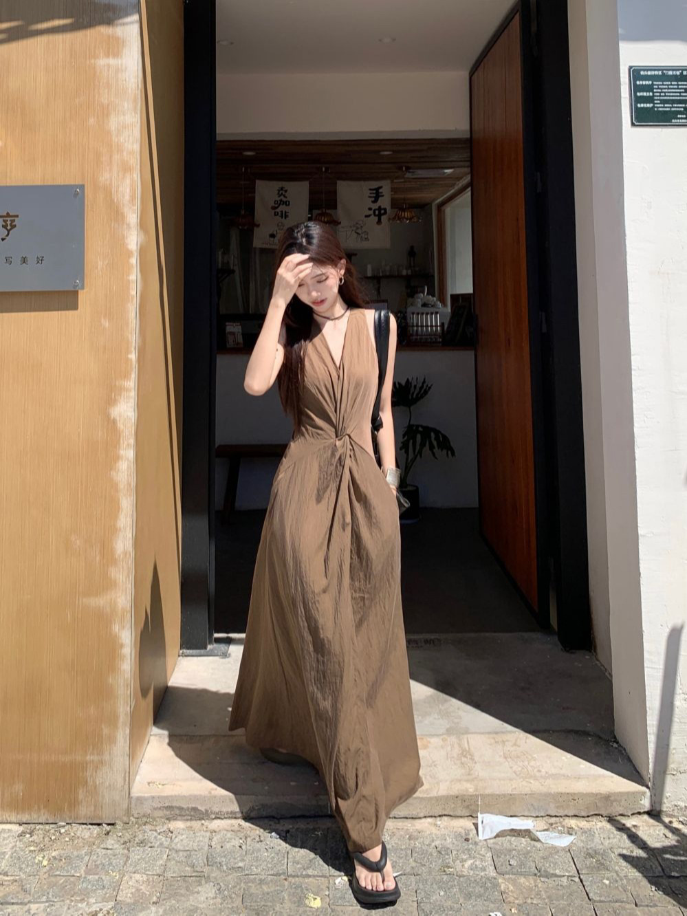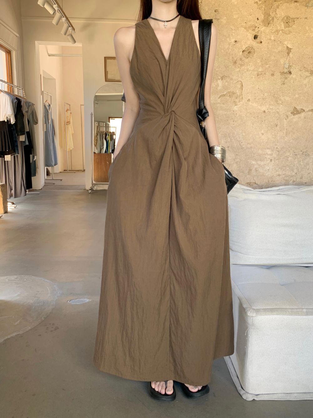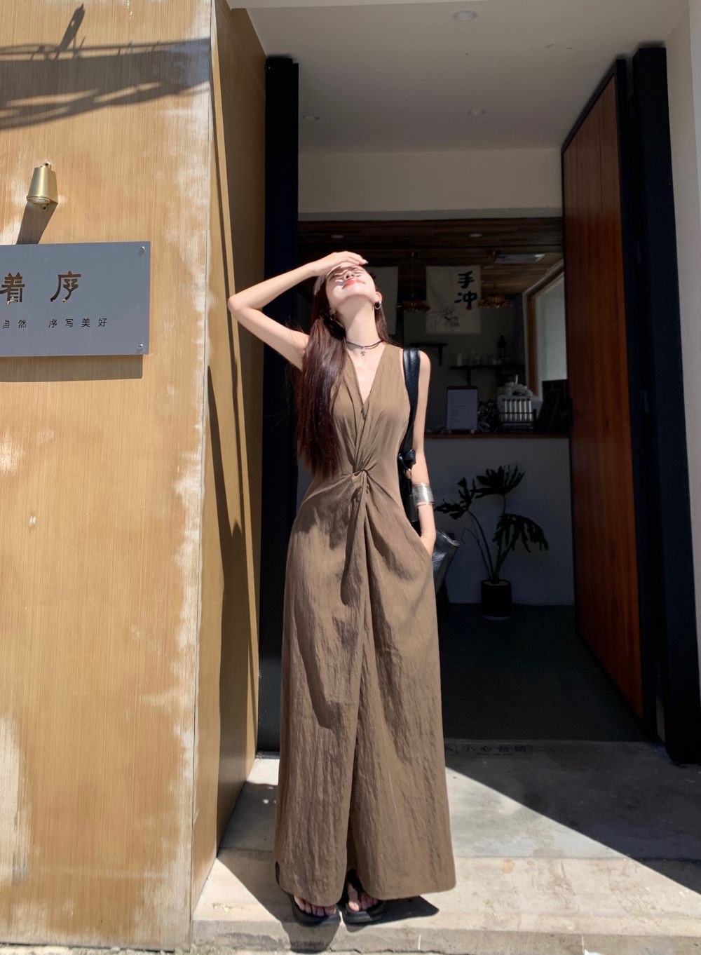 여성을위한 우아한 브라운 트위스트 민소매 조끼 드레스 여름 디자인 롱 스커트 v 넥 허리 슬리밍 a 라인 스커트