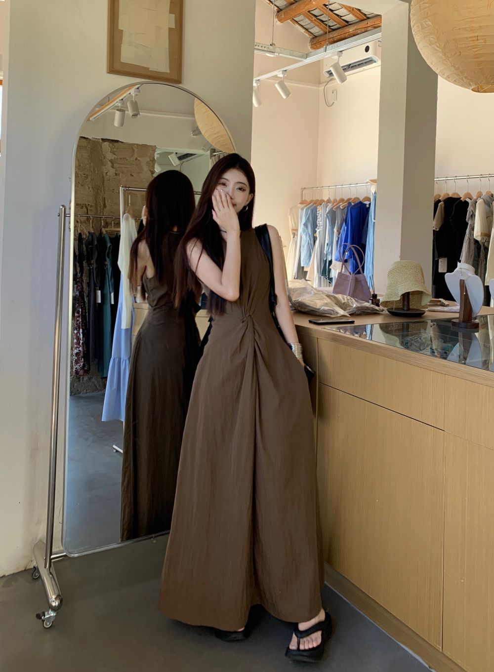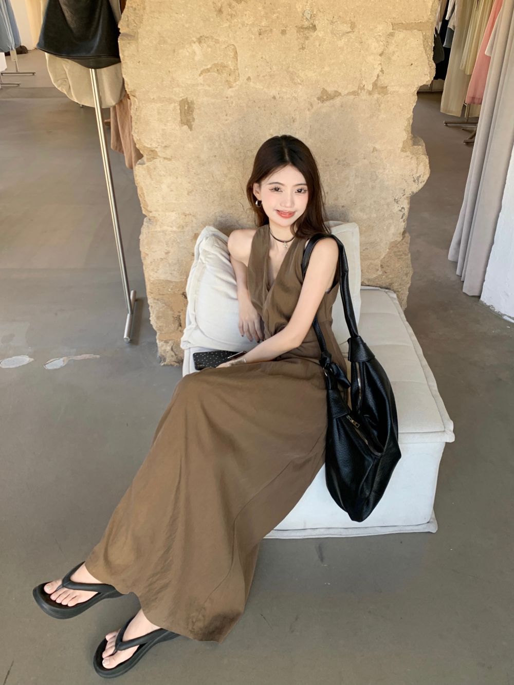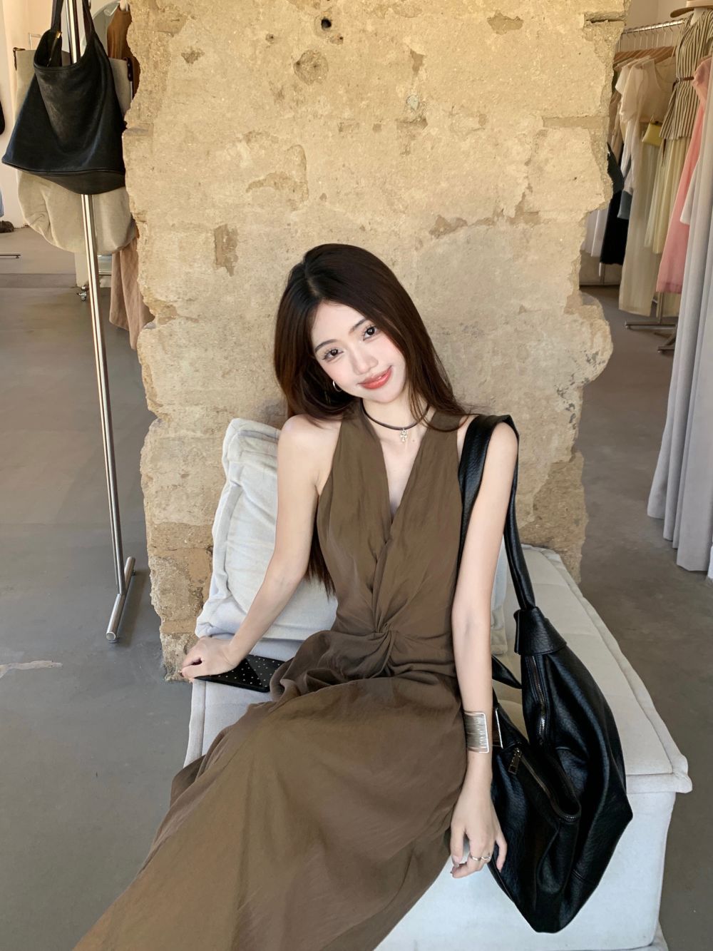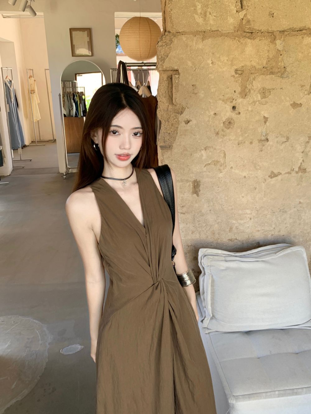 여성을위한 우아한 브라운 트위스트 민소매 조끼 드레스 여름 디자인 롱 스커트 v 넥 허리 슬리밍 a 라인 스커트