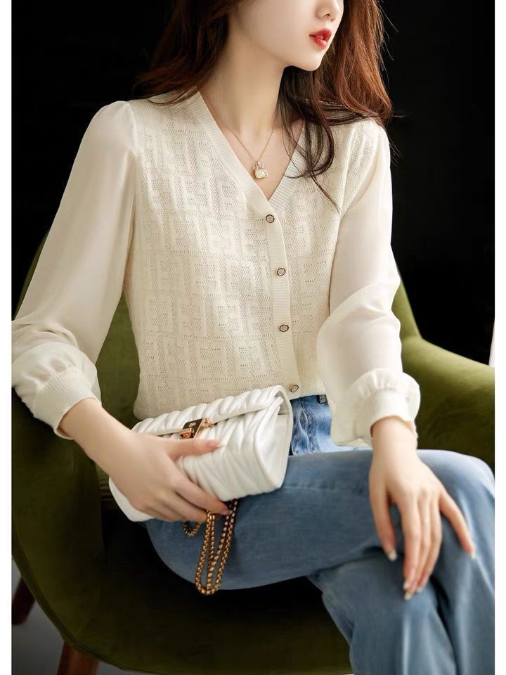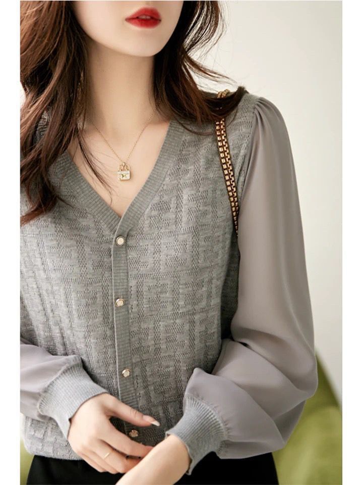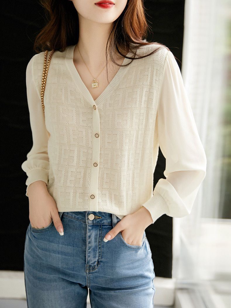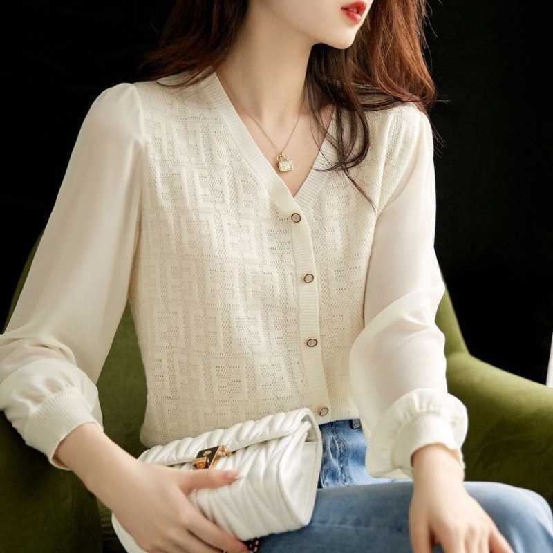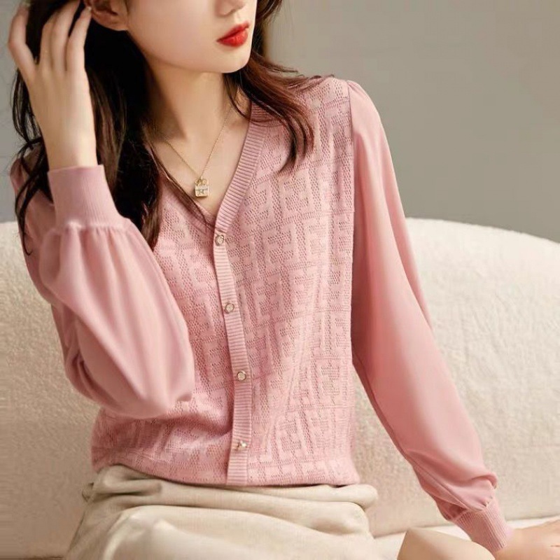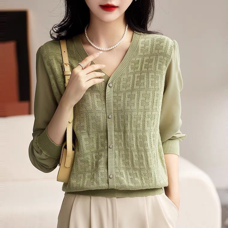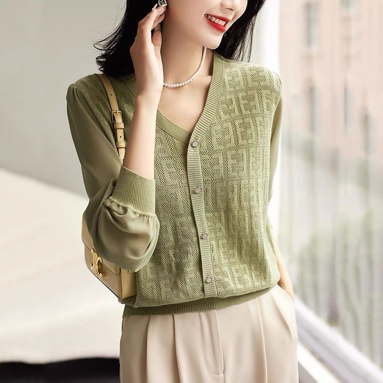 여성용 봄, 가을 얇은 중공 스웨터, 자카드 소매 스플라이싱 브이넥, 부드러운 기질, 유럽 스웨터 트렌드