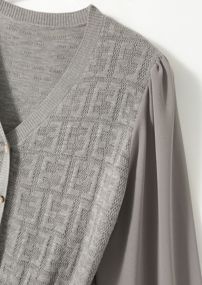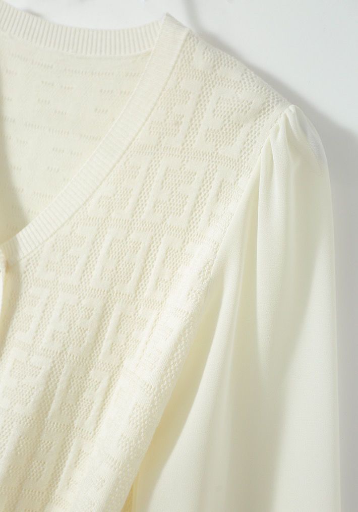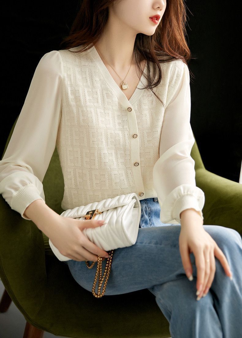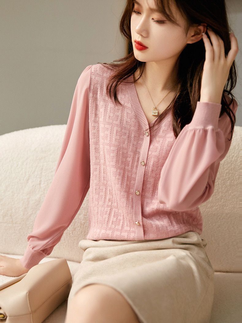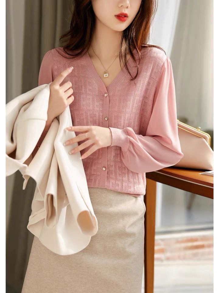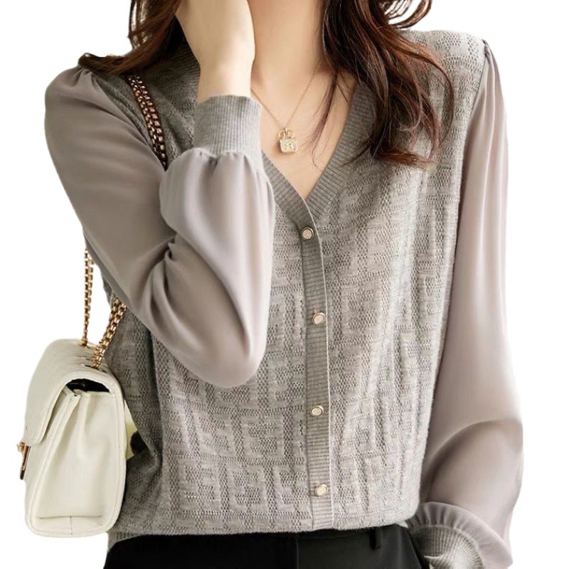 여성용 봄, 가을 얇은 중공 스웨터, 자카드 소매 스플라이싱 브이넥, 부드러운 기질, 유럽 스웨터 트렌드