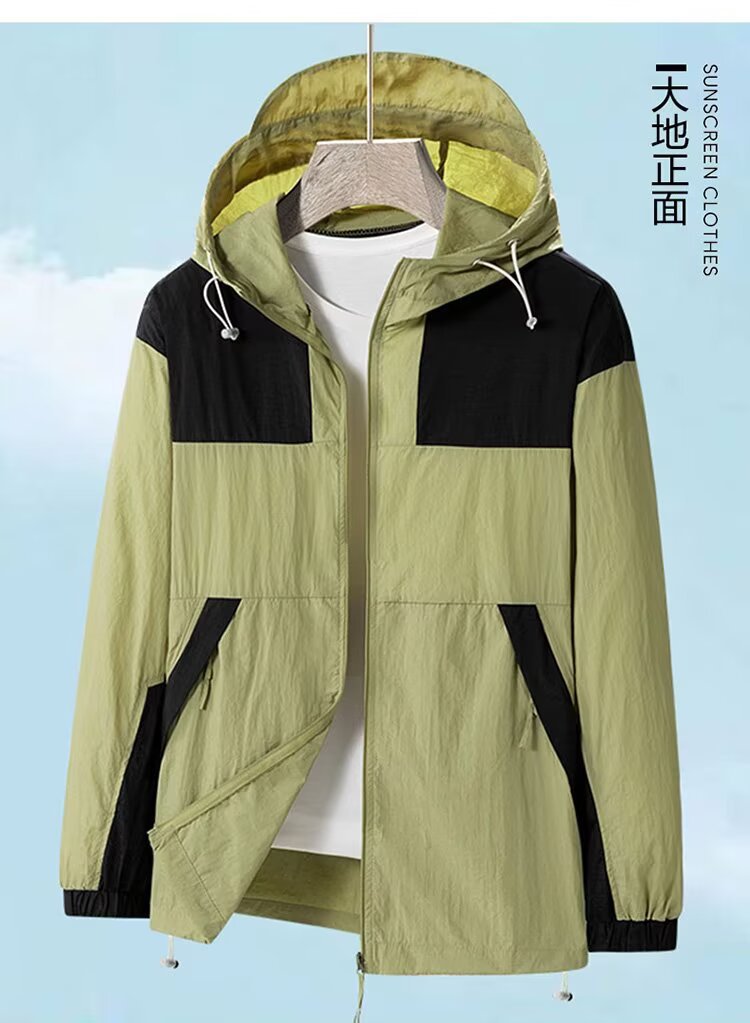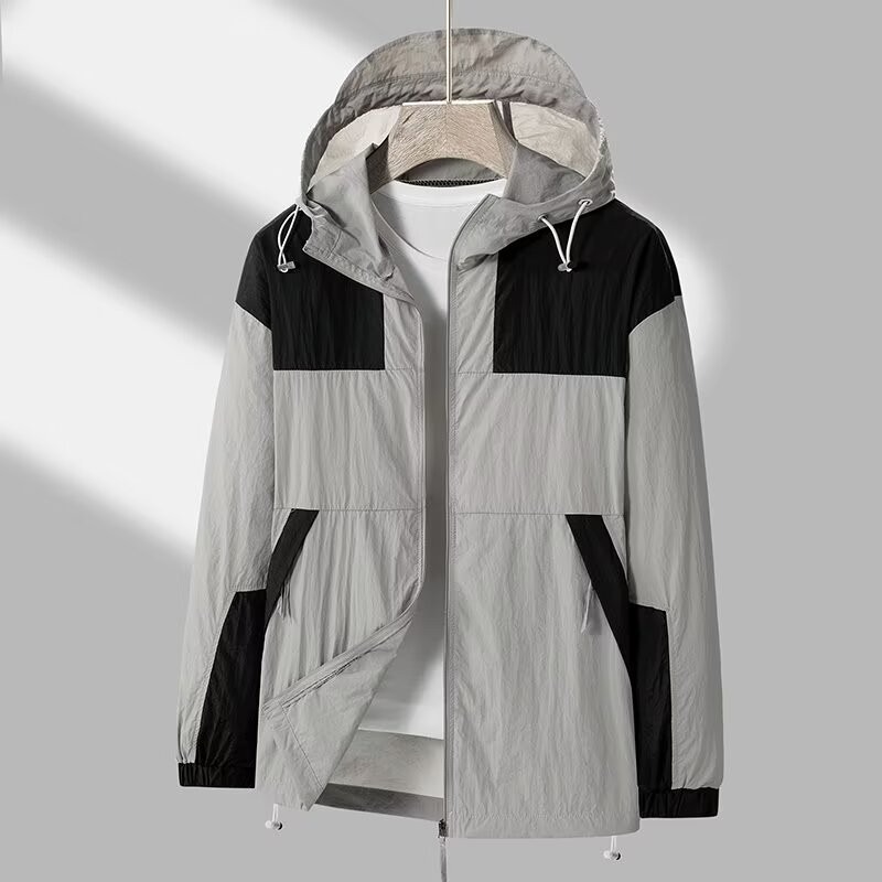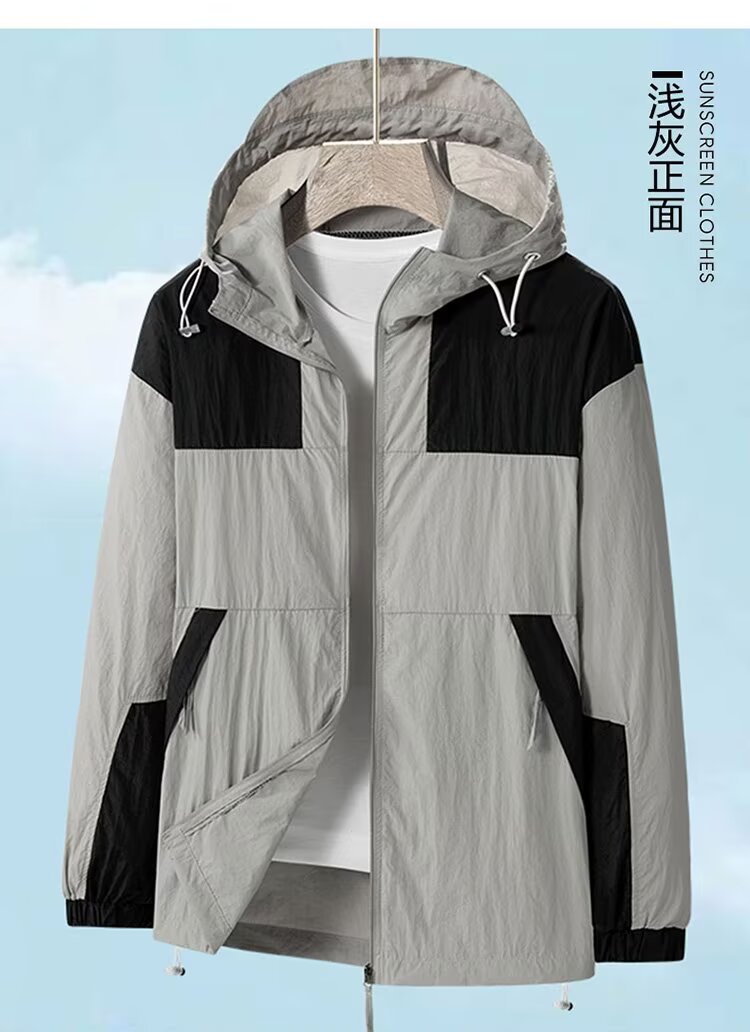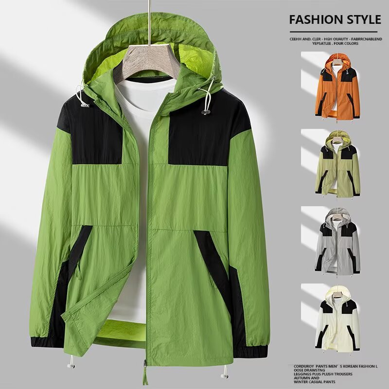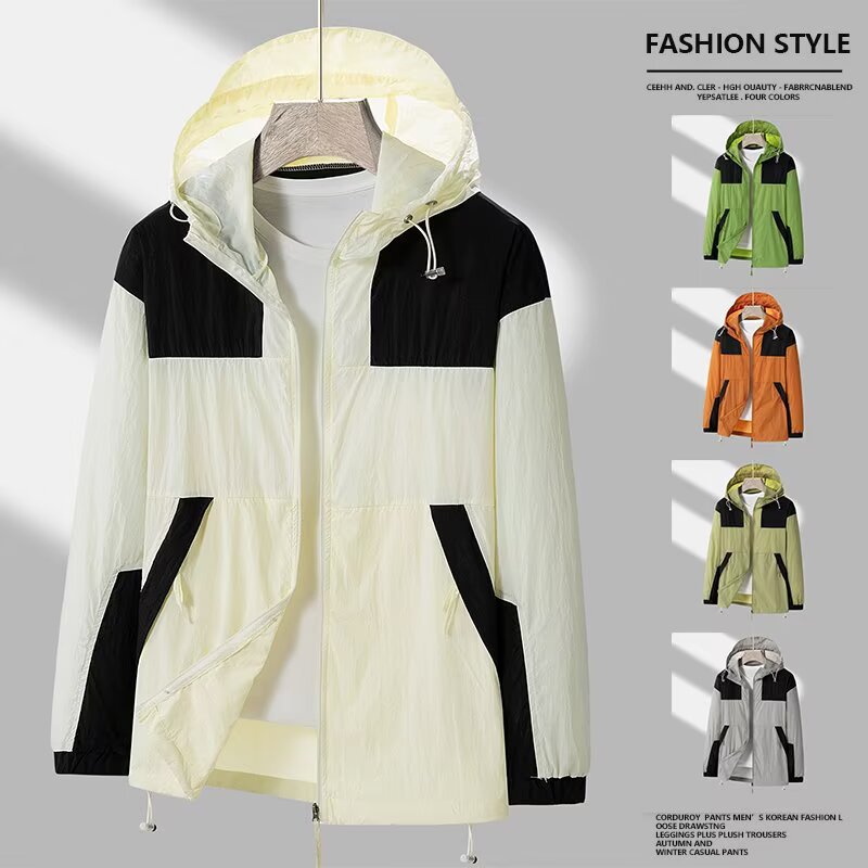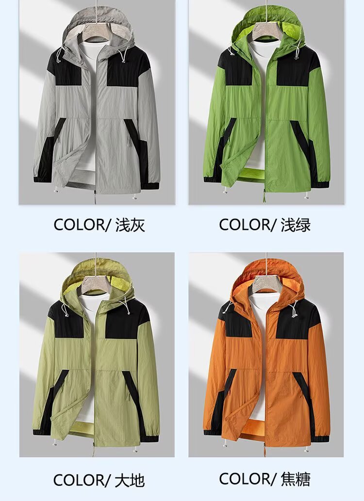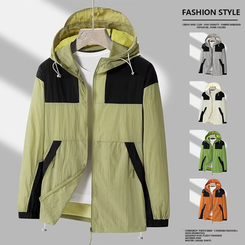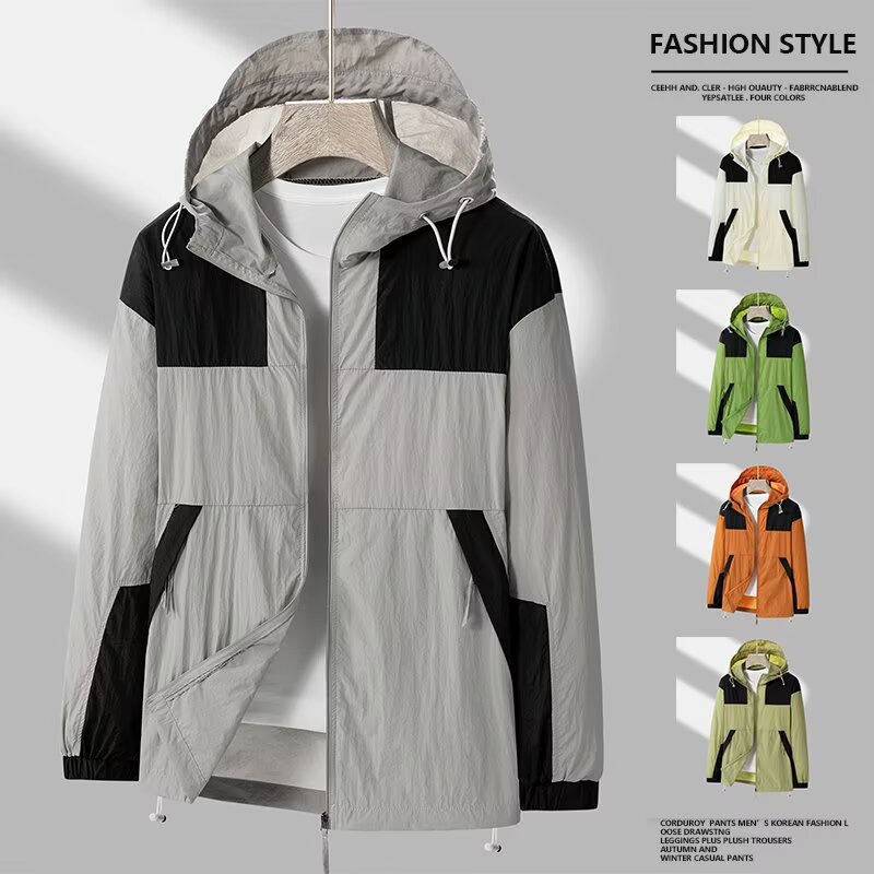 봄과 가을 새로운 남성 야외 유행 브랜드 지퍼 자켓 후드 작업복 윈드 브레이커 자켓 컬러 매칭 캐주얼 자외선 차단 의류