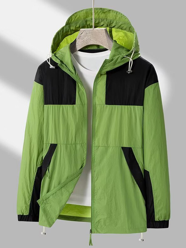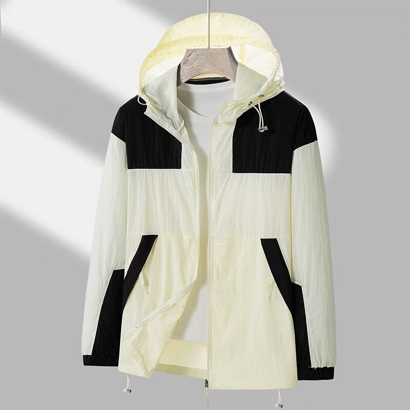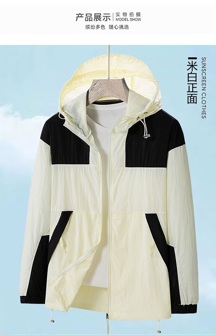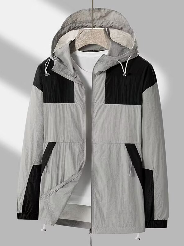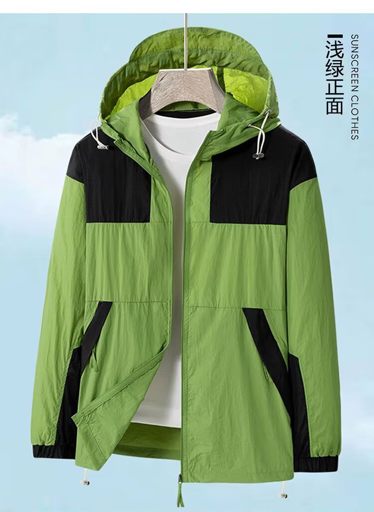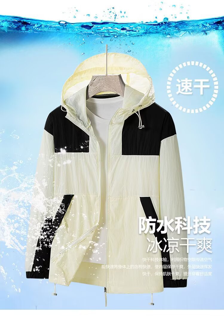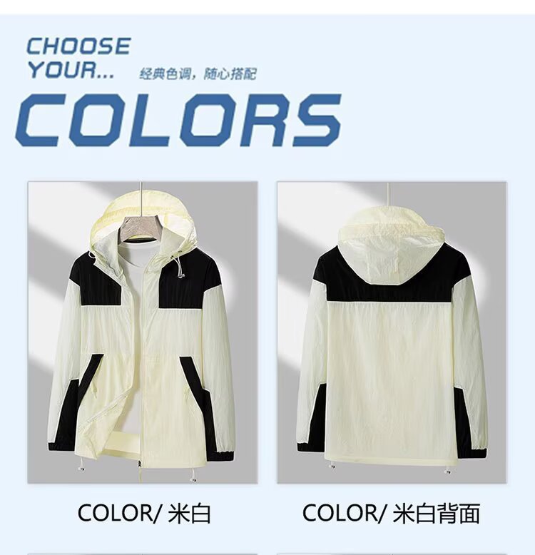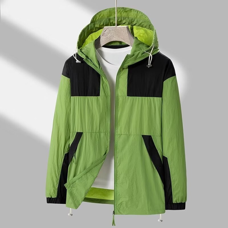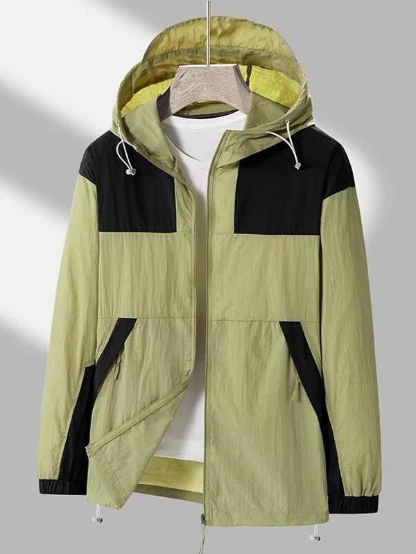 봄과 가을 새로운 남성 야외 유행 브랜드 지퍼 자켓 후드 작업복 윈드 브레이커 자켓 컬러 매칭 캐주얼 자외선 차단 의류