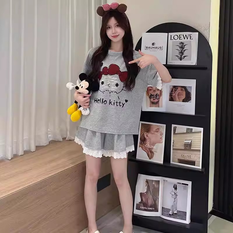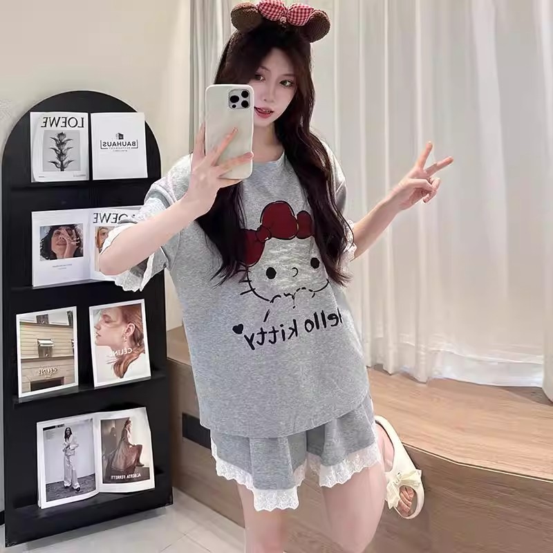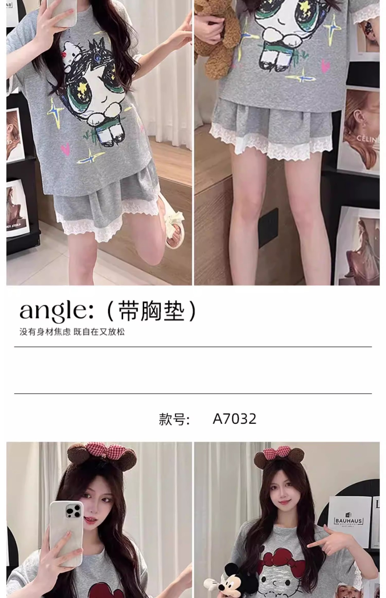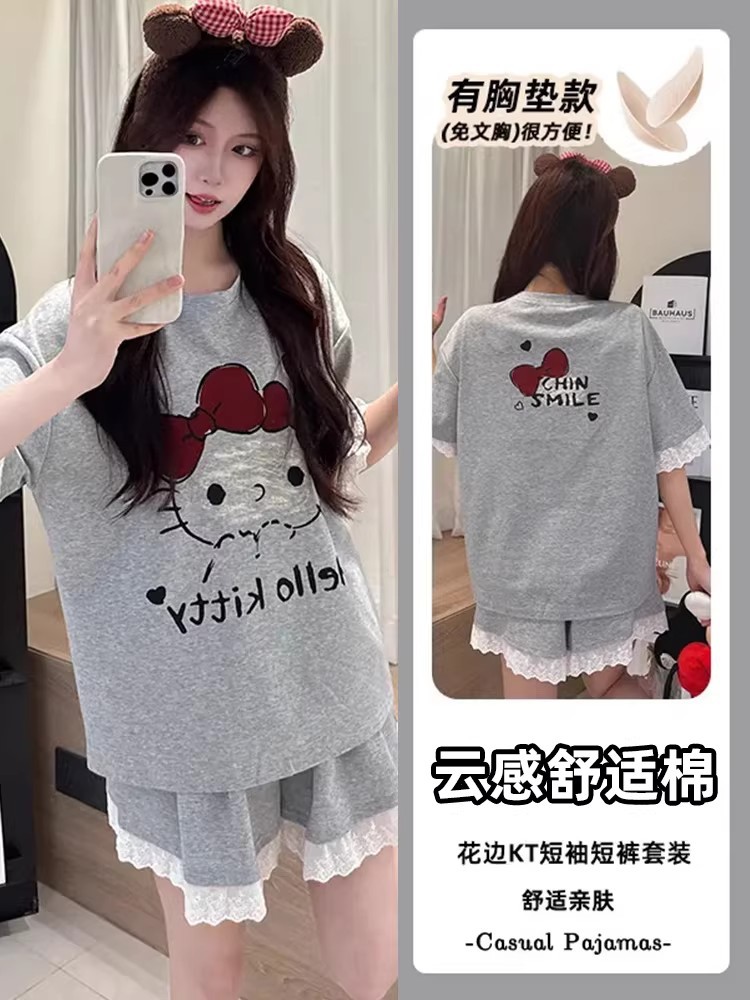여성용 여름 잠옷 2026 신상 레이스 레이스업 반팔 가슴 패드 포함 만화 KT 고양이 캐릭터 캐주얼 학생용 대형 사이즈 도매