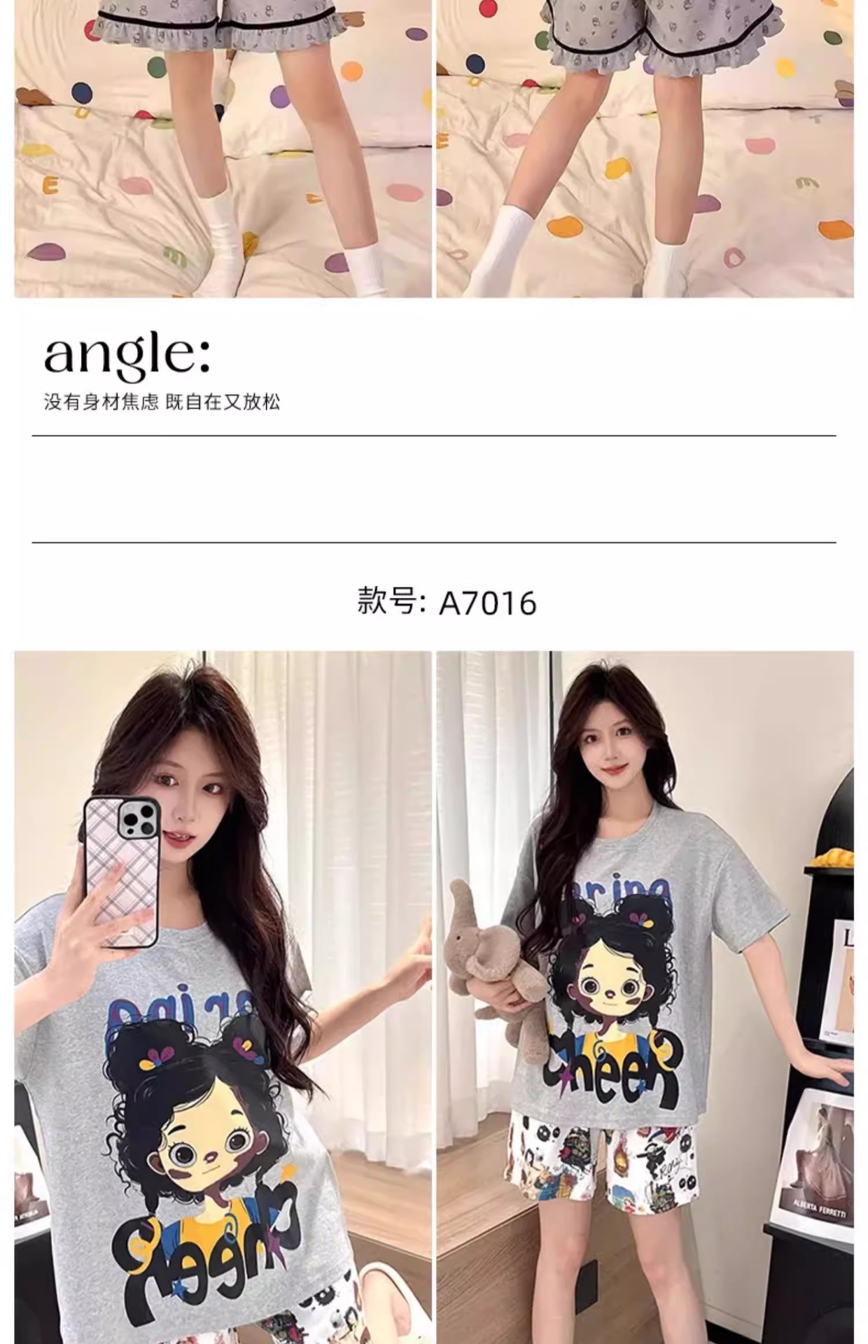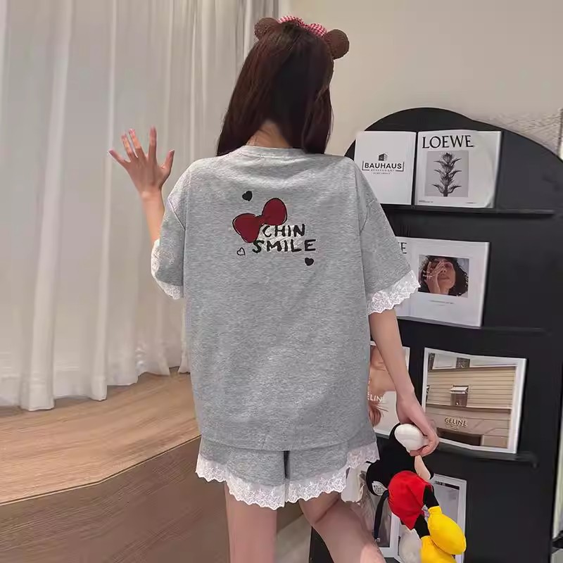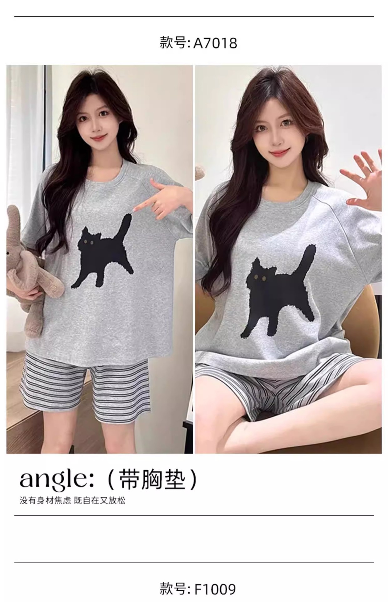 여성용 여름 잠옷 2026 신상 레이스 레이스업 반팔 가슴 패드 포함 만화 KT 고양이 캐릭터 캐주얼 학생용 대형 사이즈 도매