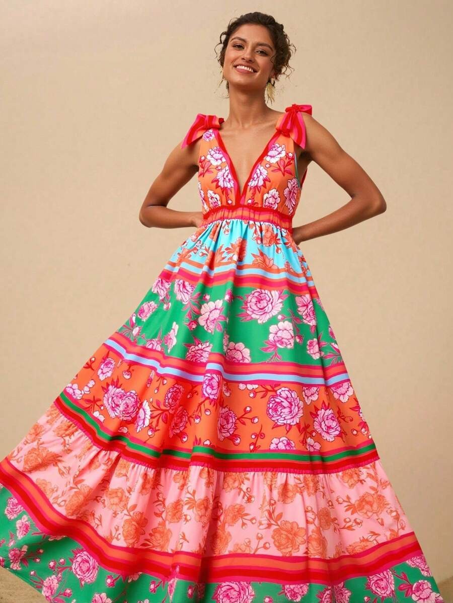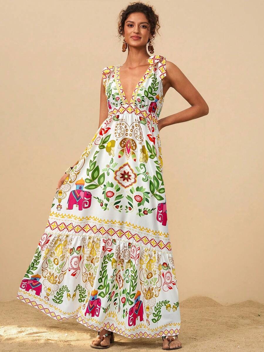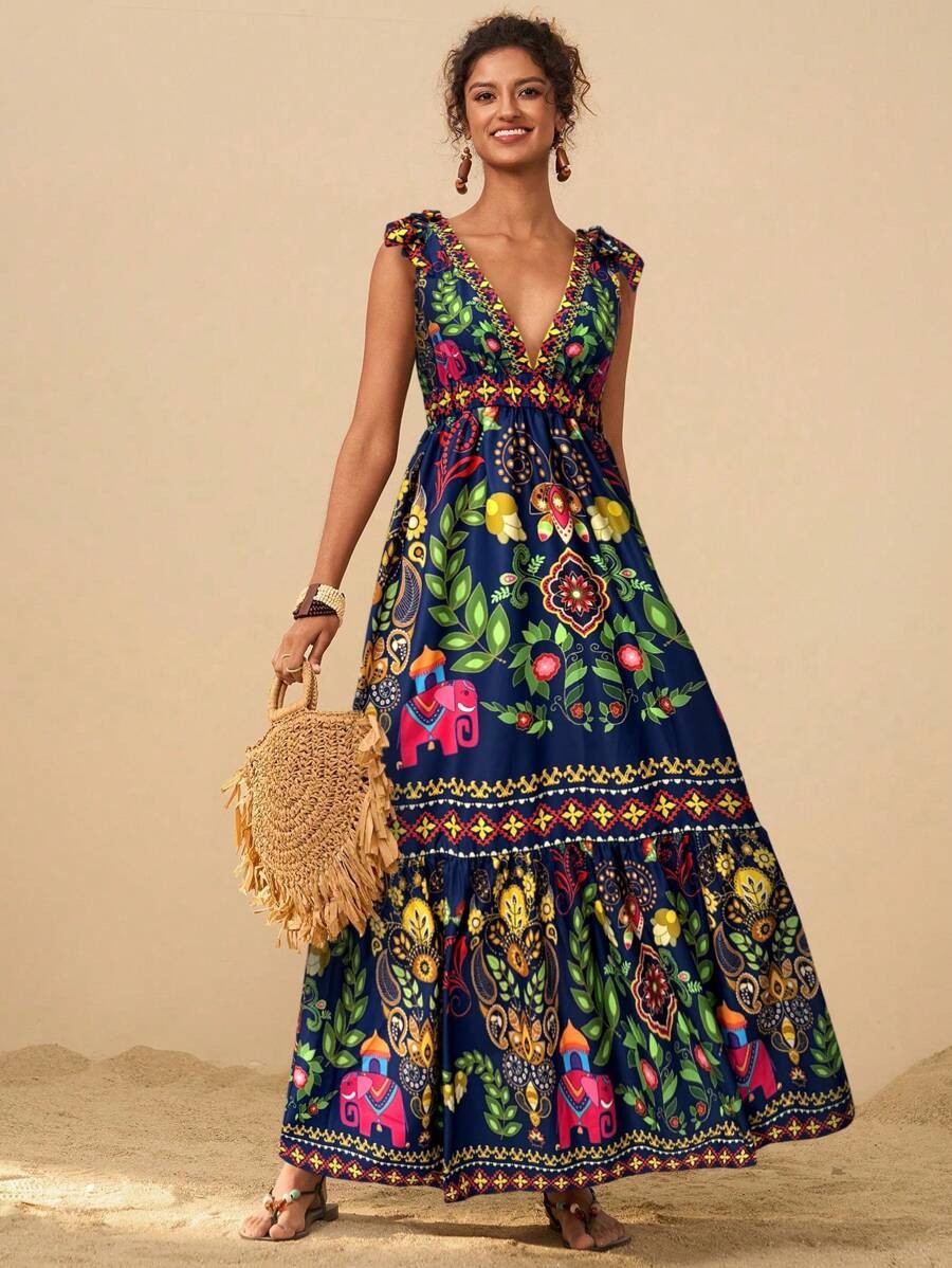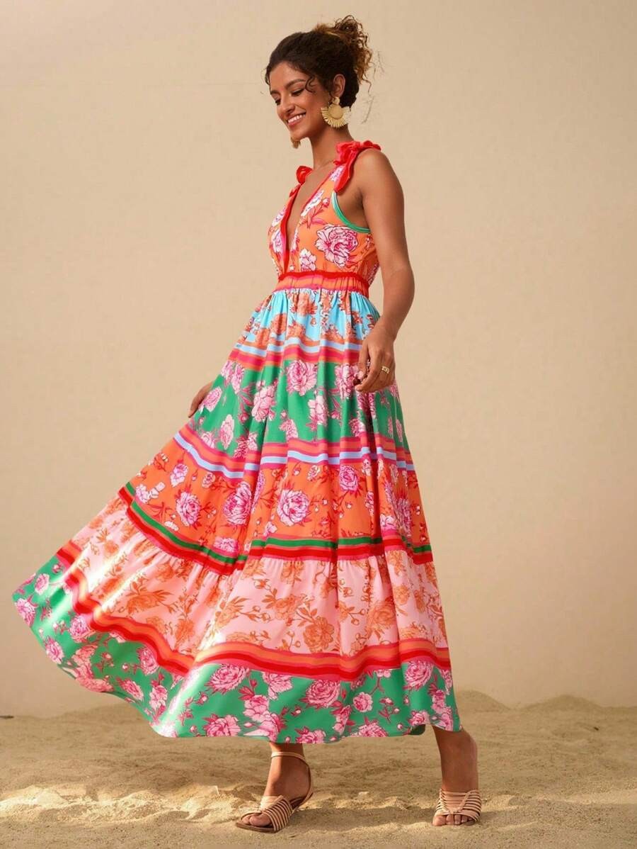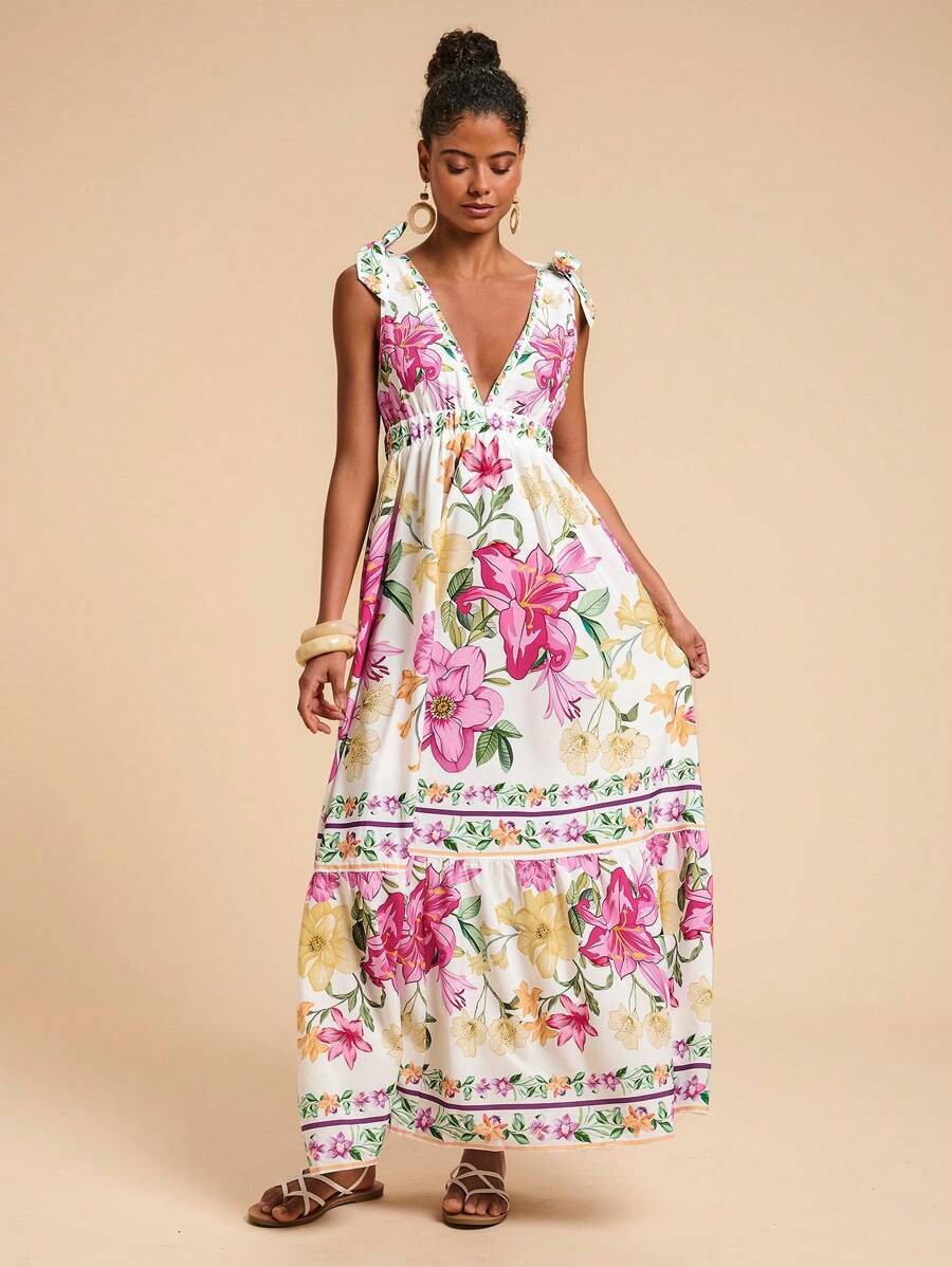2025 새로운 국경 유럽과 미국의 대외 무역 여성의 꽃 인쇄 깊은 V-목 긴 우아한 매력 해변 원피스