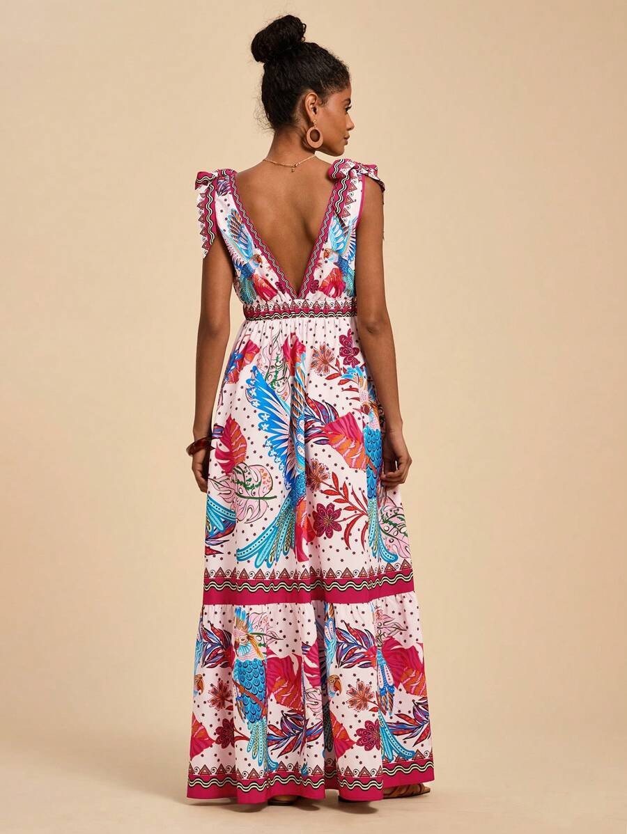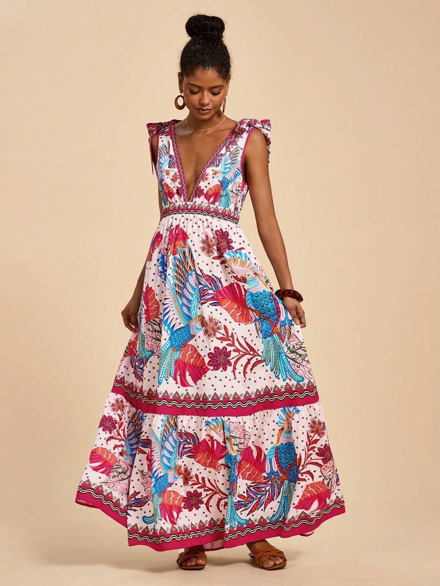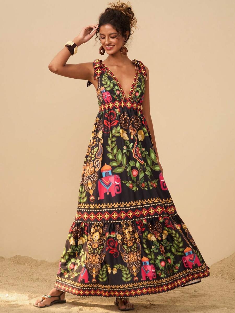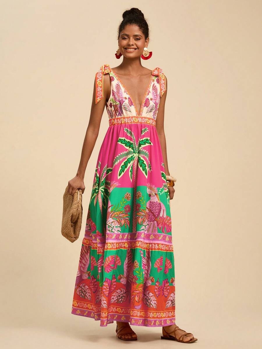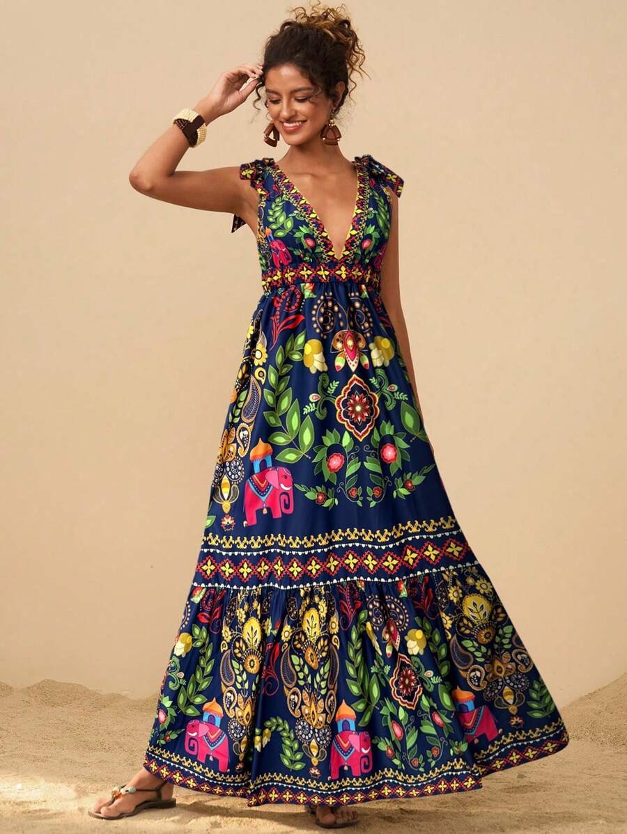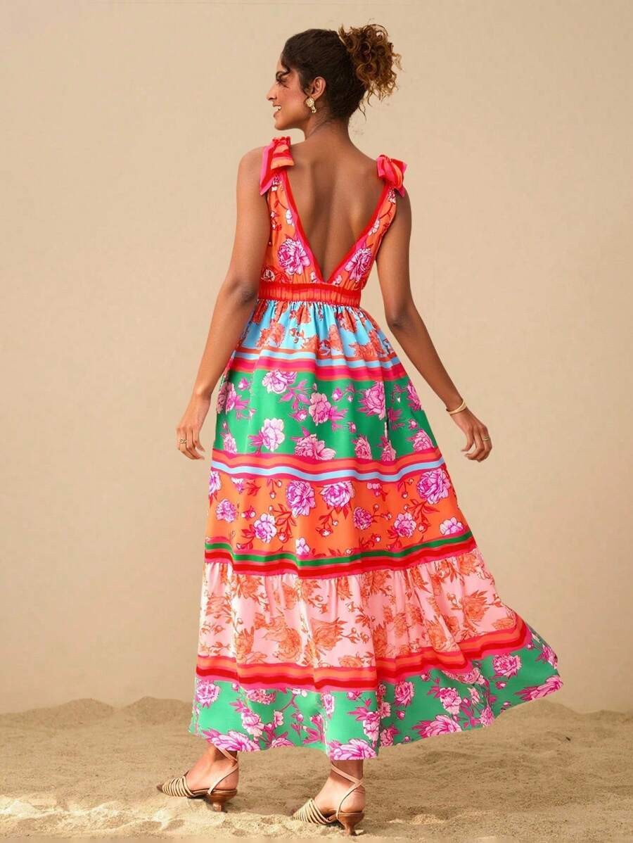 2025 새로운 국경 유럽과 미국의 대외 무역 여성의 꽃 인쇄 깊은 V-목 긴 우아한 매력 해변 원피스