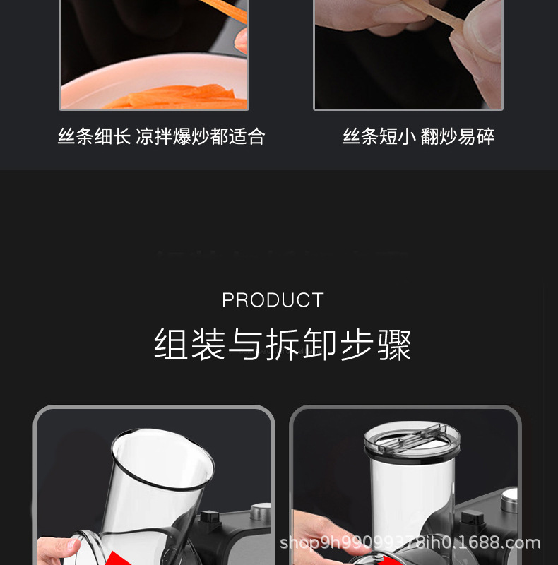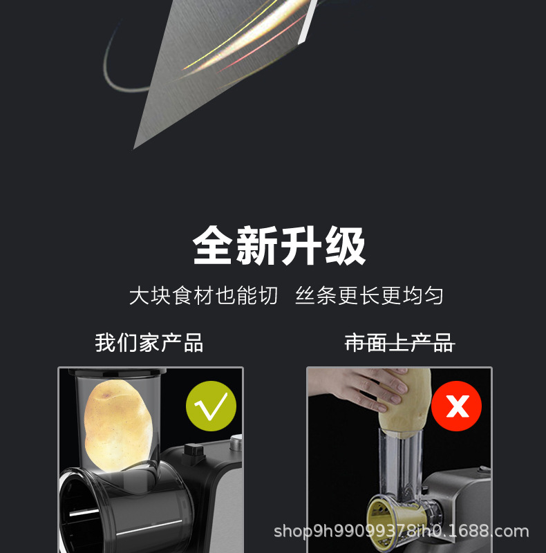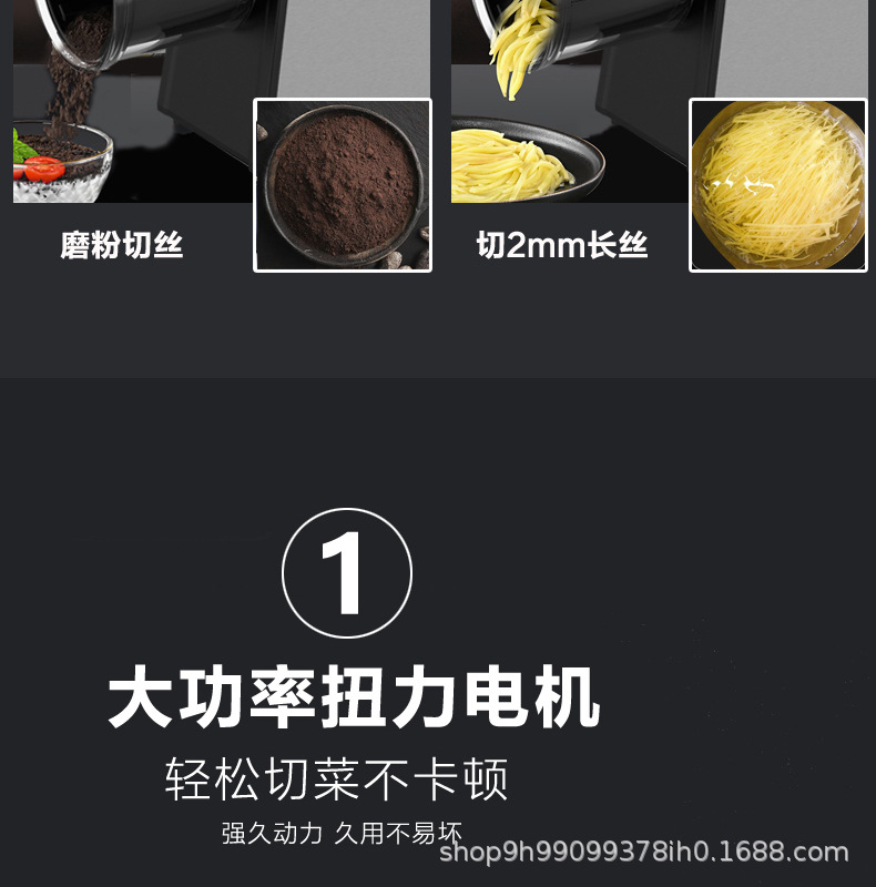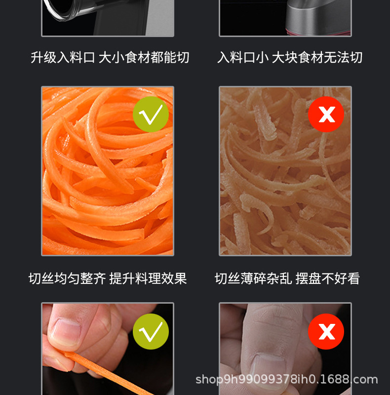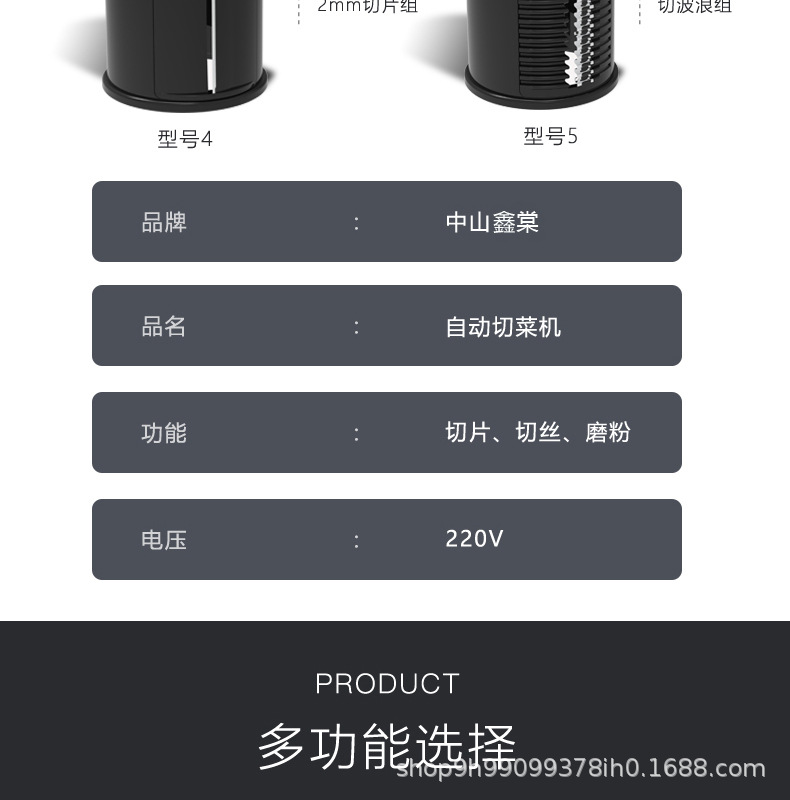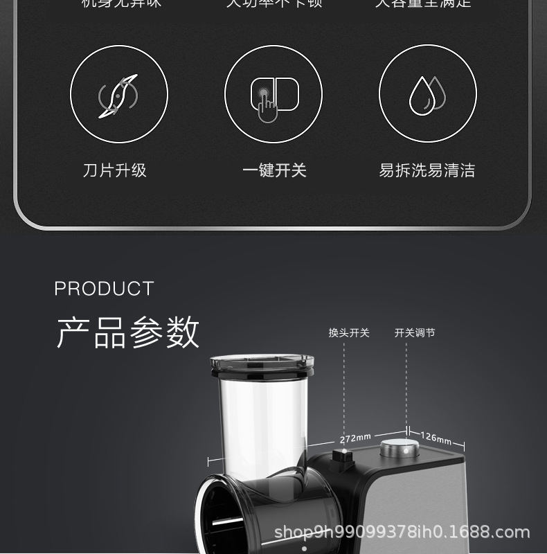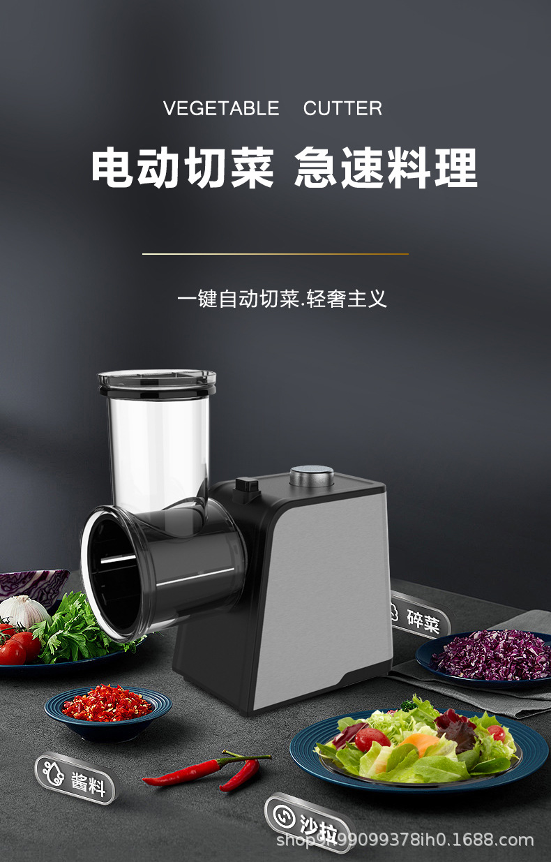 这是一款家用为主的多功能切菜机,能够快速实现切菜,不伤手,整机所有材质均通过 CE 认证,性能优越,放心采购!