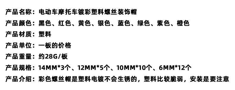오토바이 전기 자동차 수정 액세서리 장식 머리 나사 커버 나사 캡 엔진 플라스틱 나사 세트