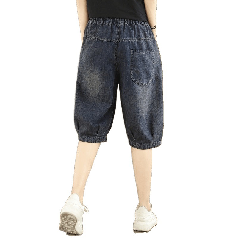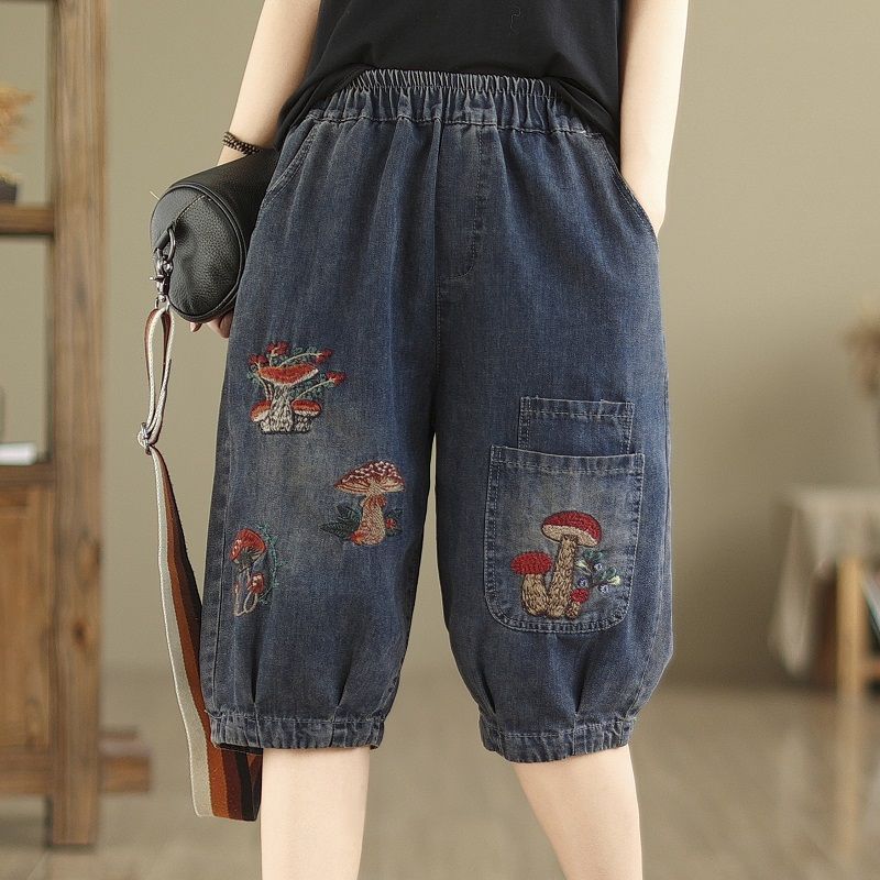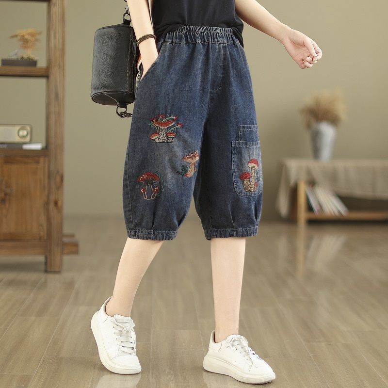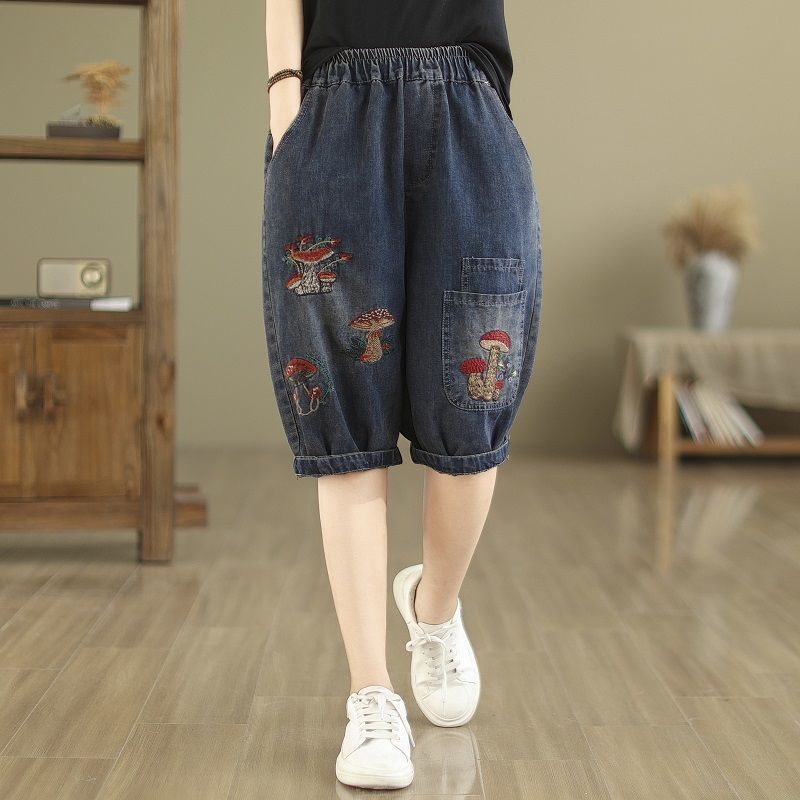 빈티지 청바지 여성 만화 버섯 플러스 사이즈 6 점 바지 여름 새로운 루즈 루즈 마구 허리 5 점 바지