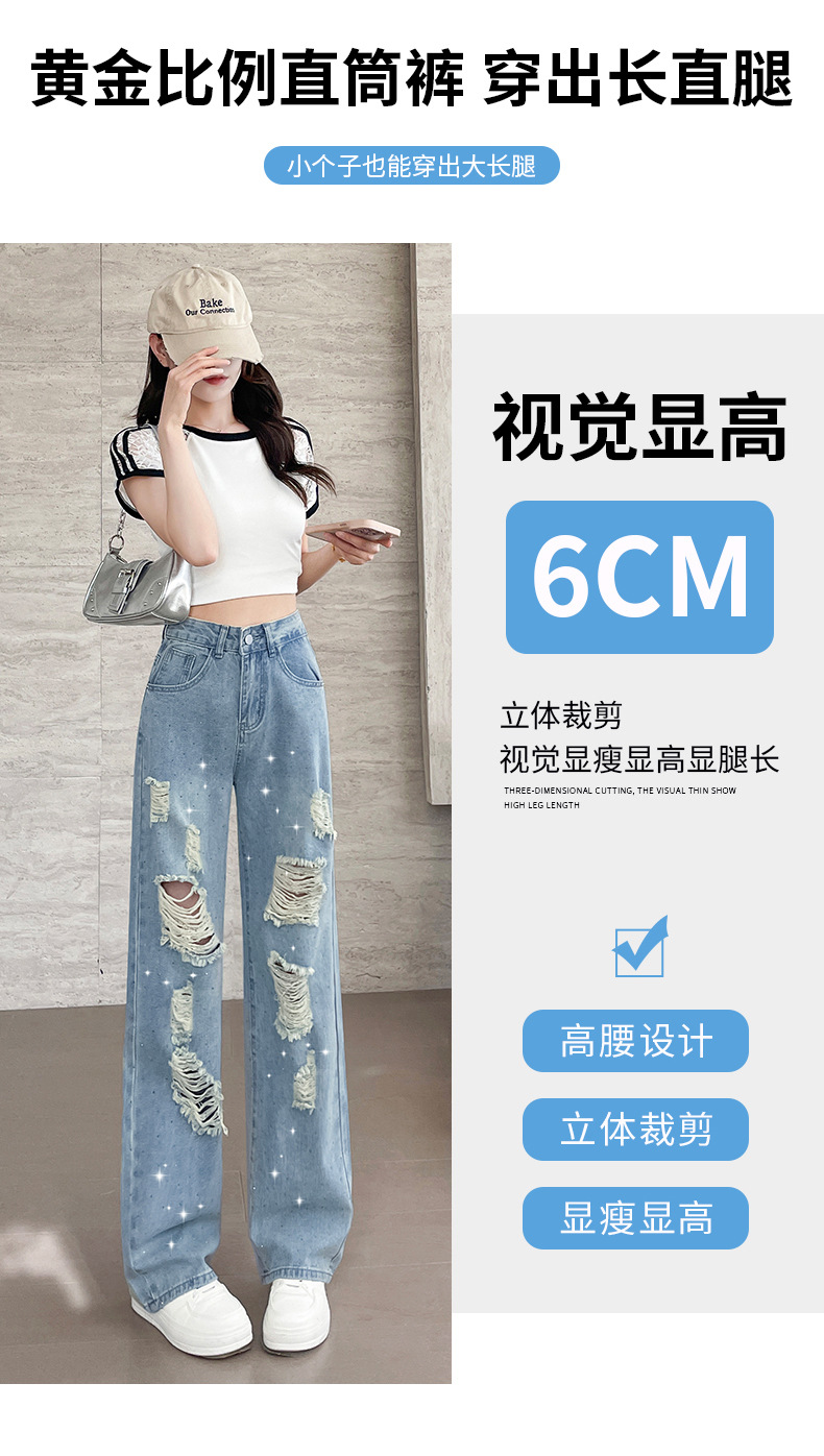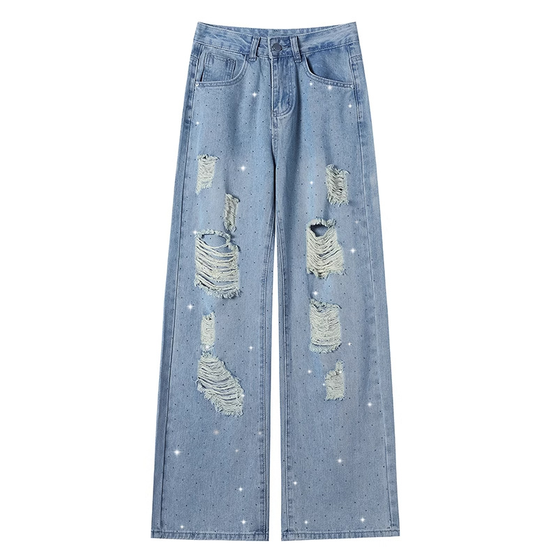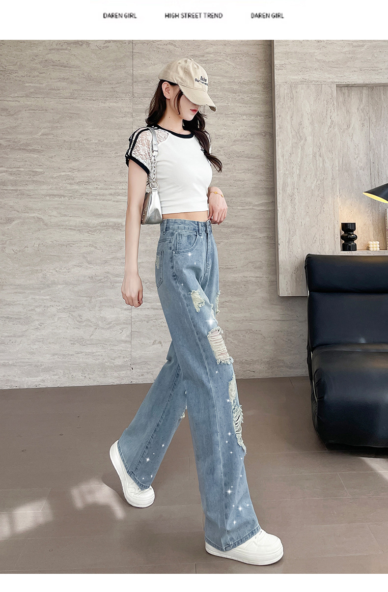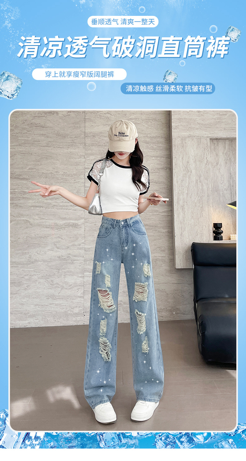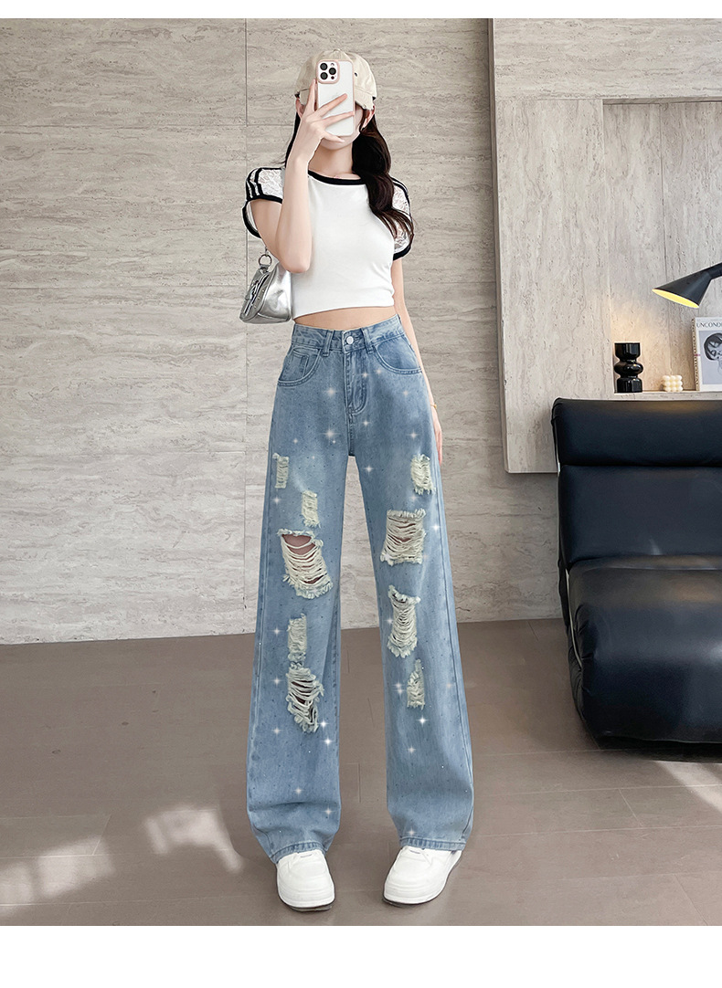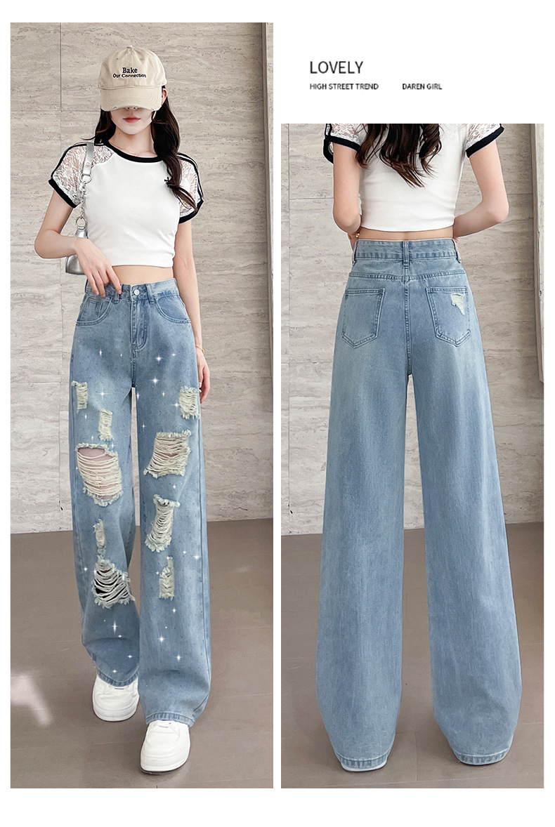 여름 얇은 여성용 찢어진 핫 다이아몬드 와이드 레그 청바지 2025 새로운 트렌디 슈퍼 핫 패셔너블 스트레이트 팬츠 여성용