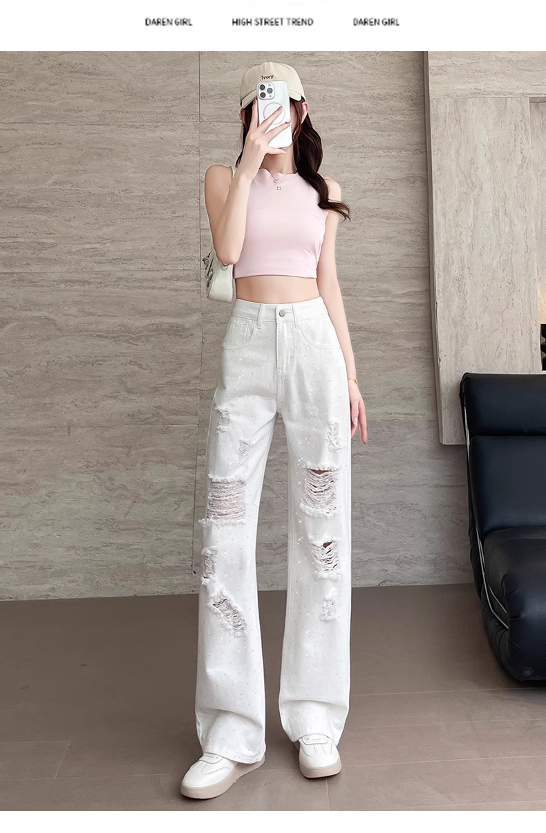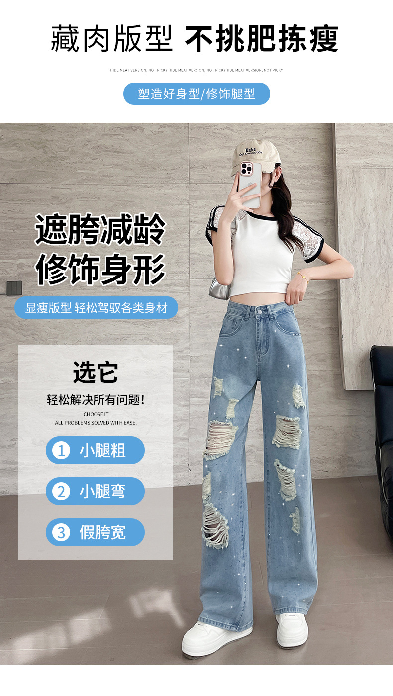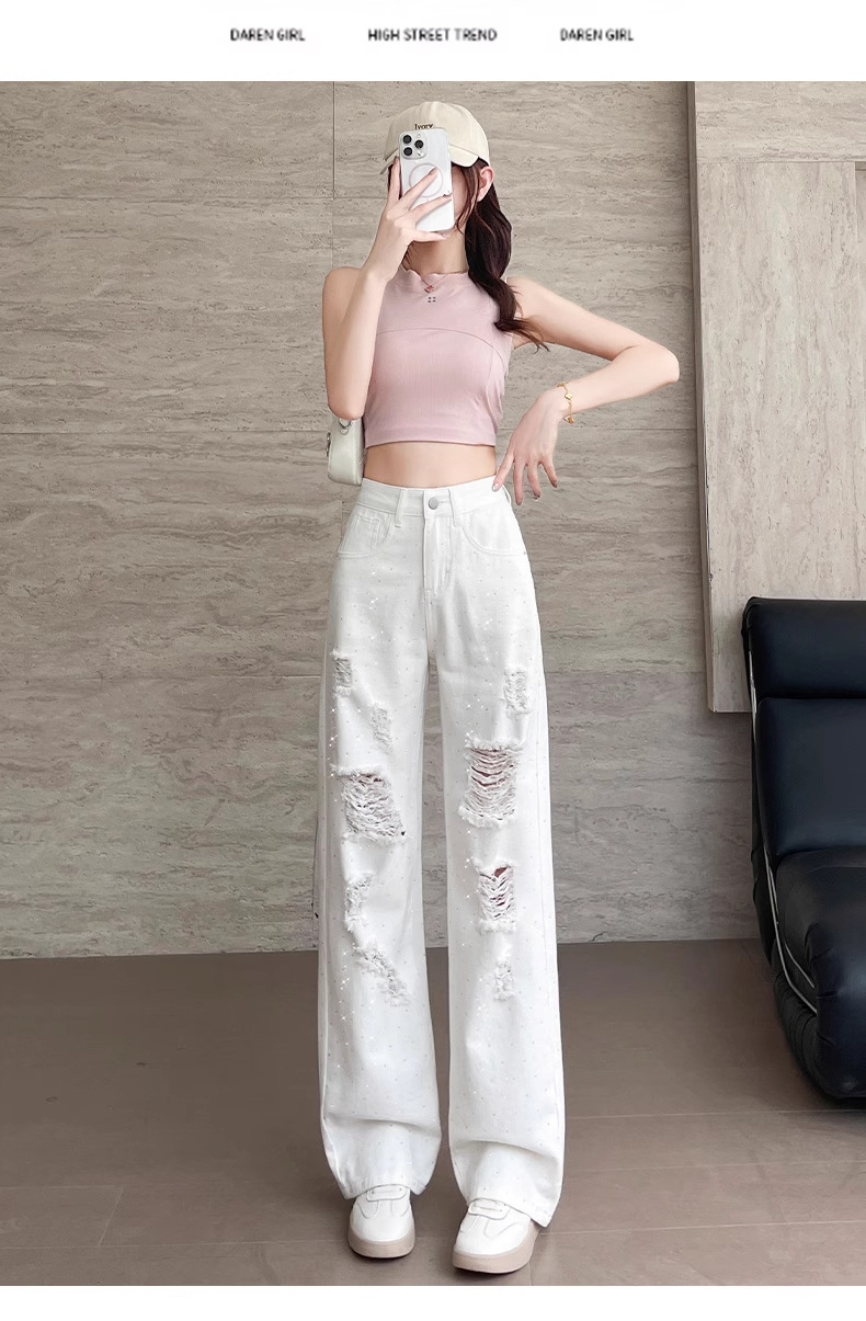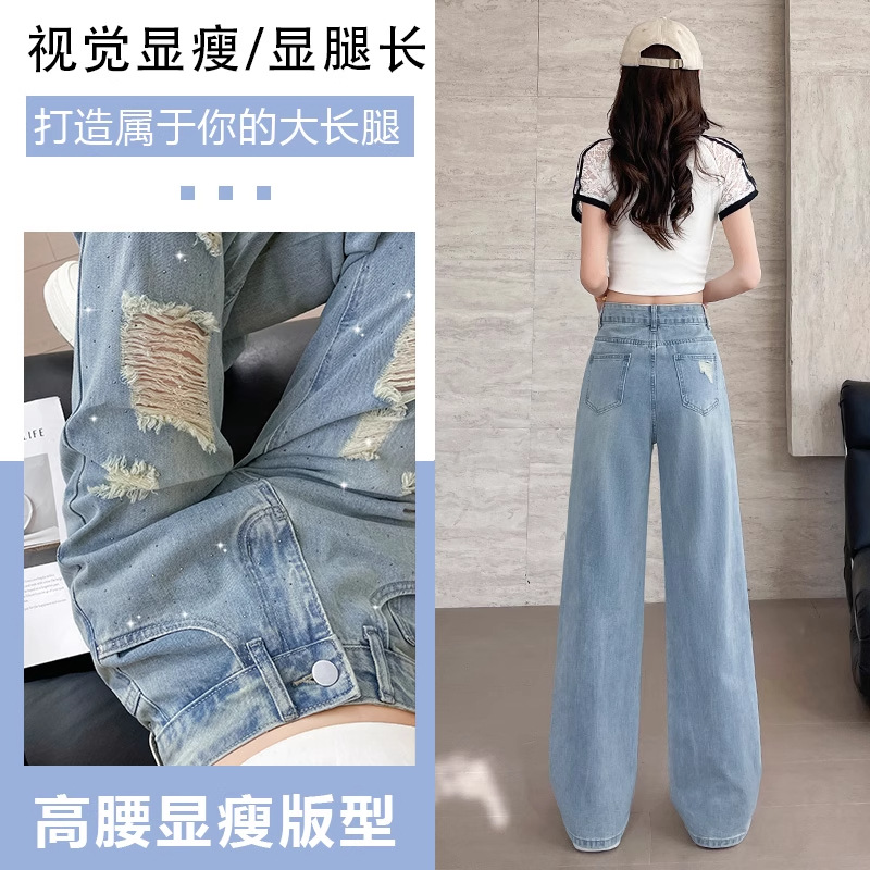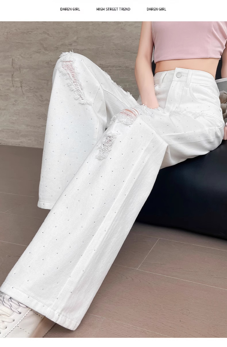 여름 얇은 여성용 찢어진 핫 다이아몬드 와이드 레그 청바지 2025 새로운 트렌디 슈퍼 핫 패셔너블 스트레이트 팬츠 여성용