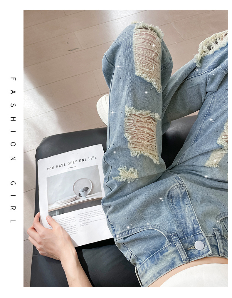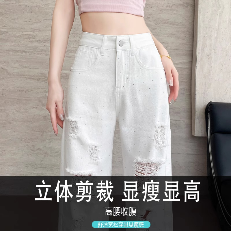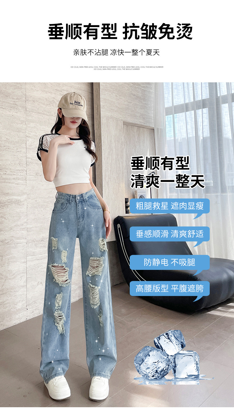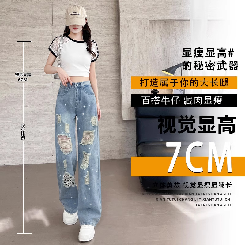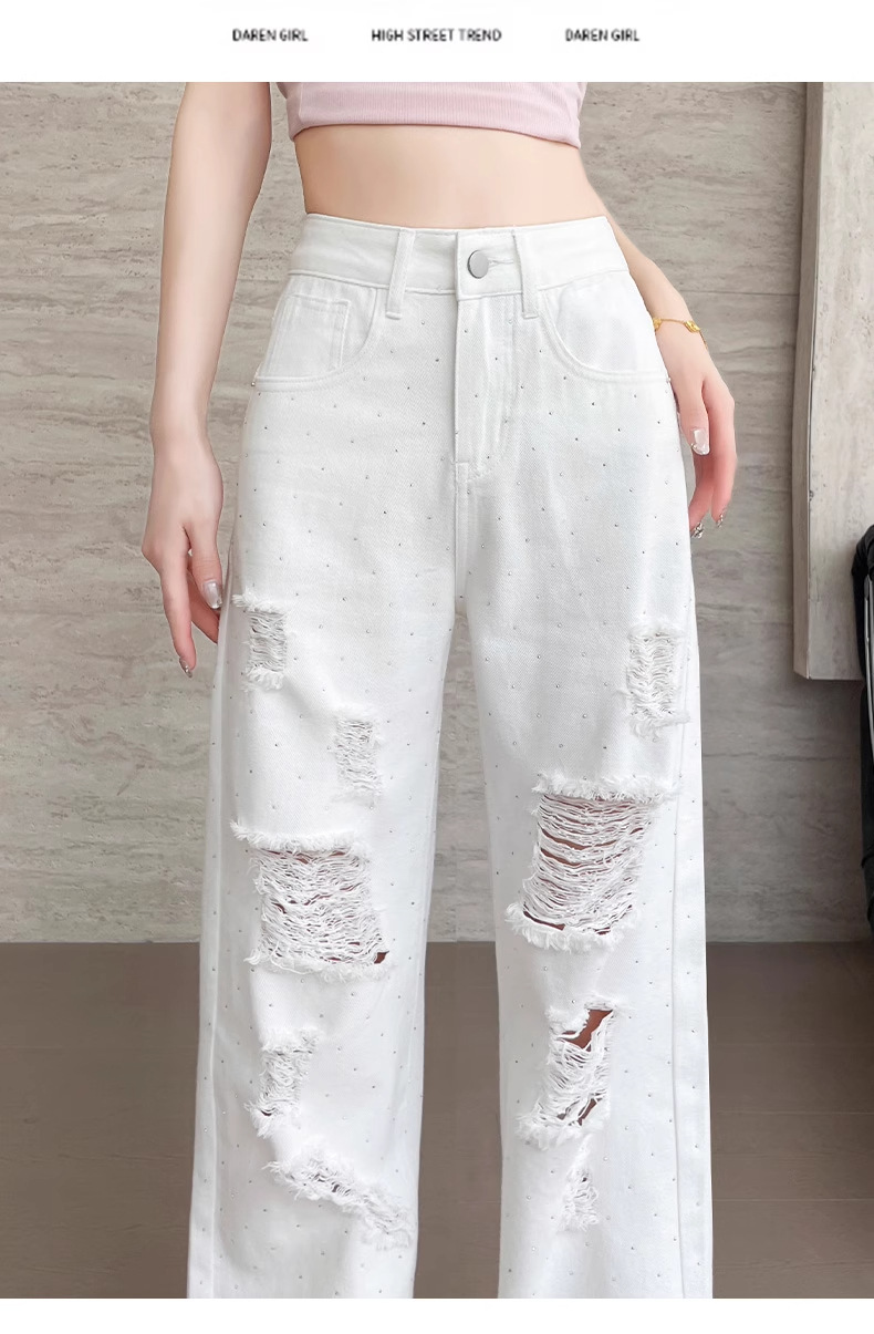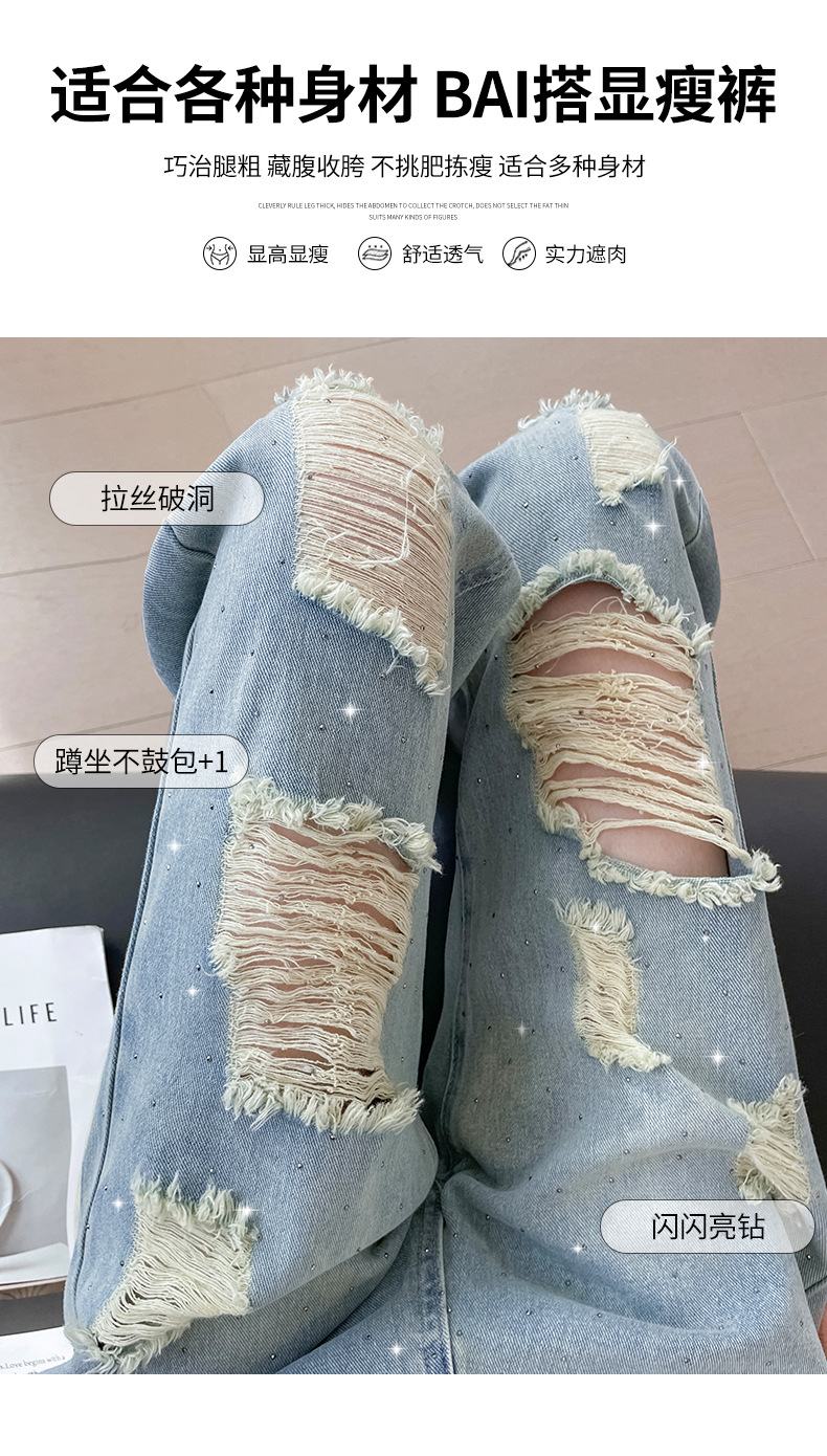 여름 얇은 여성용 찢어진 핫 다이아몬드 와이드 레그 청바지 2025 새로운 트렌디 슈퍼 핫 패셔너블 스트레이트 팬츠 여성용