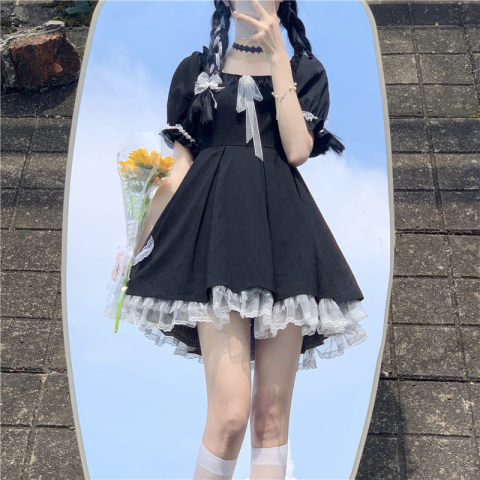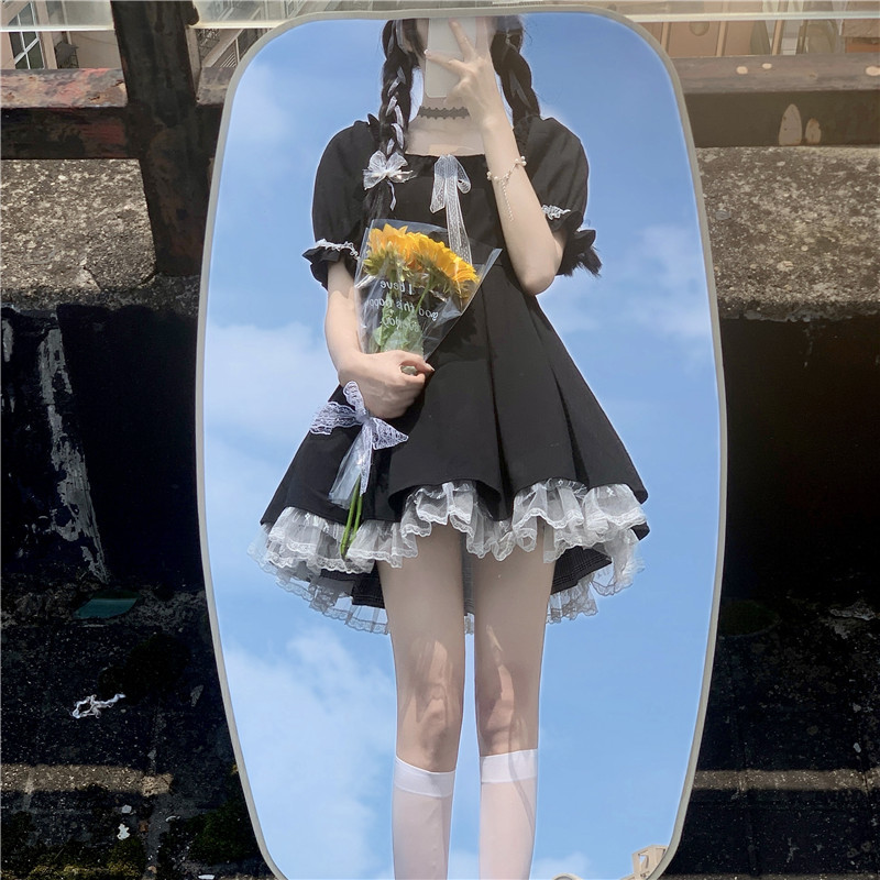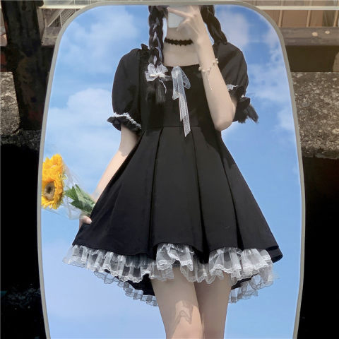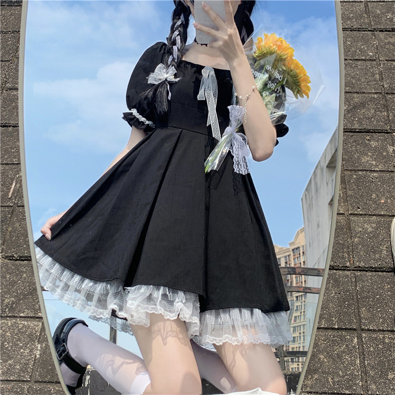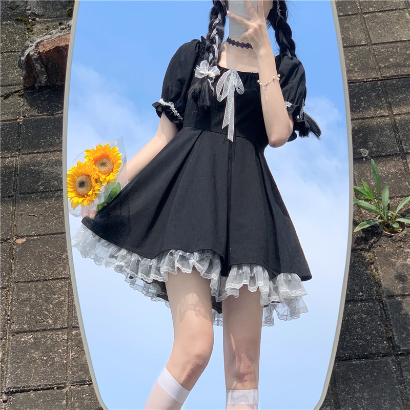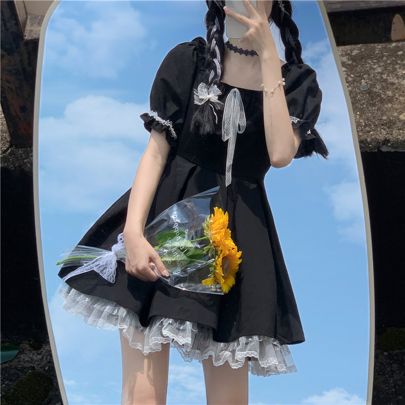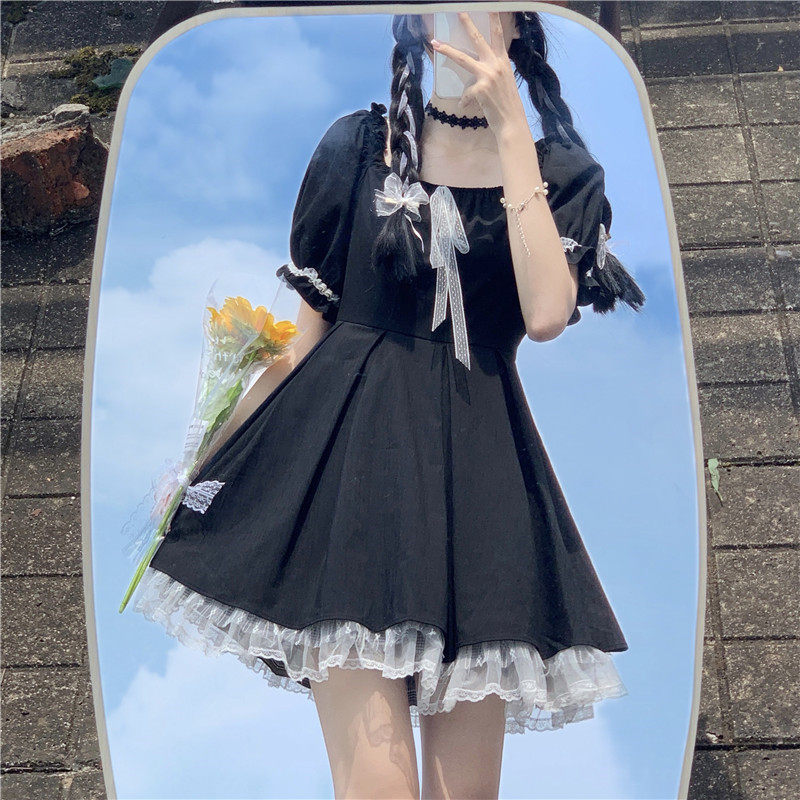 여성을위한 프랑스 햅번 스타일 리틀 블랙 드레스 2025 여름 새로운 레이스 스플 라이스 드레스 레이스 업 짧은 스커트