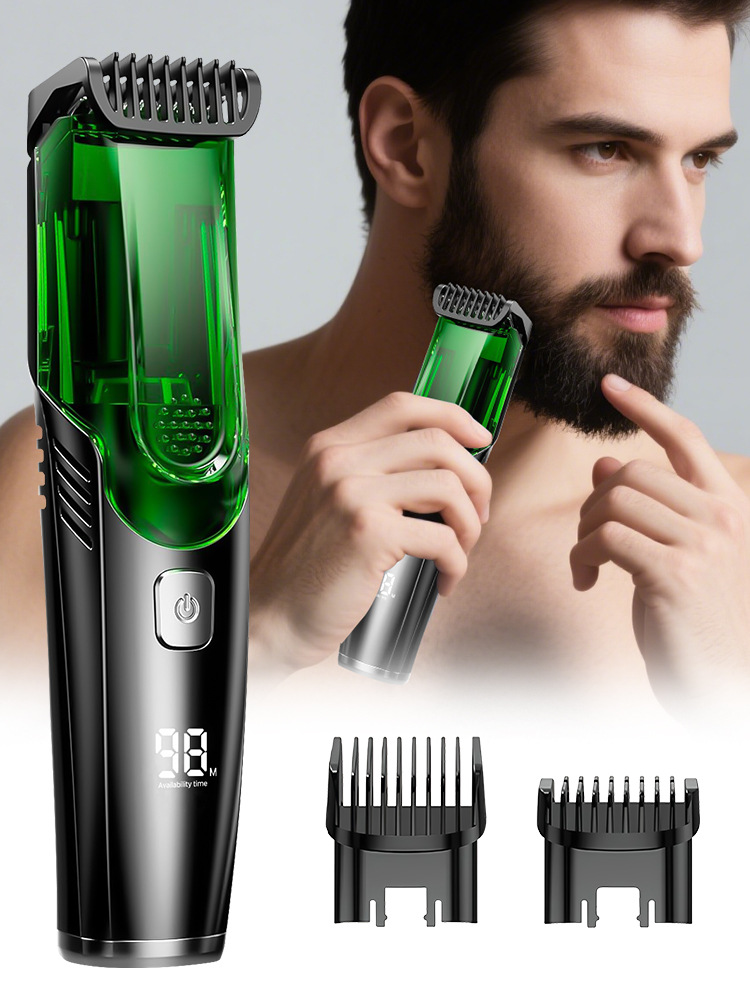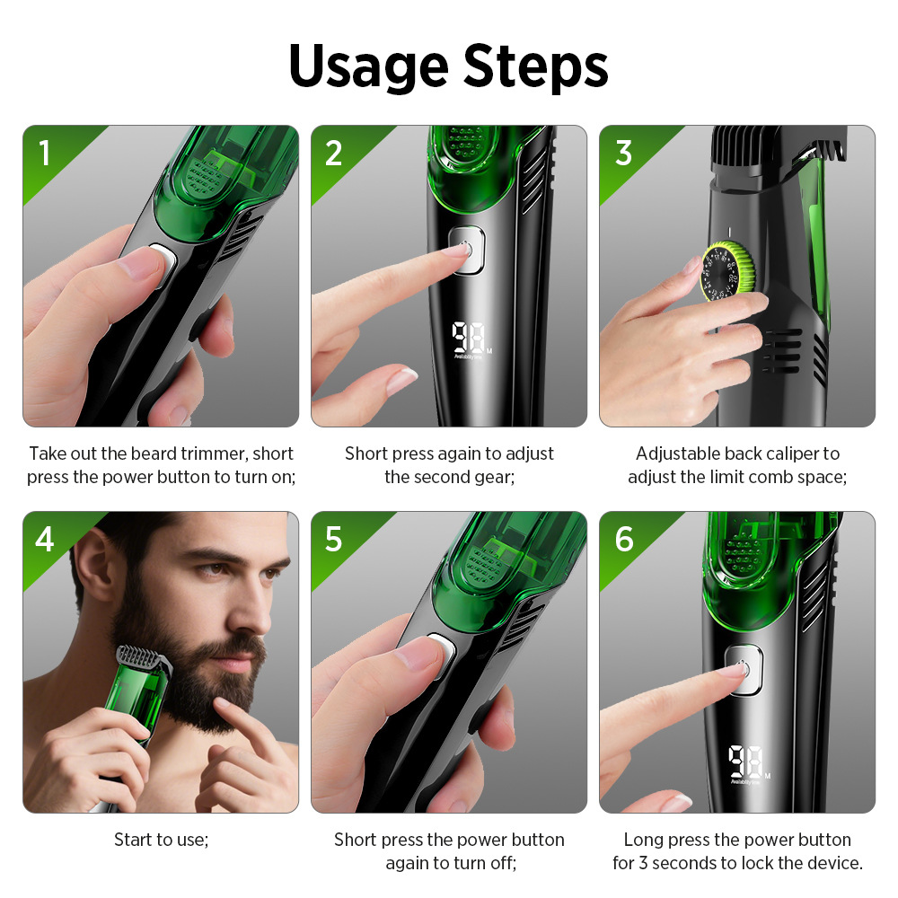 1.吸尘设计,轻松清洁,男士真空胡须修剪器,整洁修剪胡须,内置超级吸力真空修剪,可以轻松将修剪过的头发放入内部盒内,便于处理和清洁,告别散落在水槽和地板上的胡子;