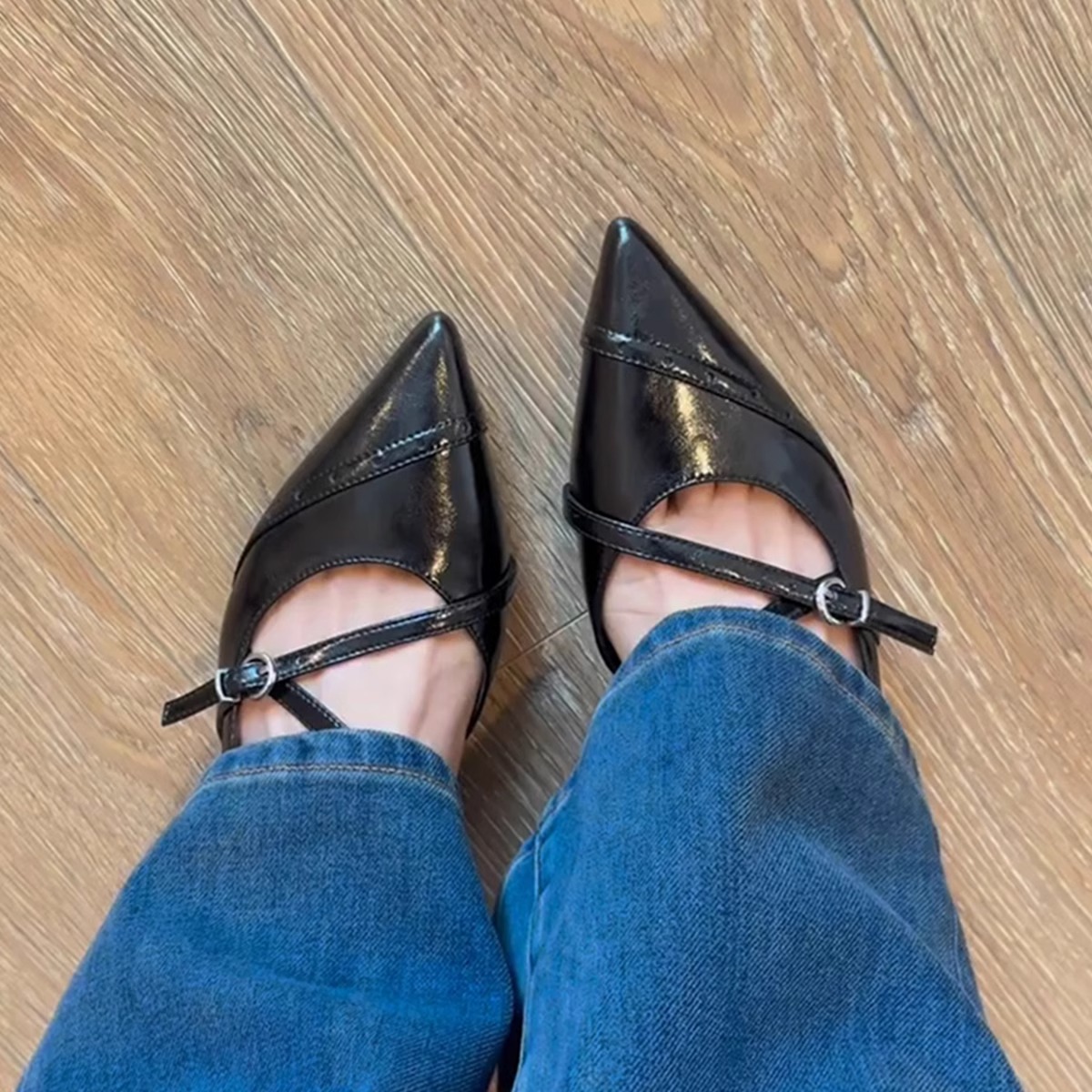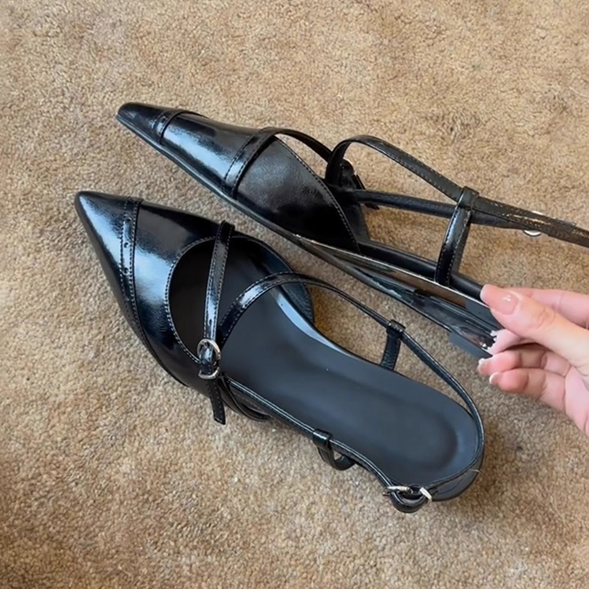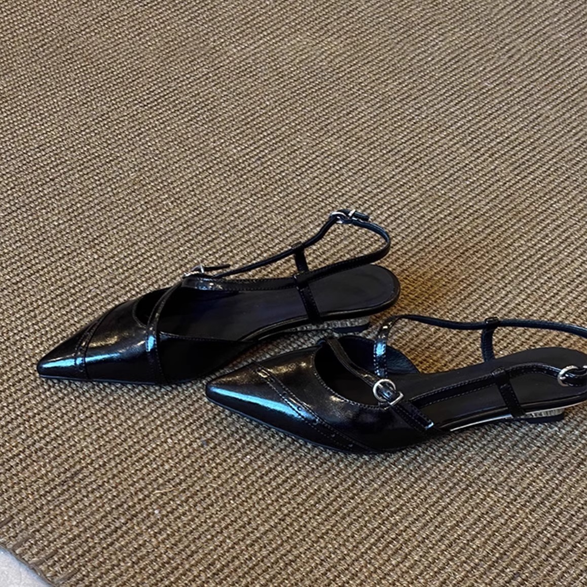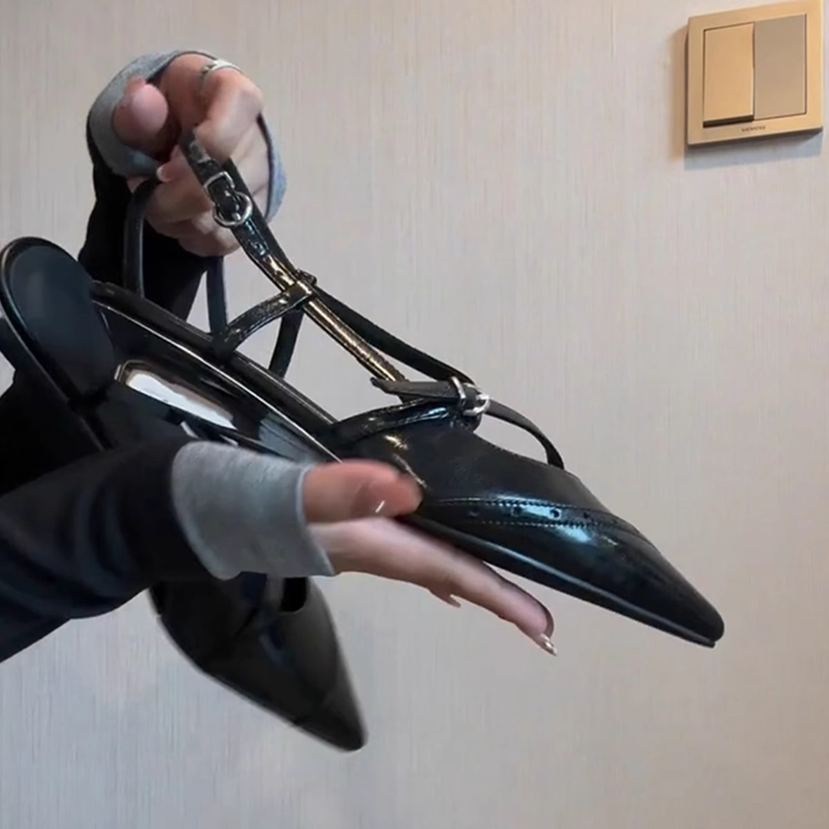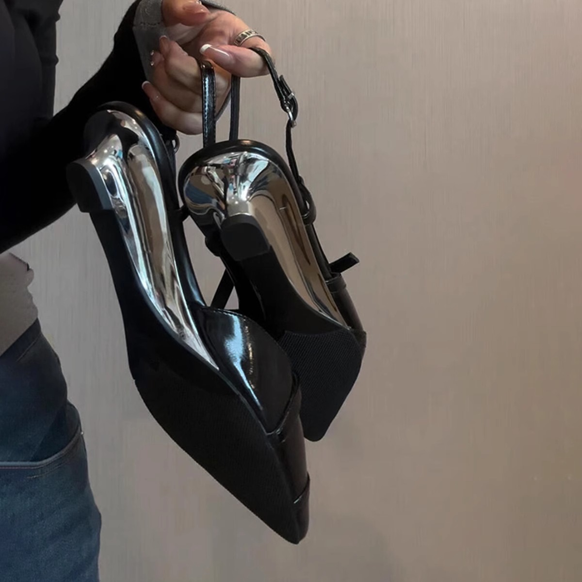 양가죽 버전~메탈 웨지힐 원스트랩 샌들, 여성스러운 포인티드 토, 뉴 디자인 토캡 슈즈