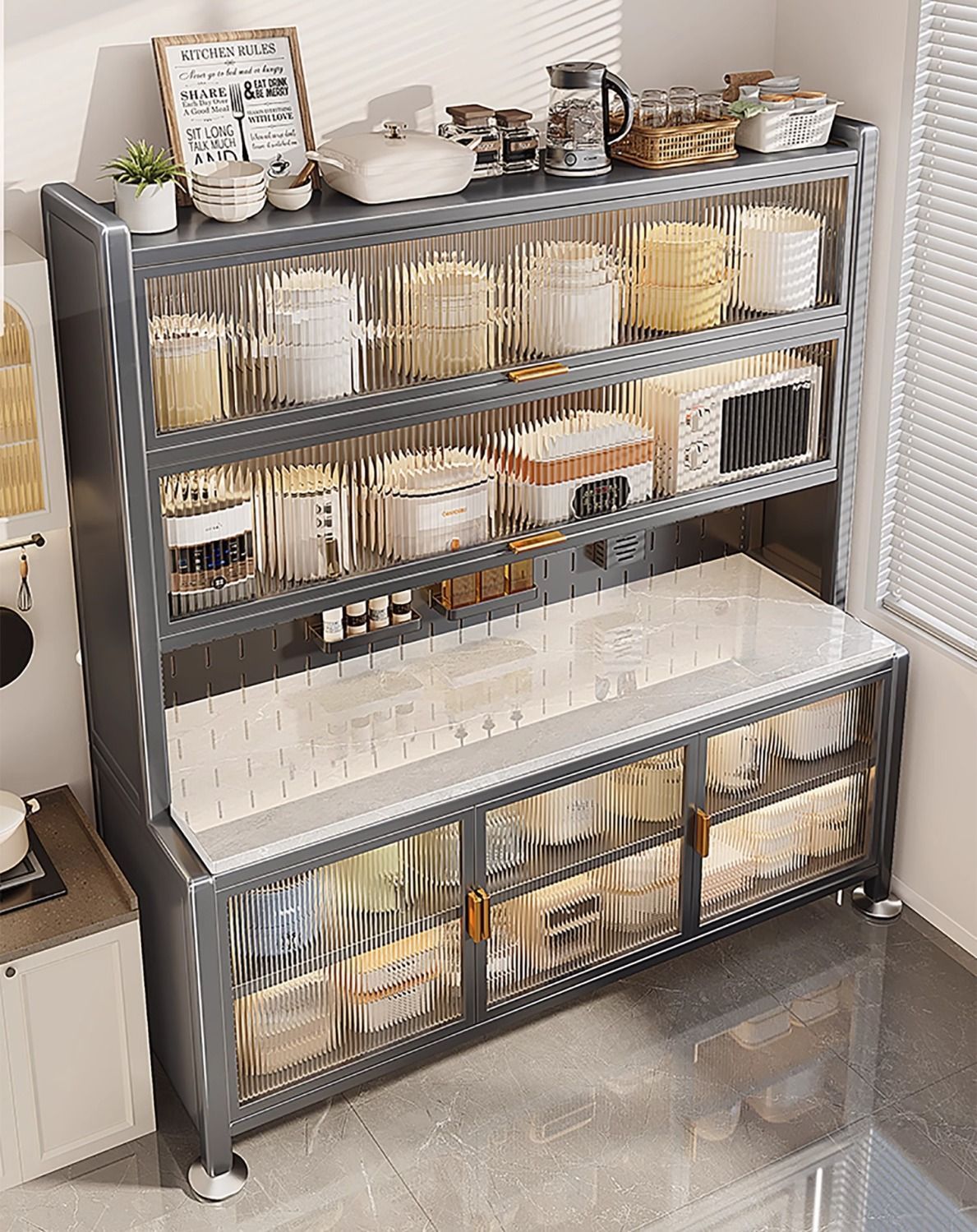 44cm 넓어지고 하단 높이 조절이 가능한 회색 업그레이드 찬장 - 두꺼운 슬레이트 조리대, 6단 100CM, 무료 액세서리, 이중 수술대