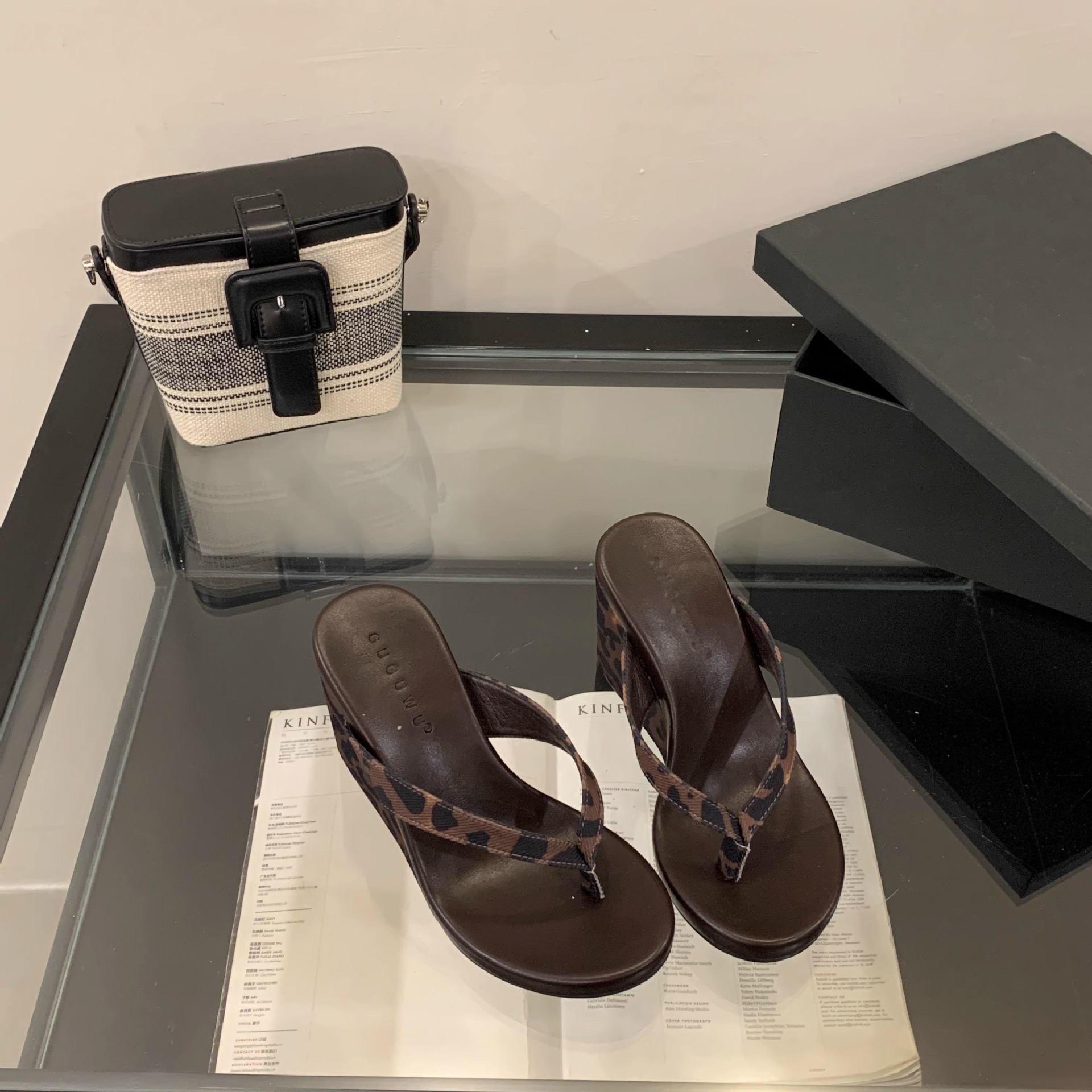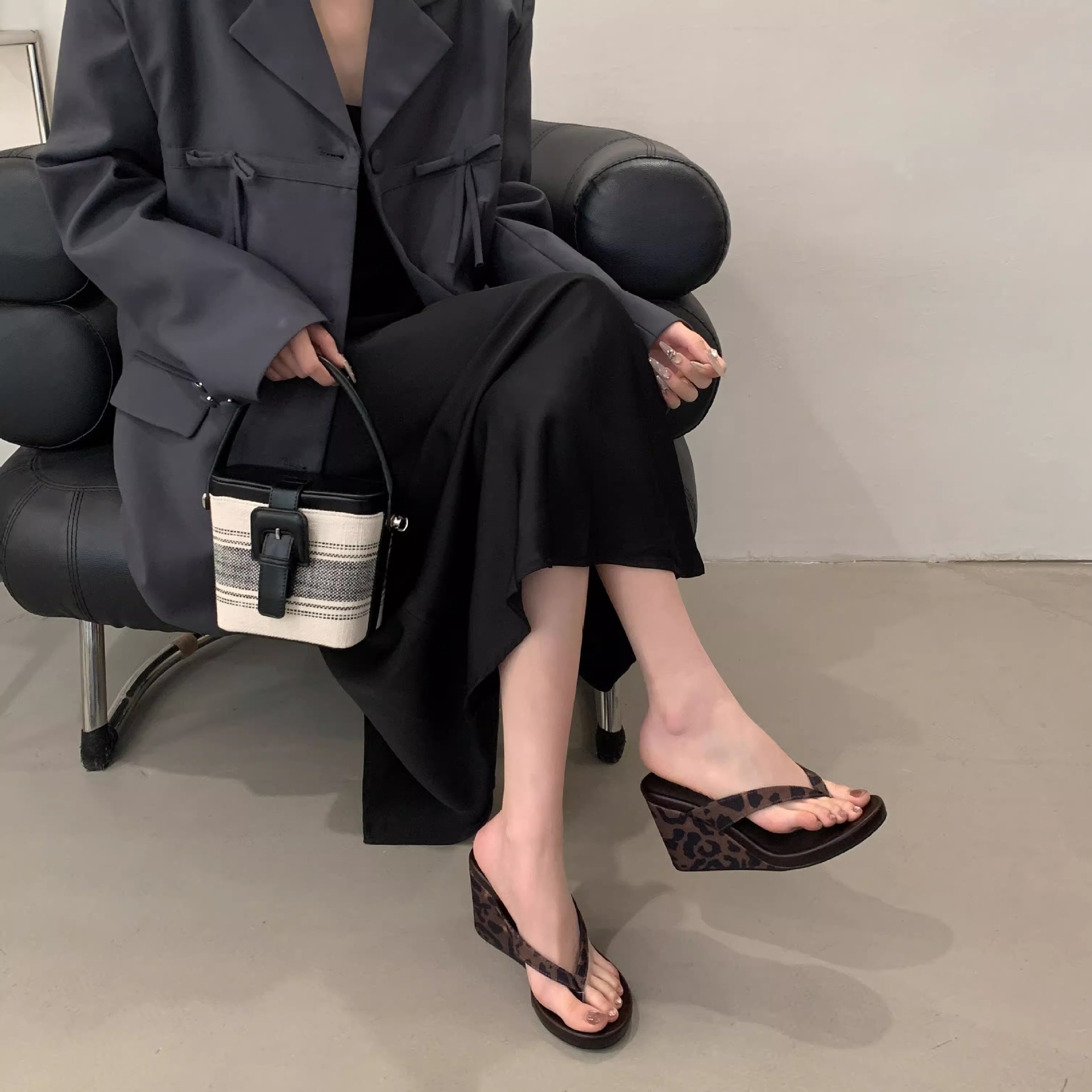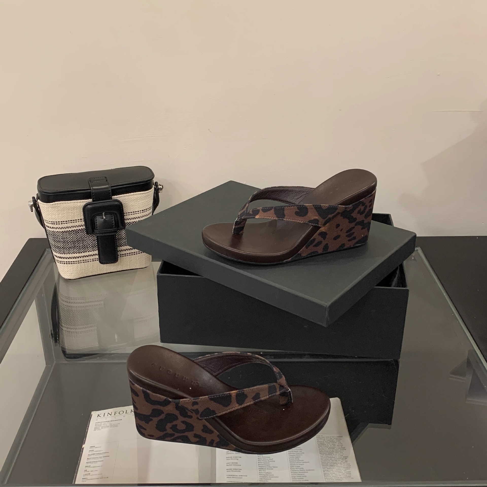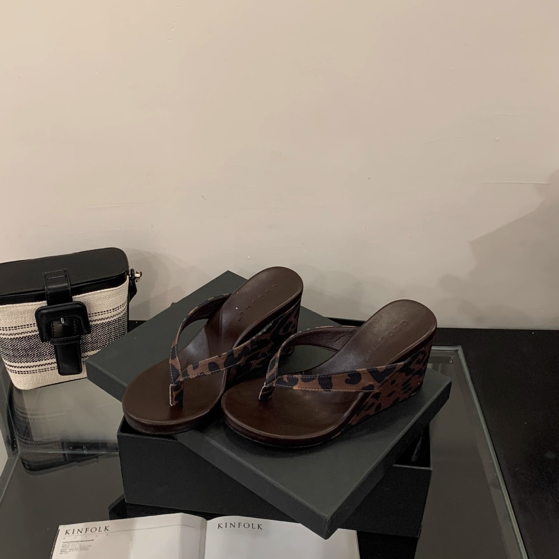 키 작은 분들을 위한 두꺼운 밑창 웨지힐, 두꺼운 굽의 로만 샌들, 여름 아우터로 입기 좋은 레오파드 프린트 슬리퍼