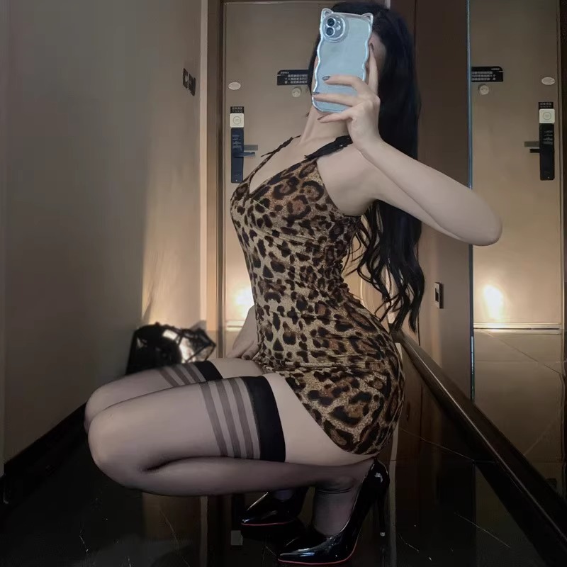 섹시한 여장 드레스, 타이트한 초단단 서스펜더 레이스 잠옷, 레오파드 프린트 조끼 드레스, 남녀공용 숏 스커트