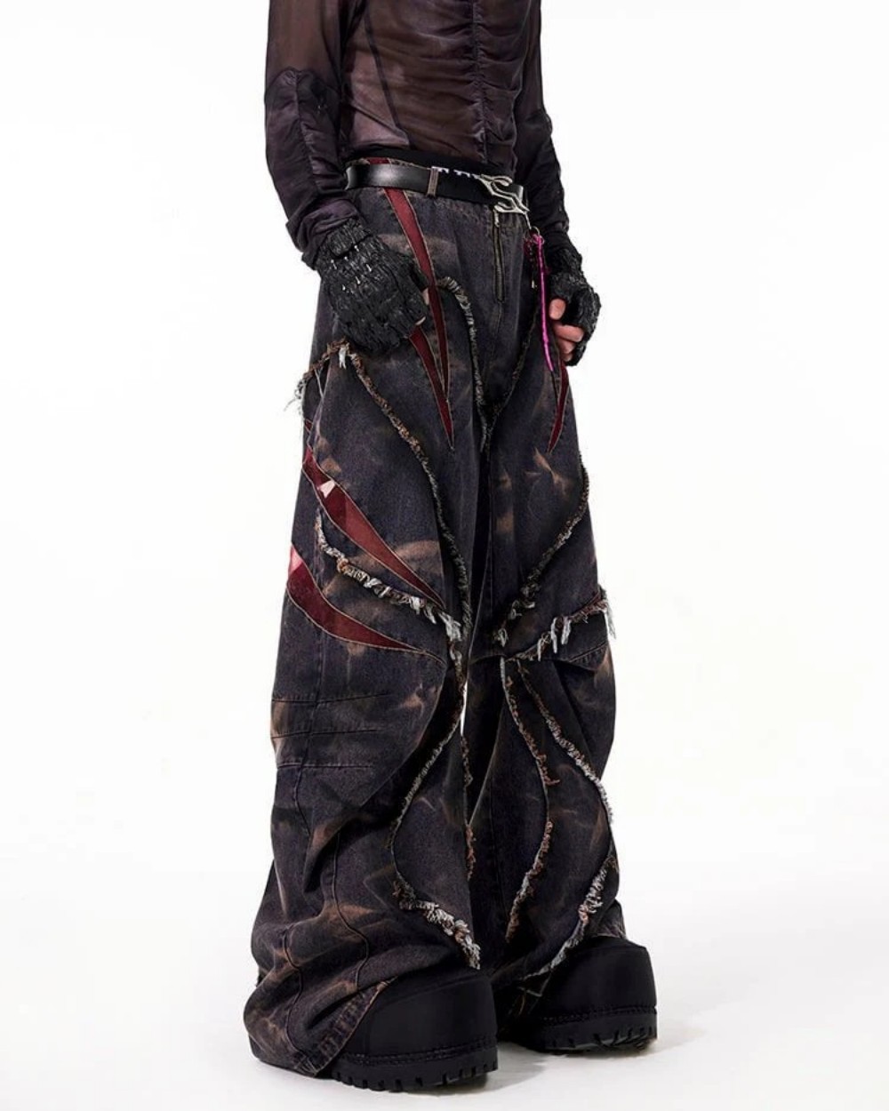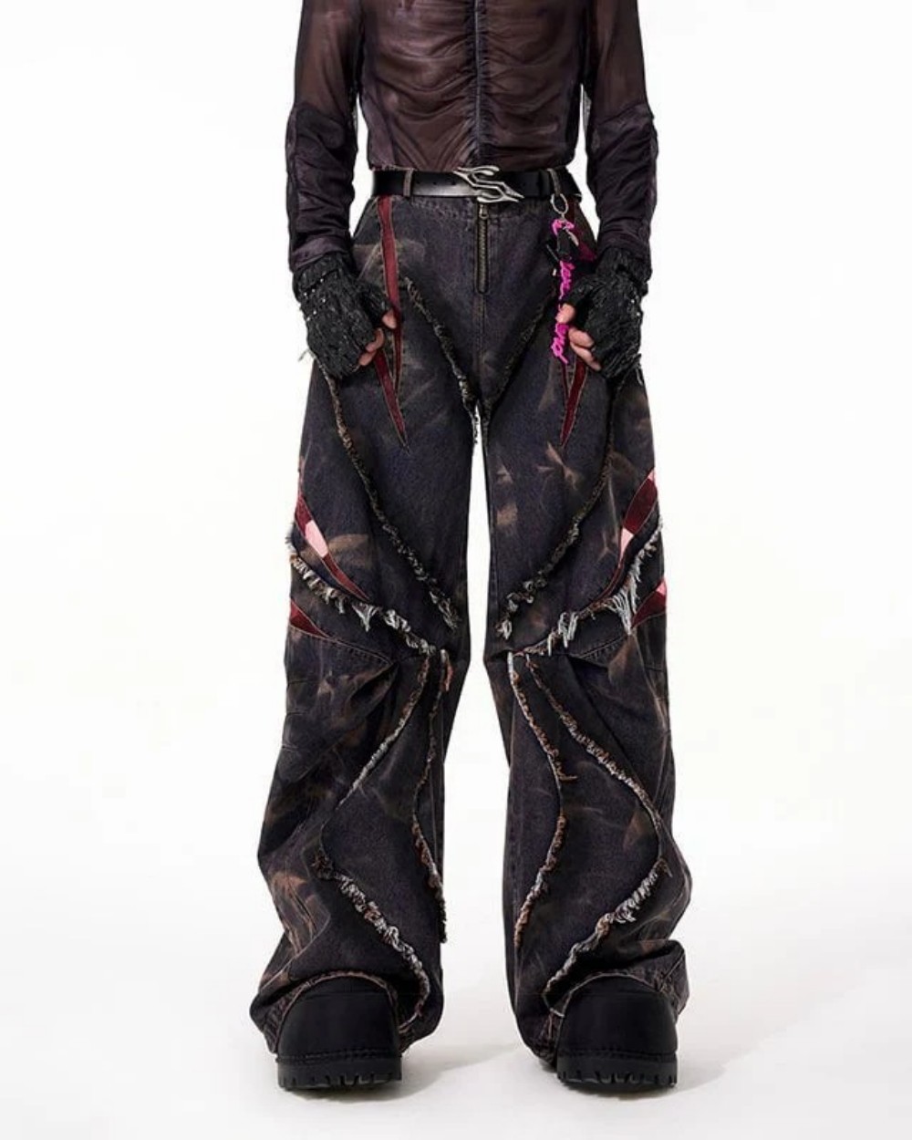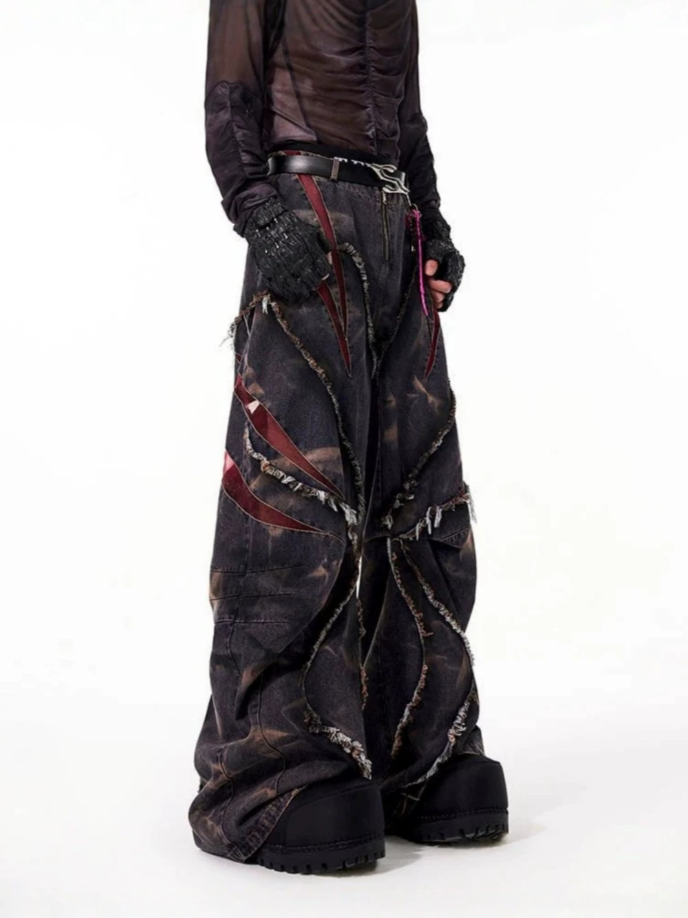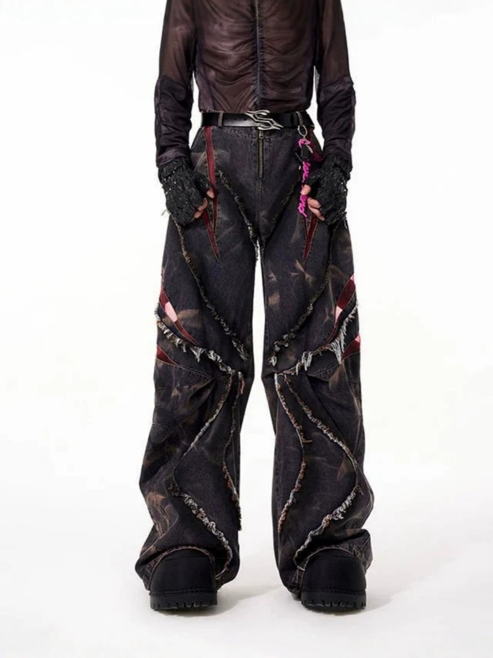 유럽과 미국의 하이 스트리트 헤비듀티 스노우플레이크 세이버 청바지 남성용 봄 로우 엣지 스플라이스 메쉬 와이드 레그 팬츠