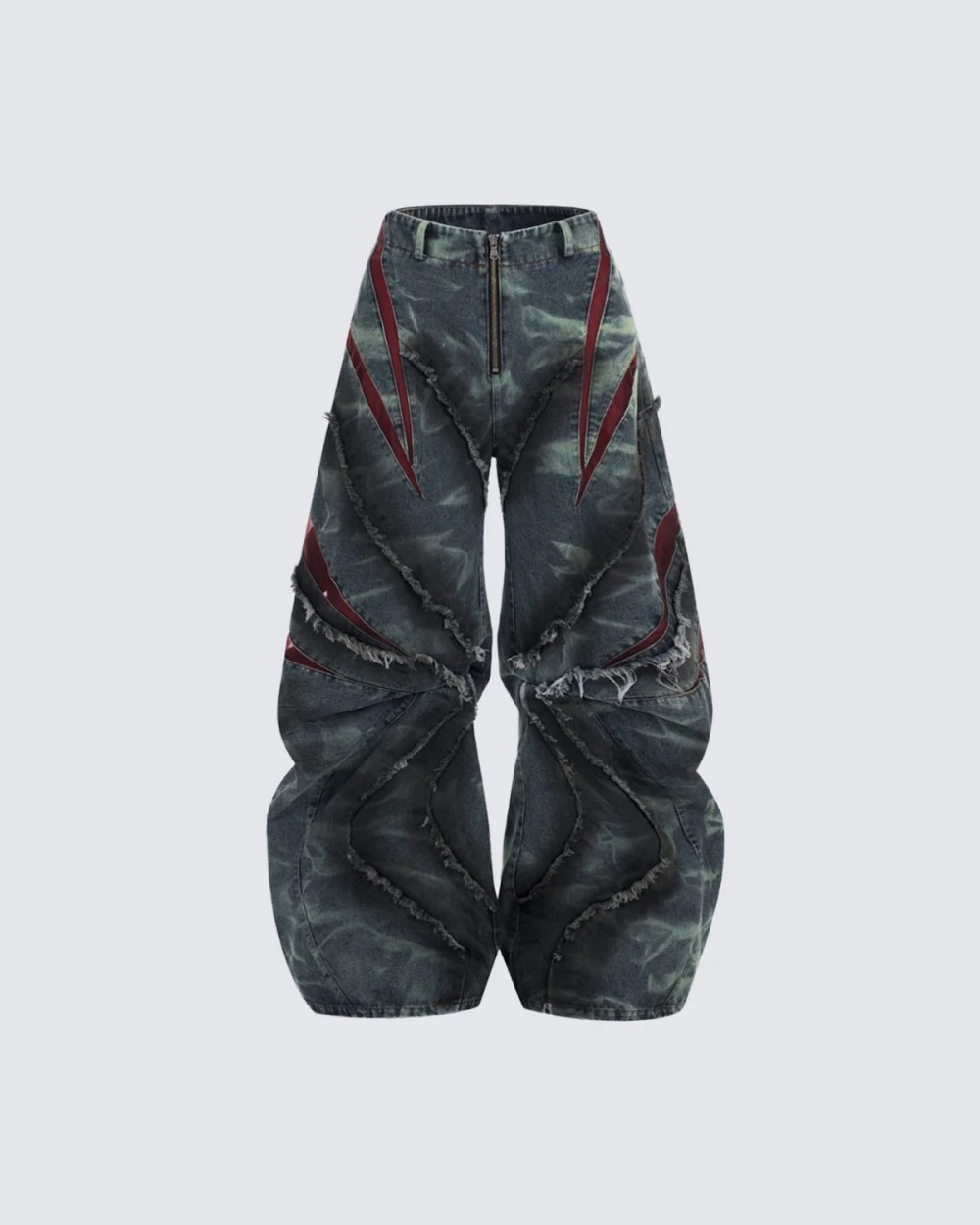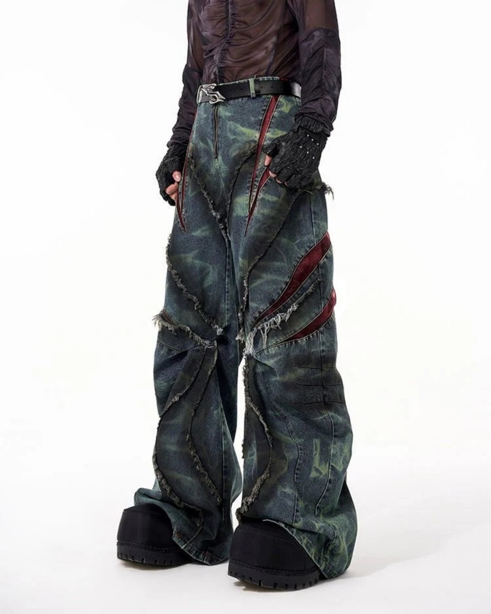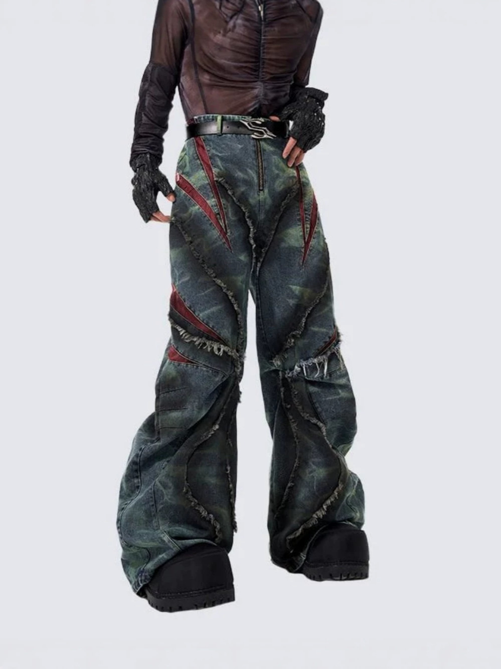 유럽과 미국의 하이 스트리트 헤비듀티 스노우플레이크 세이버 청바지 남성용 봄 로우 엣지 스플라이스 메쉬 와이드 레그 팬츠
