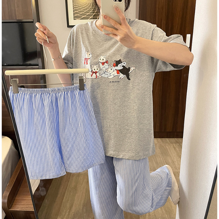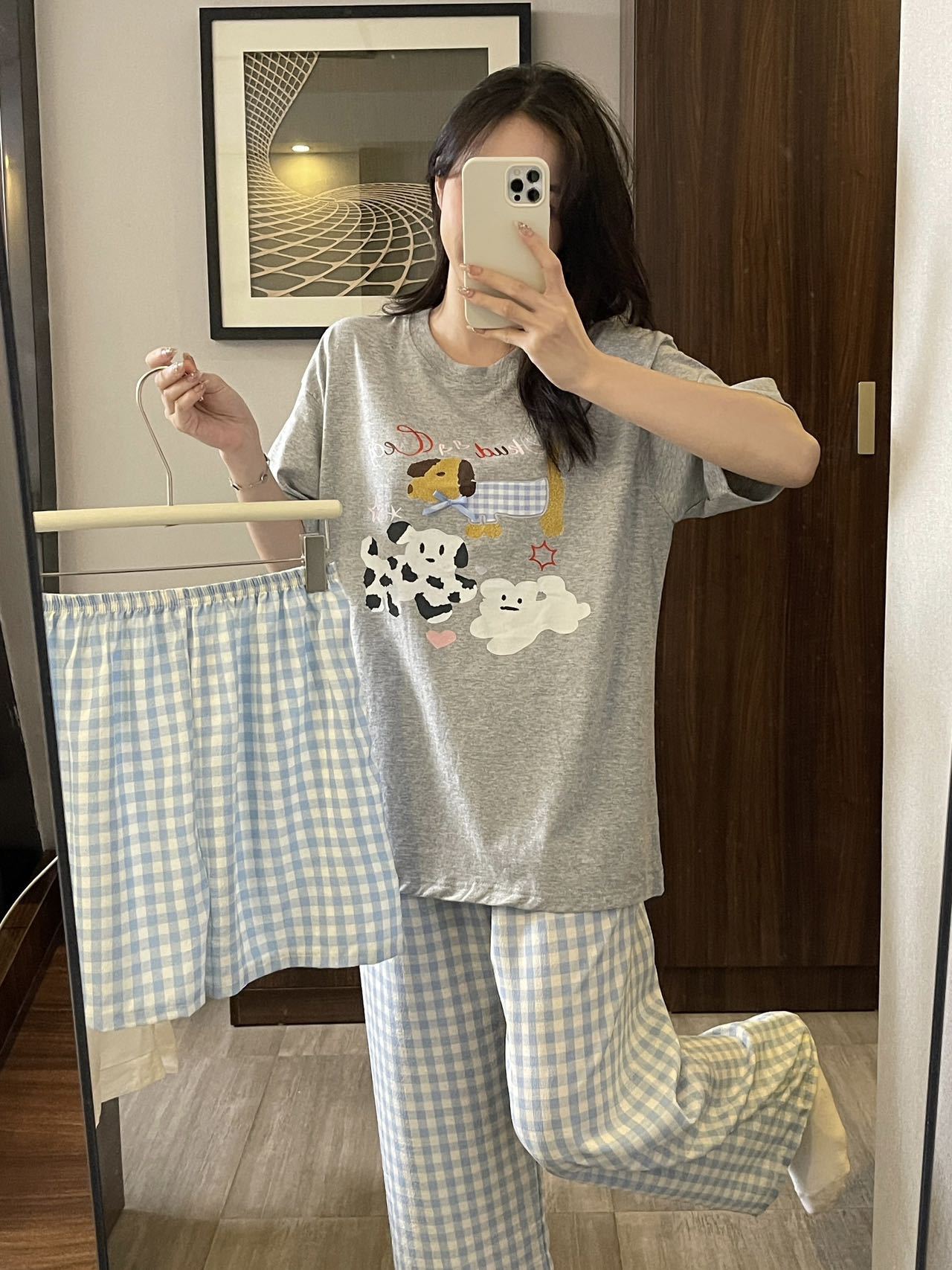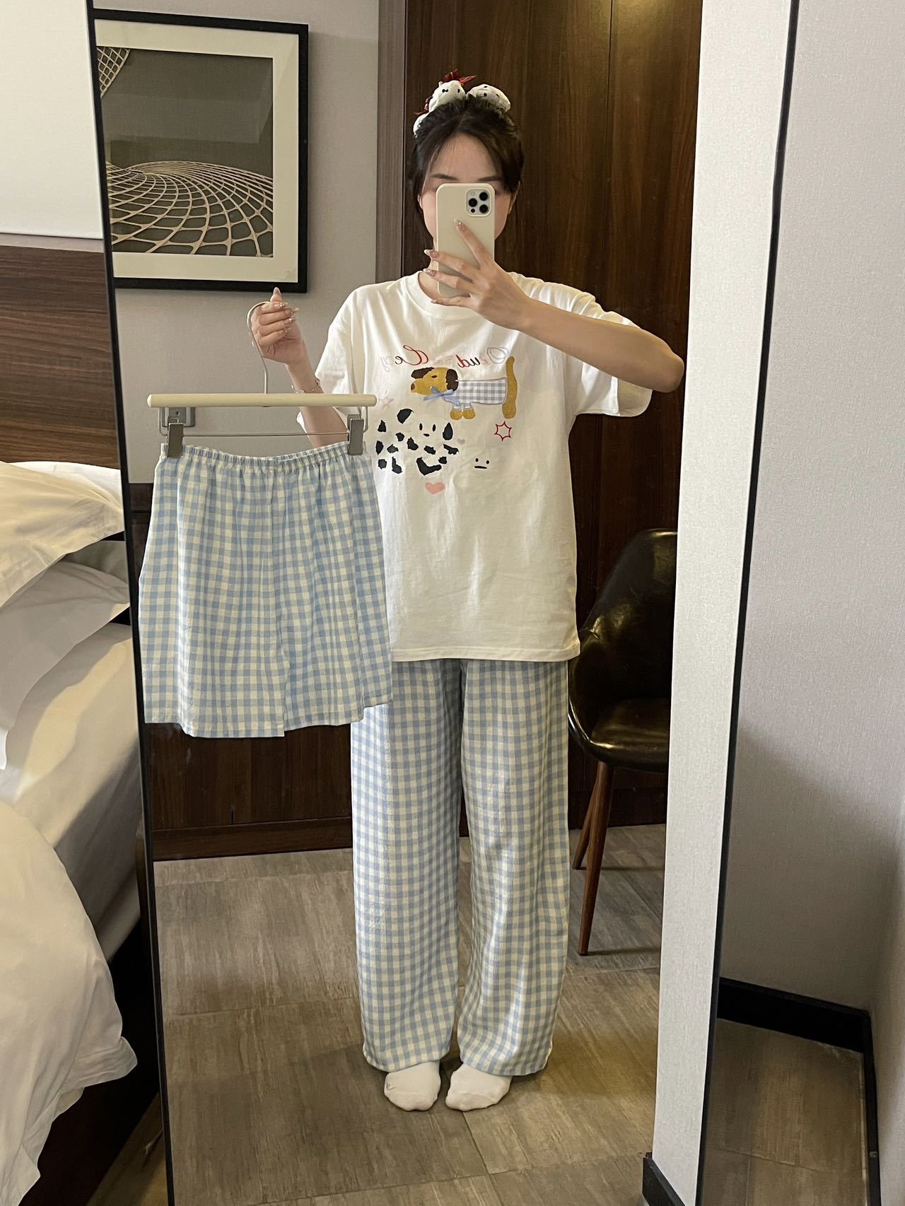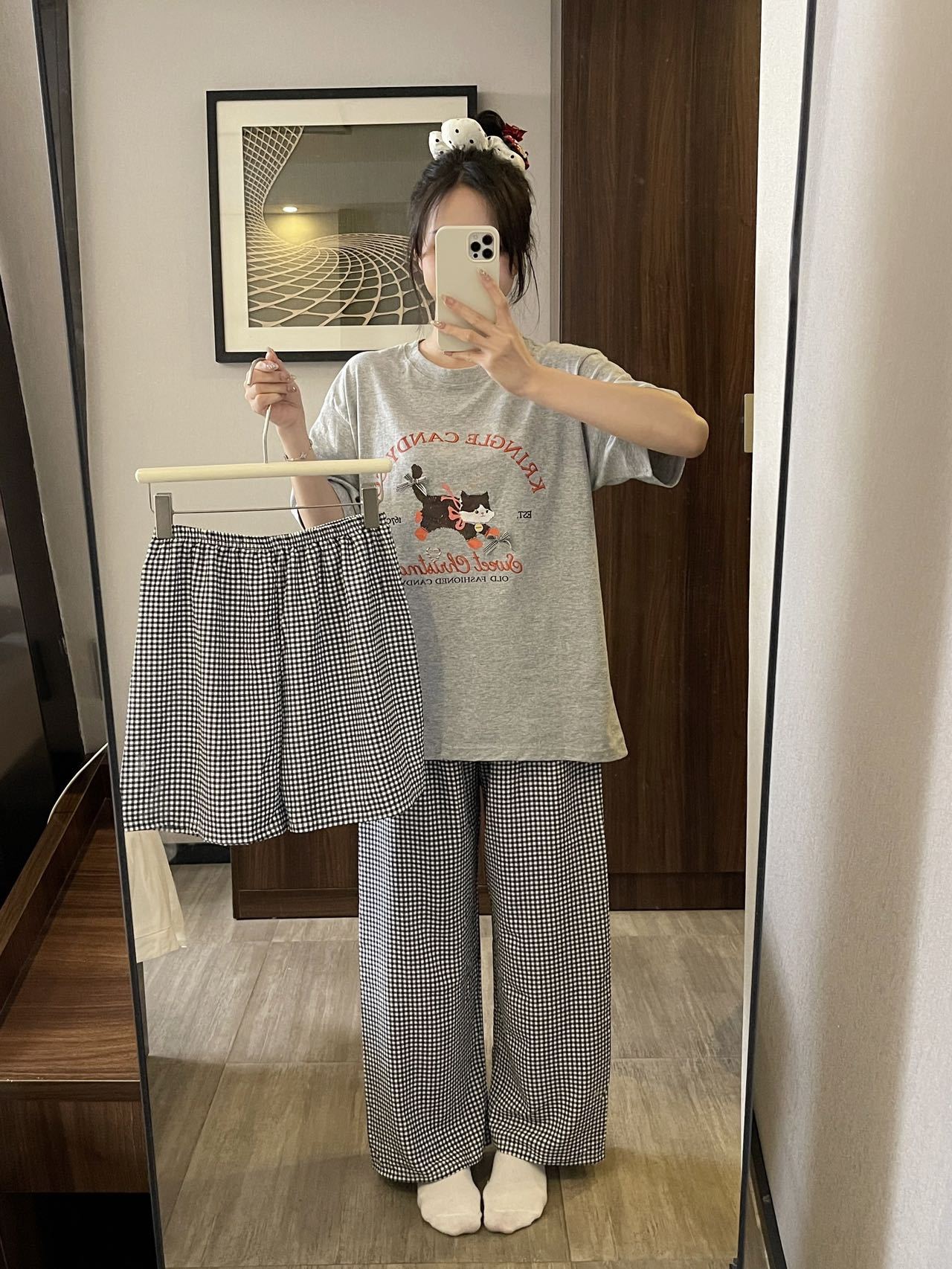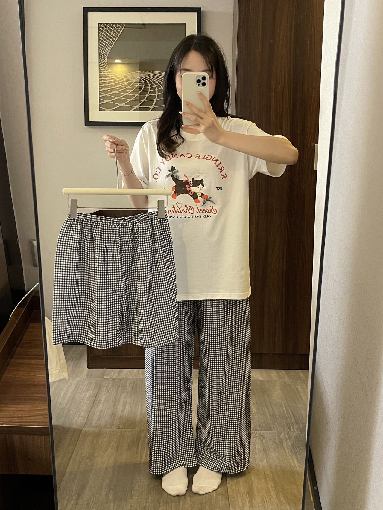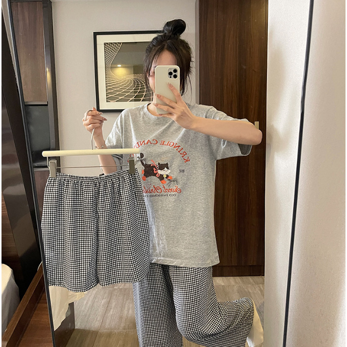 여성을위한 면화 잠옷 여름 새로운 귀여운 만화 격자 무늬 반팔 3 피스 세트 느슨한 얇은 홈웨어 외부에 착용 가능
