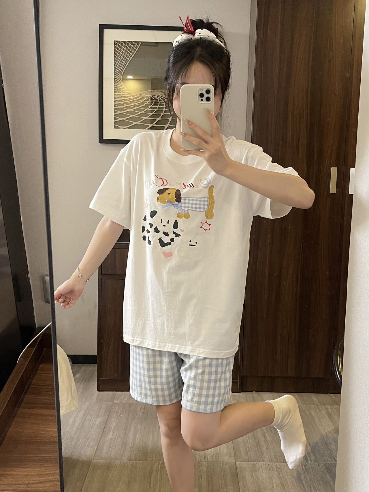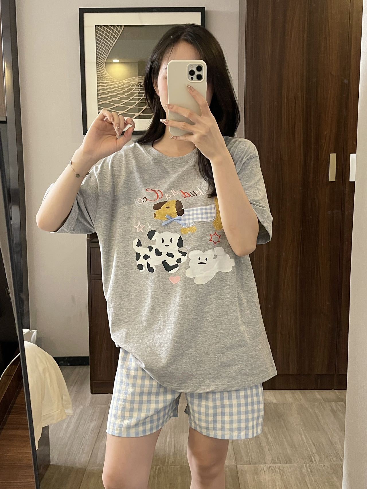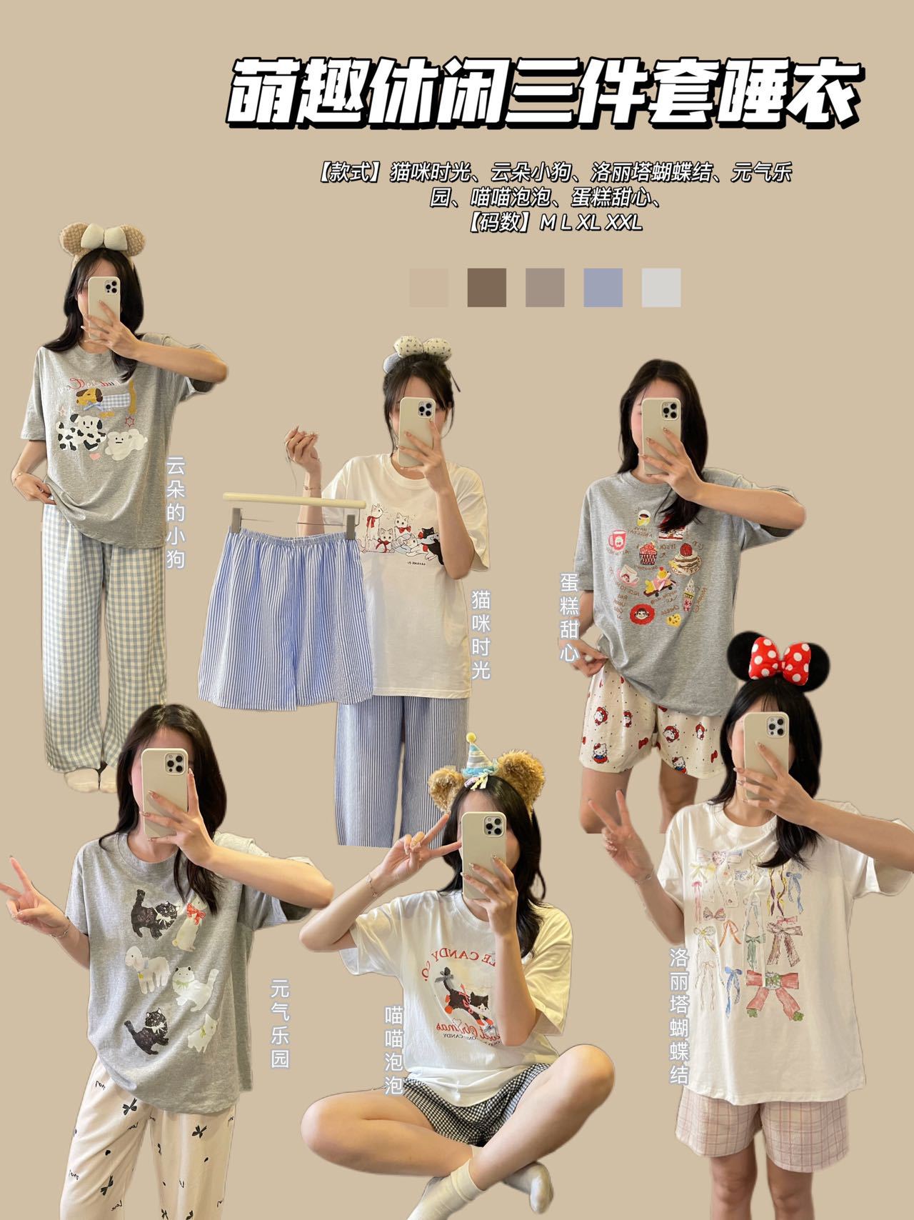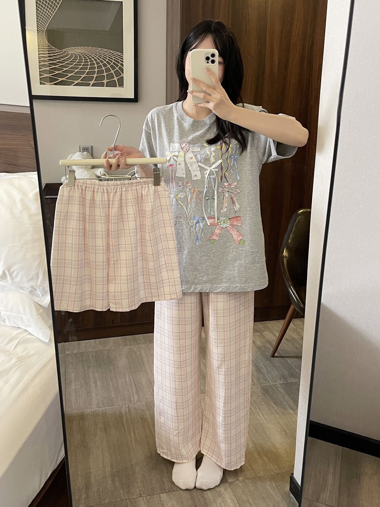 여성을위한 면화 잠옷 여름 새로운 귀여운 만화 격자 무늬 반팔 3 피스 세트 느슨한 얇은 홈웨어 외부에 착용 가능
