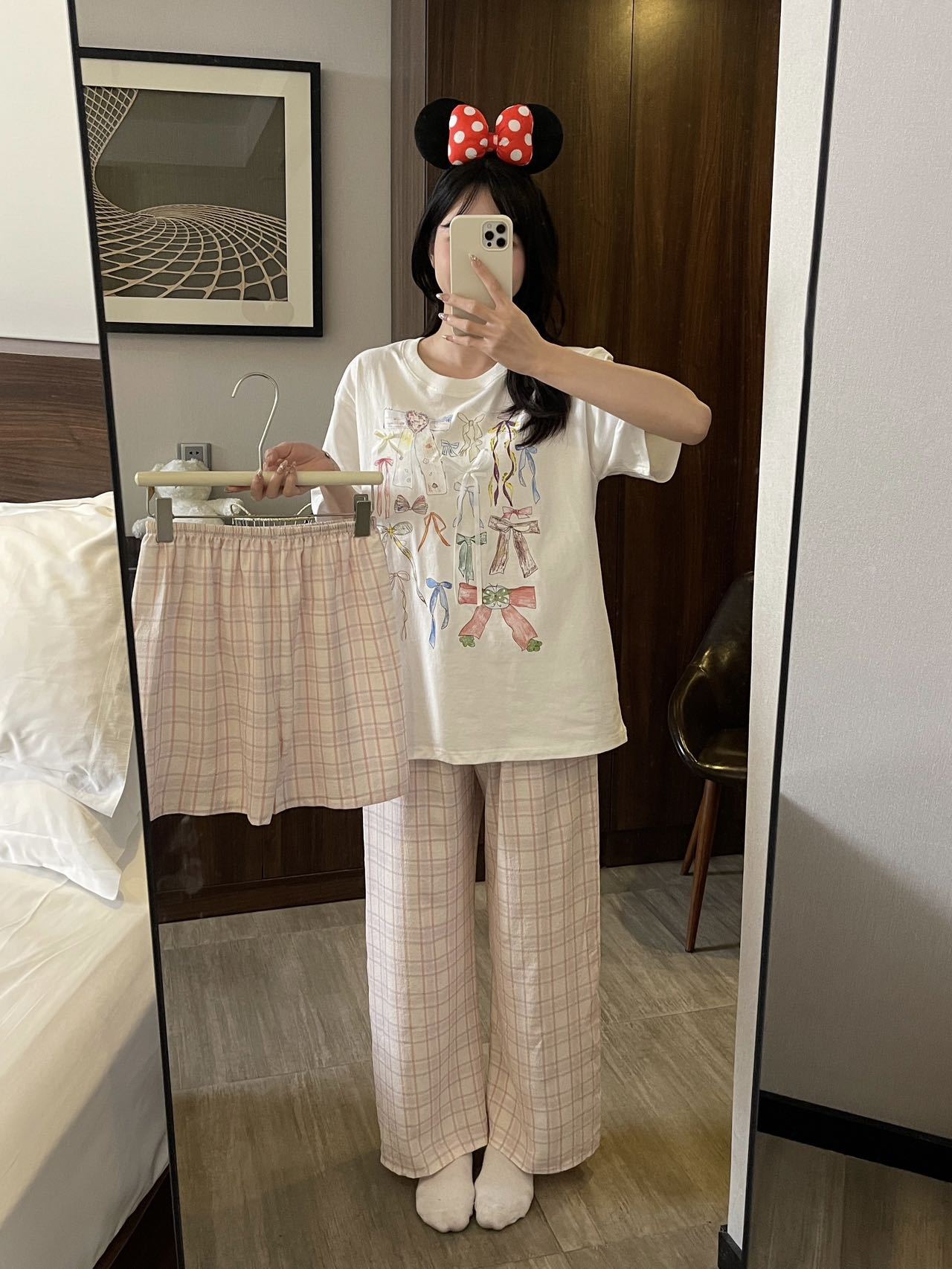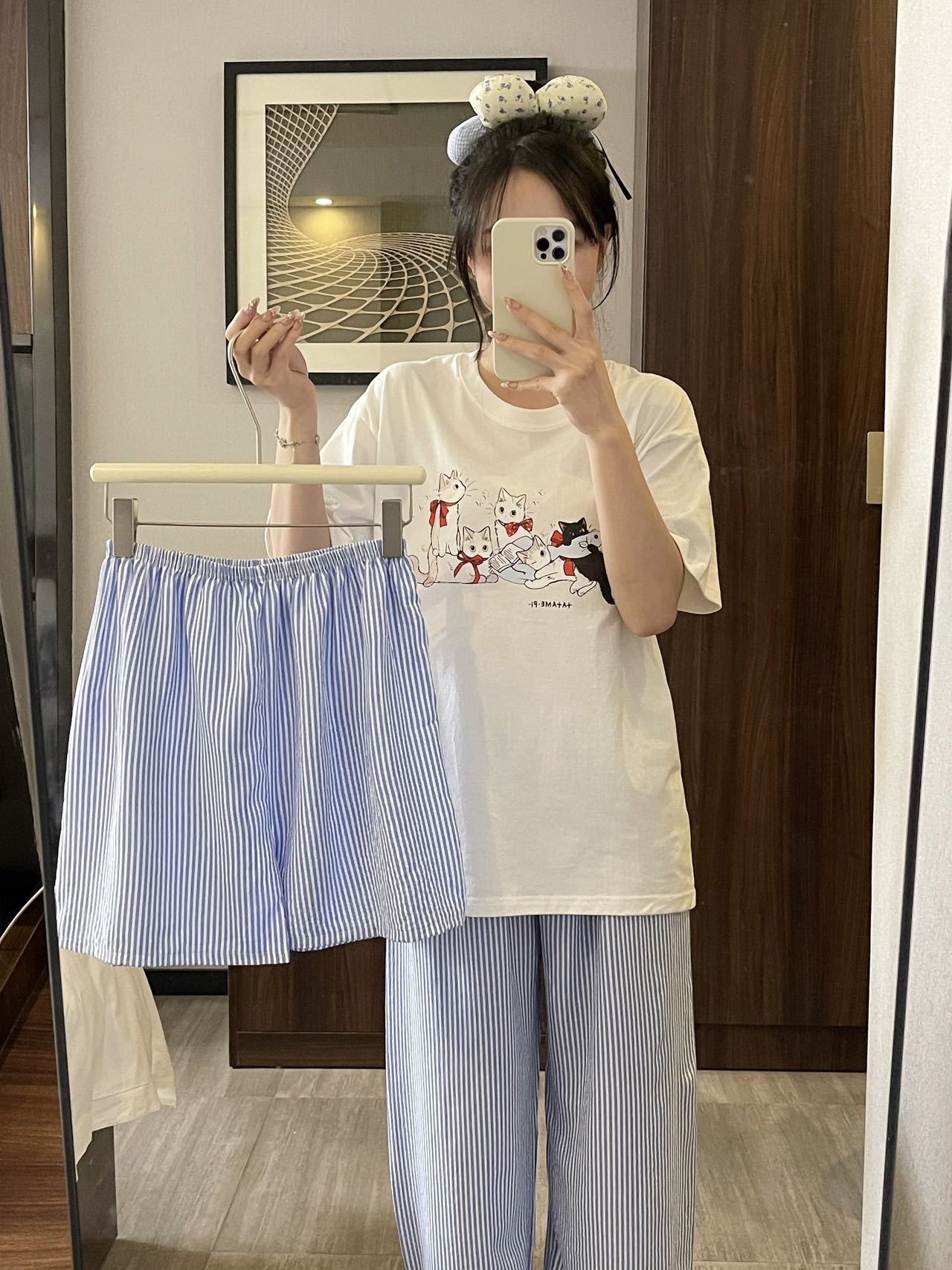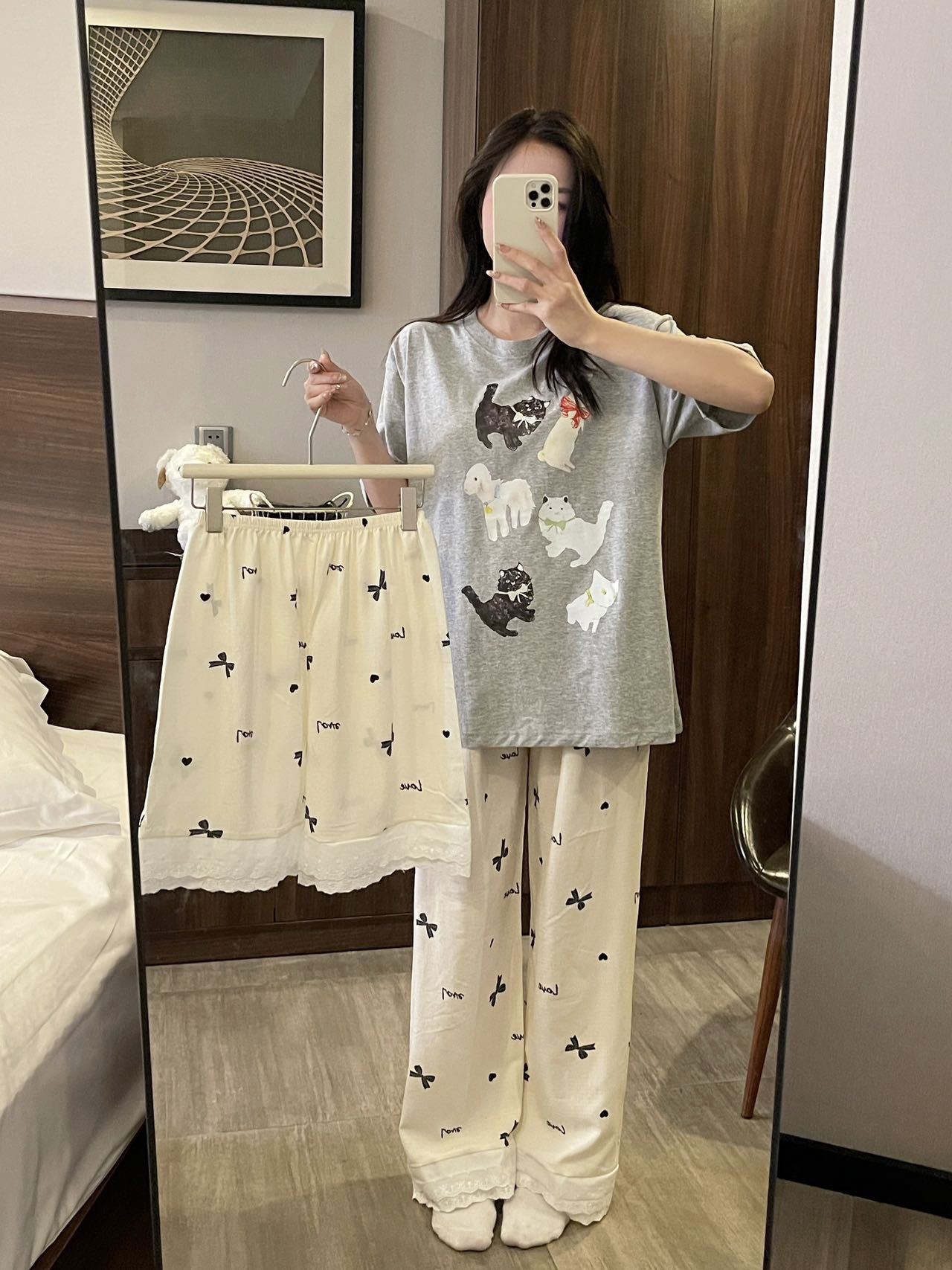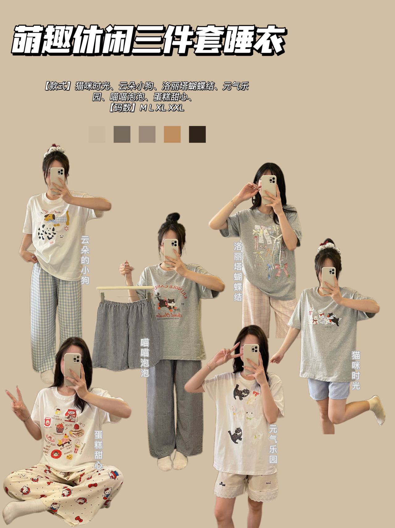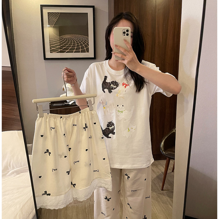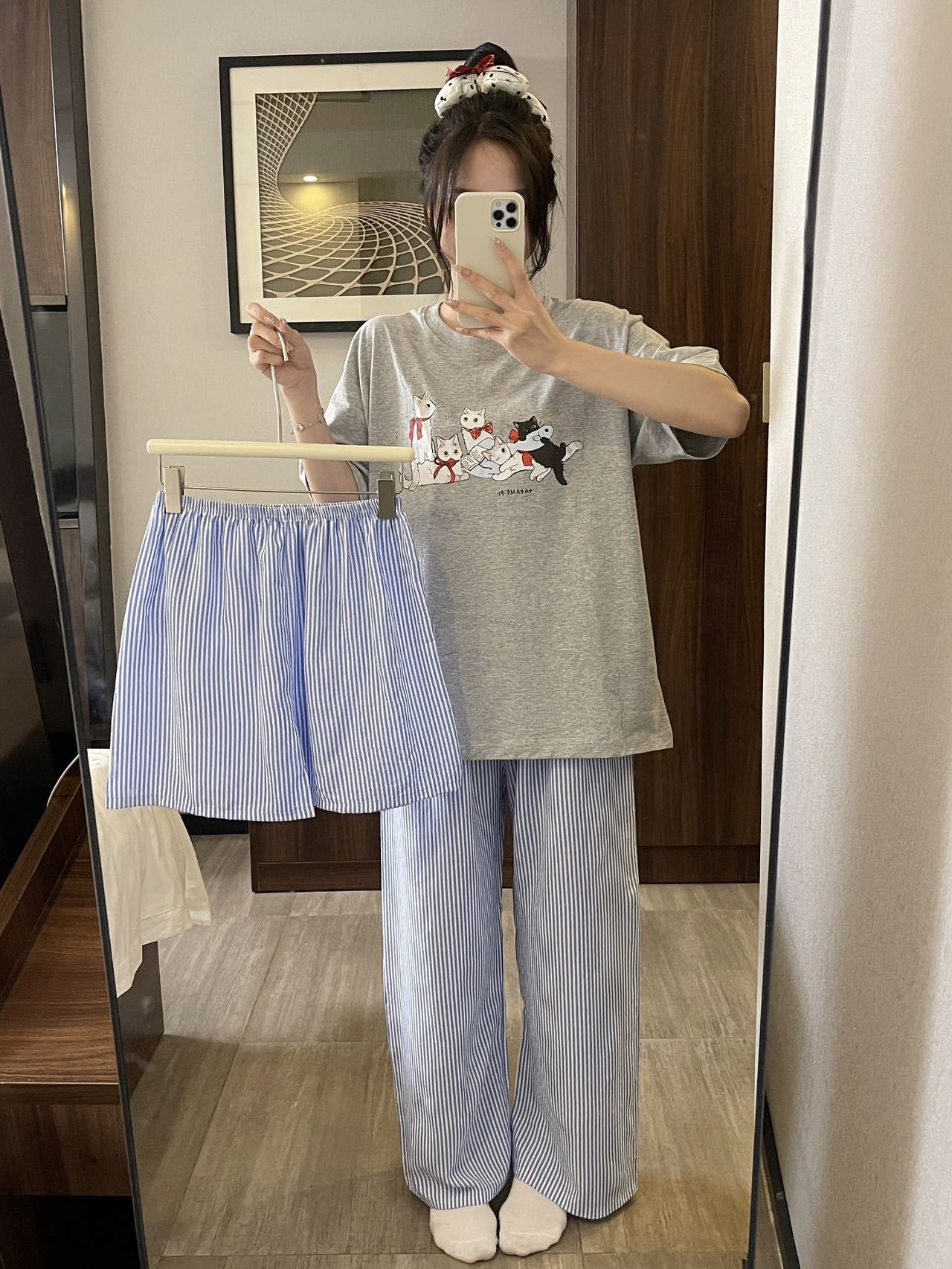 여성을위한 면화 잠옷 여름 새로운 귀여운 만화 격자 무늬 반팔 3 피스 세트 느슨한 얇은 홈웨어 외부에 착용 가능