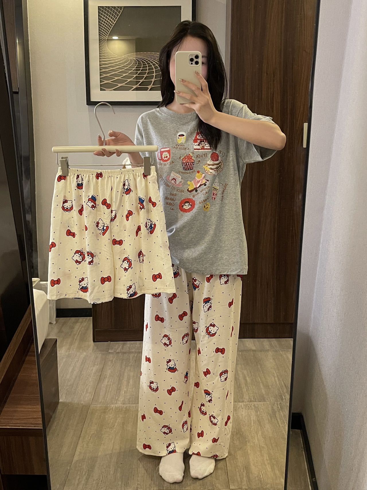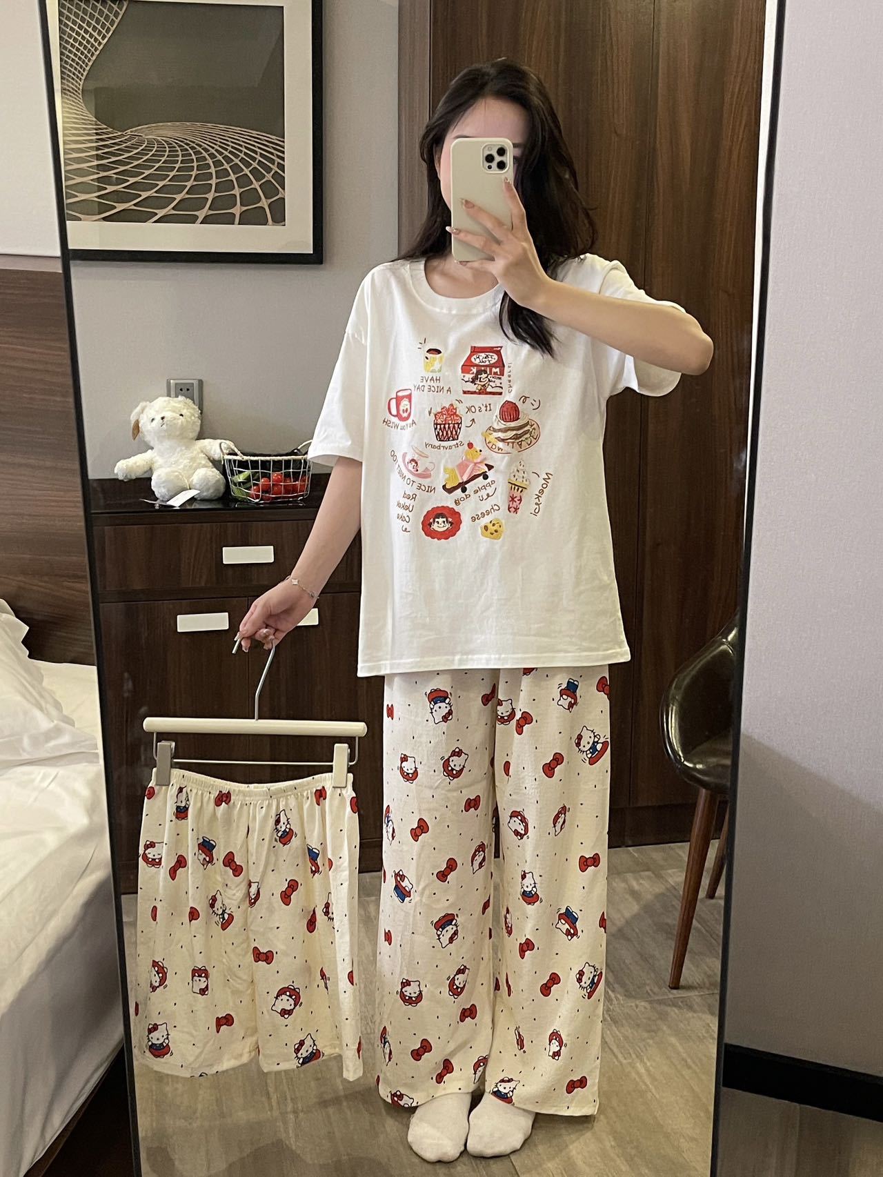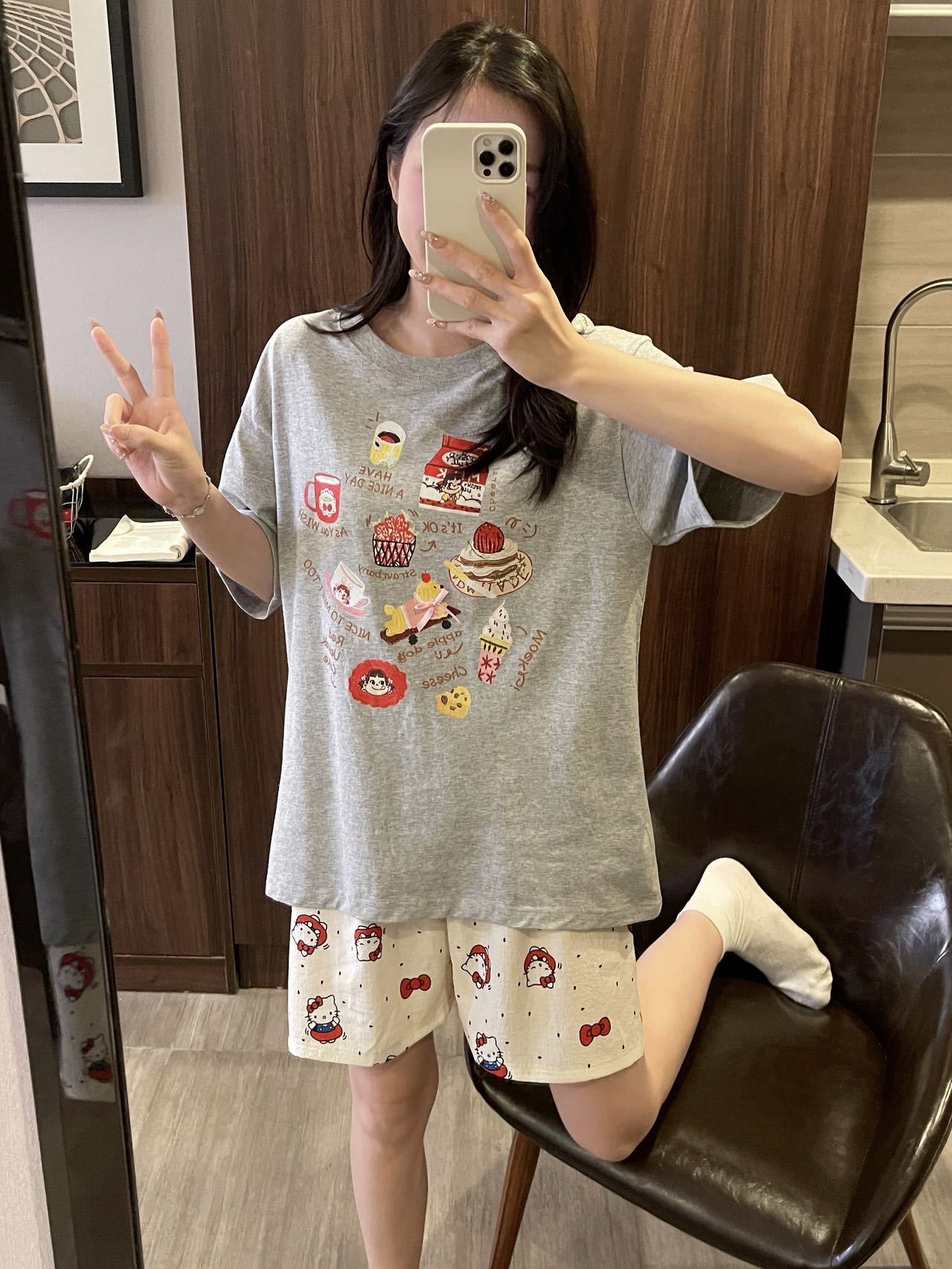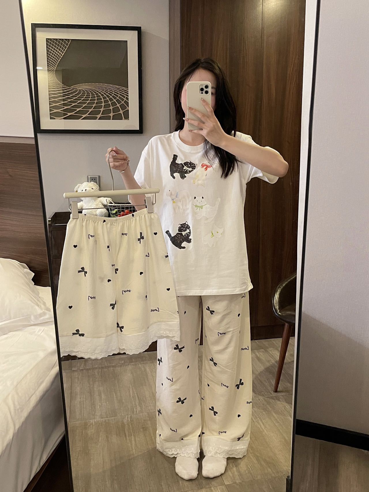 여성을위한 면화 잠옷 여름 새로운 귀여운 만화 격자 무늬 반팔 3 피스 세트 느슨한 얇은 홈웨어 외부에 착용 가능
