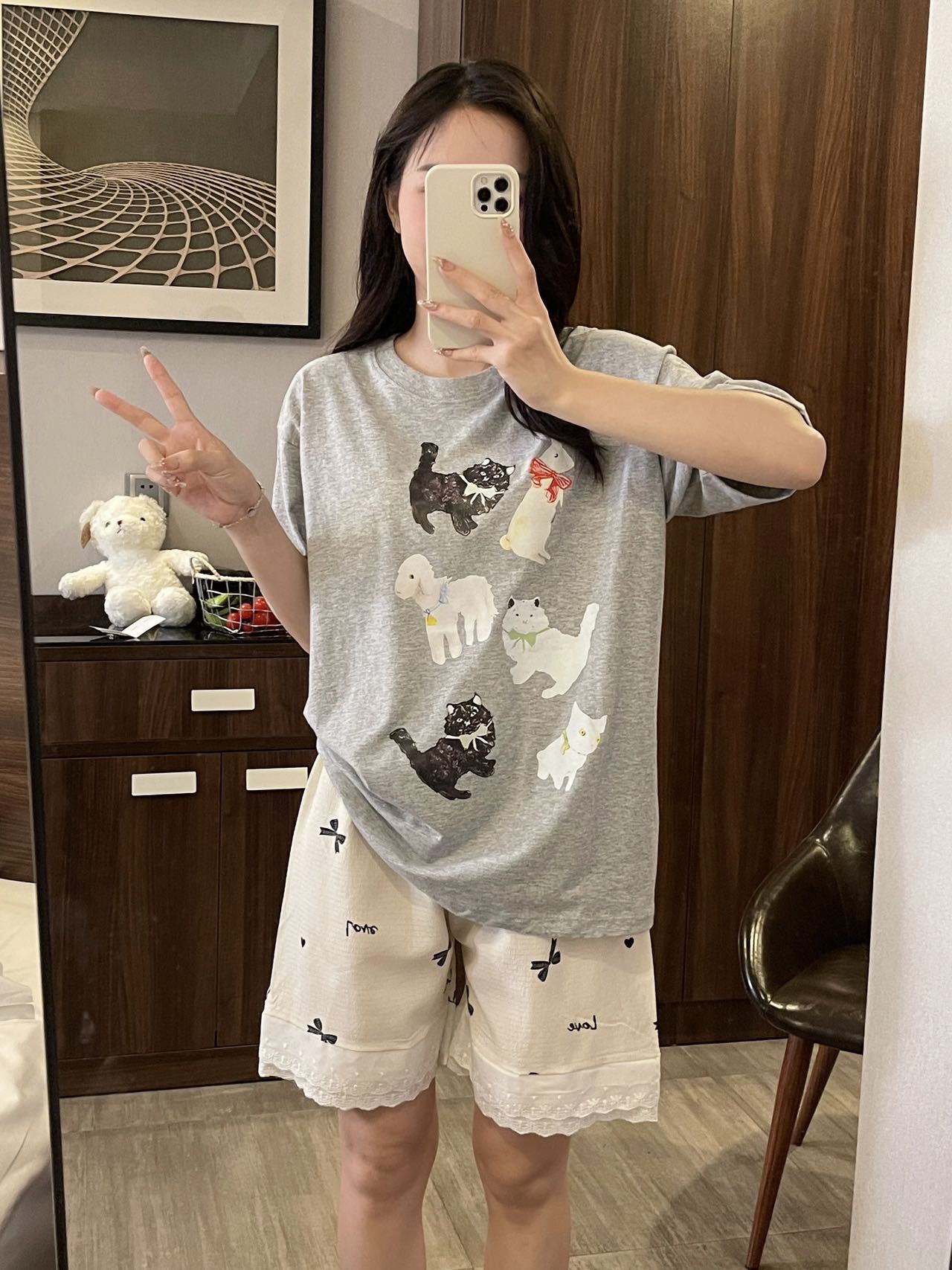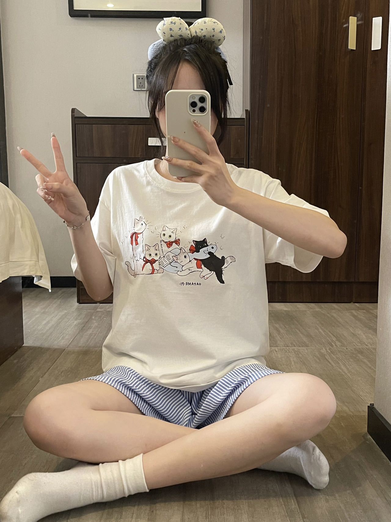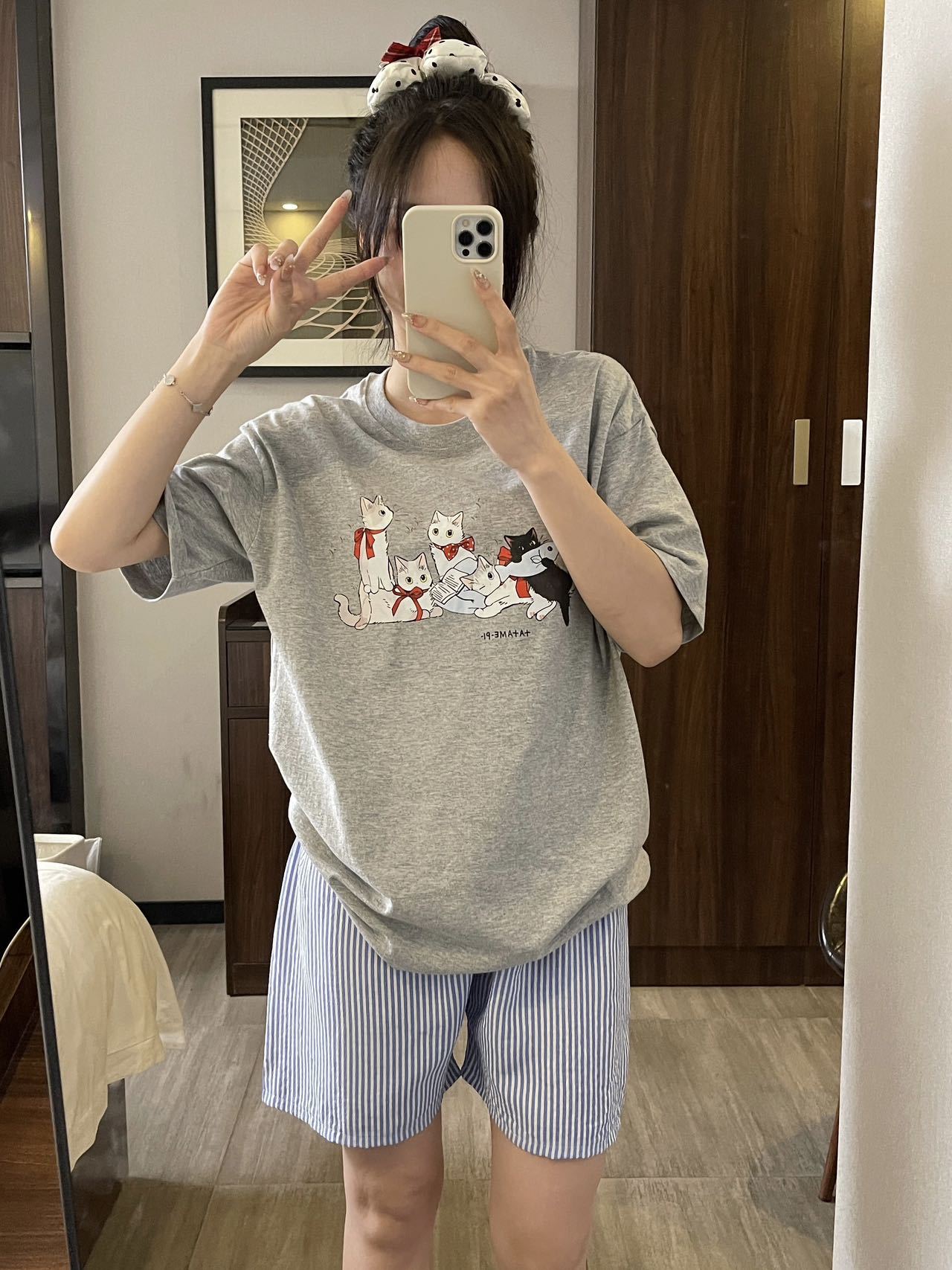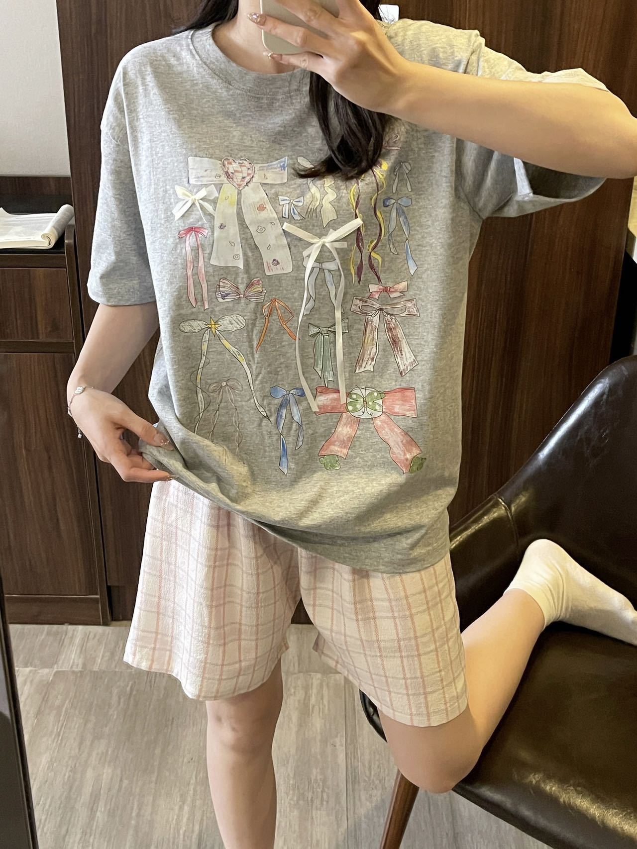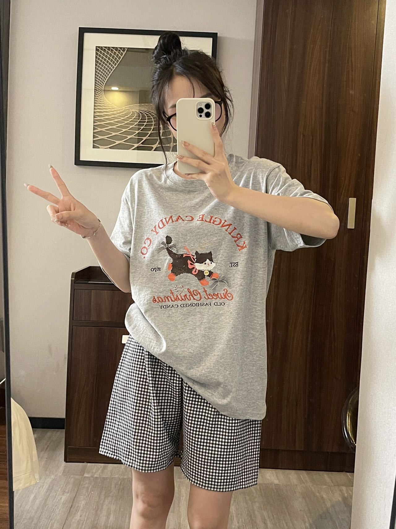 여성을위한 면화 잠옷 여름 새로운 귀여운 만화 격자 무늬 반팔 3 피스 세트 느슨한 얇은 홈웨어 외부에 착용 가능