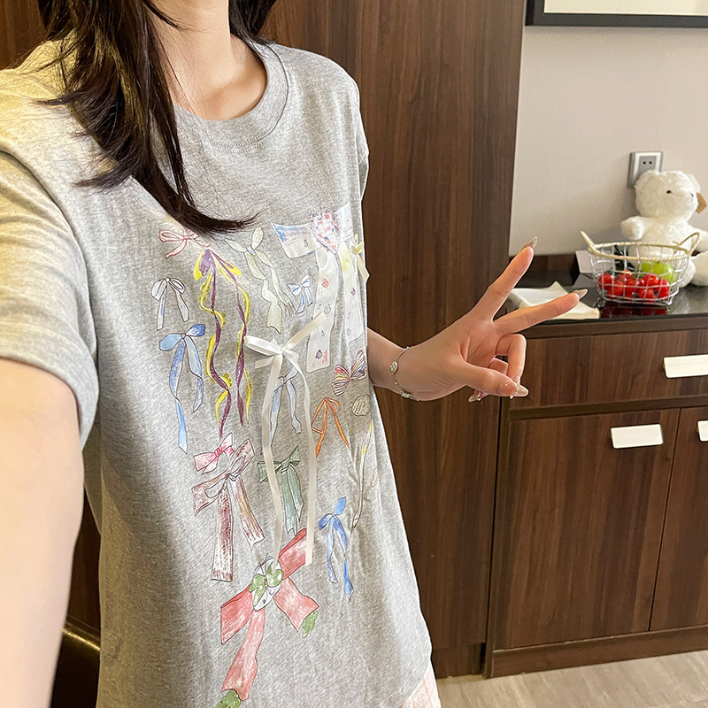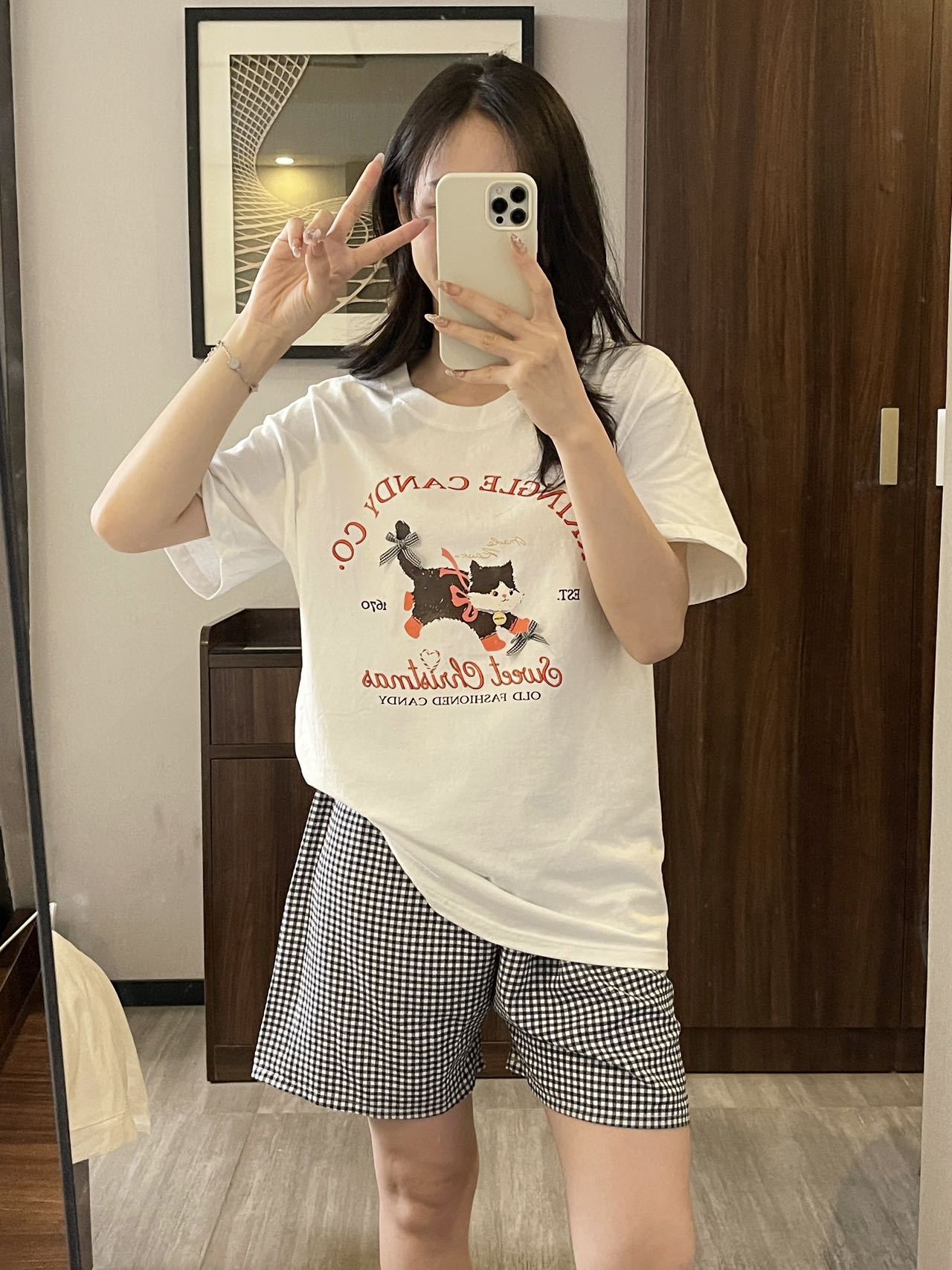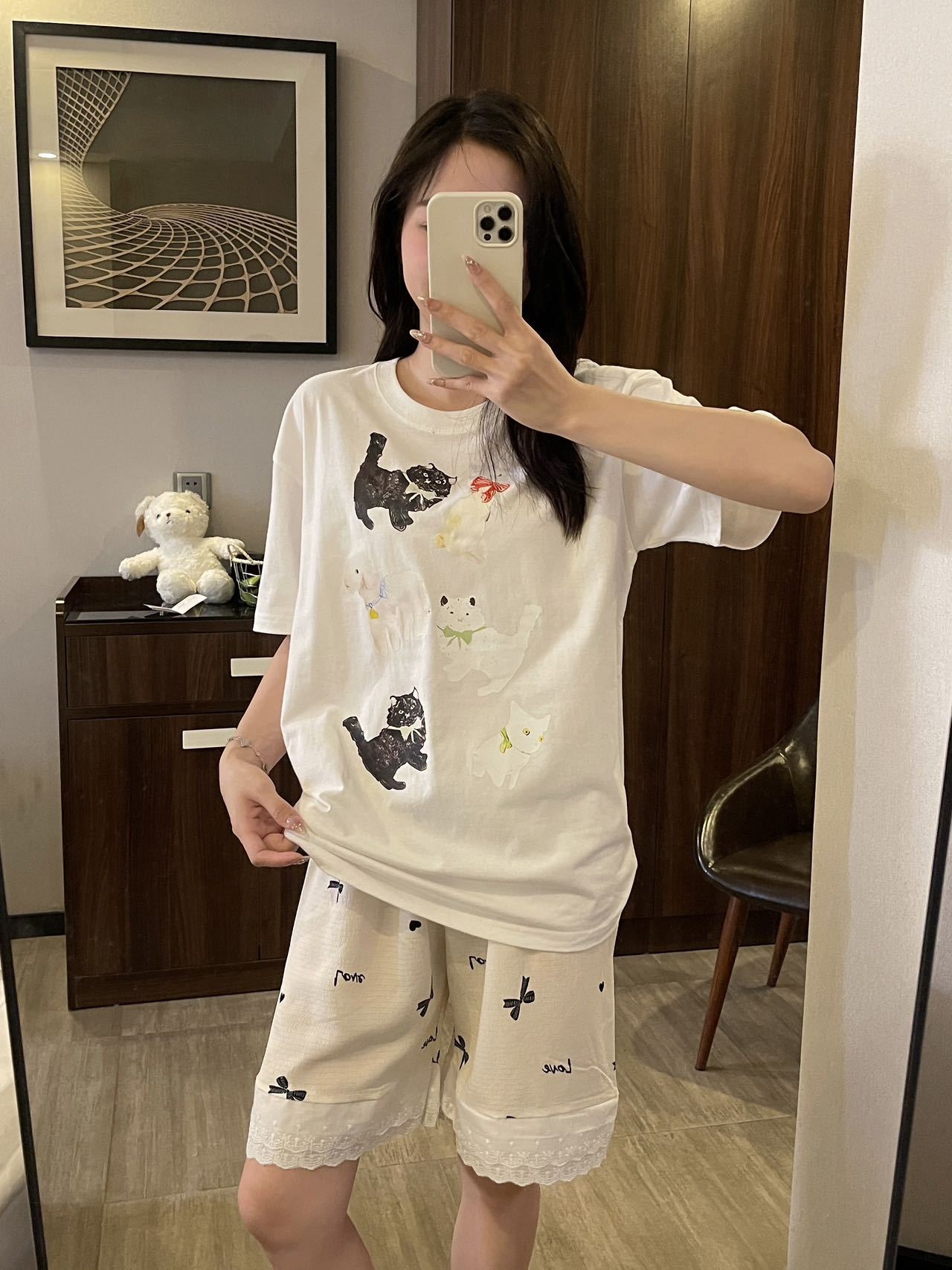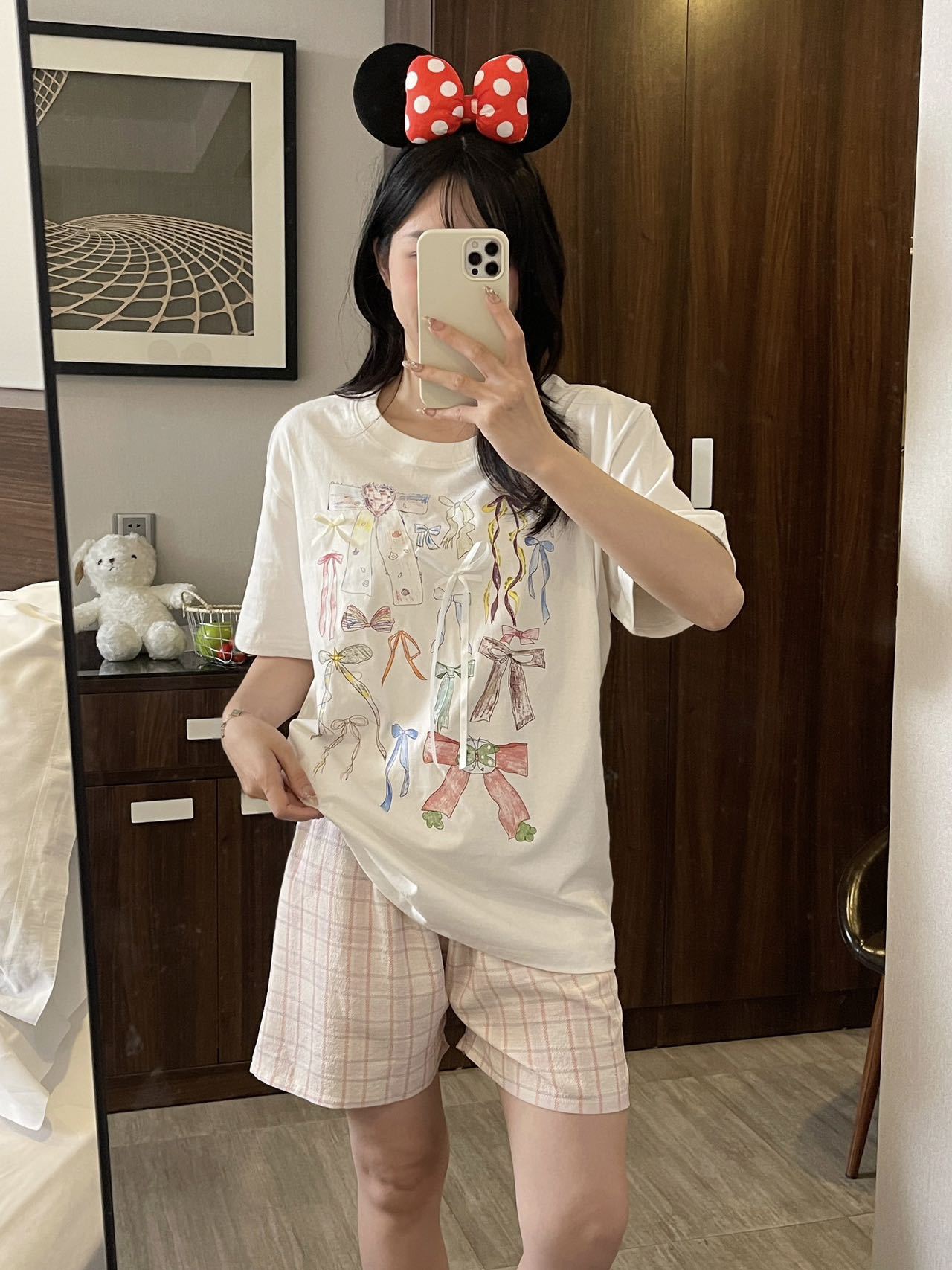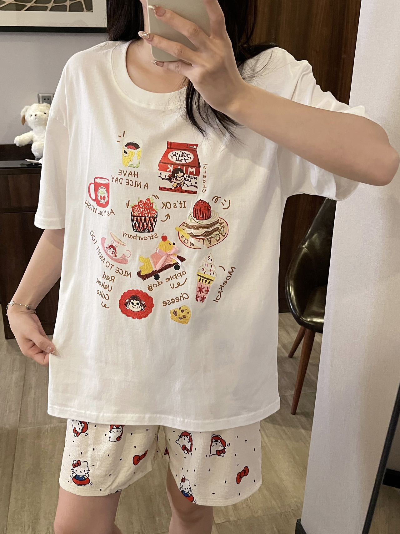 여성을위한 면화 잠옷 여름 새로운 귀여운 만화 격자 무늬 반팔 3 피스 세트 느슨한 얇은 홈웨어 외부에 착용 가능