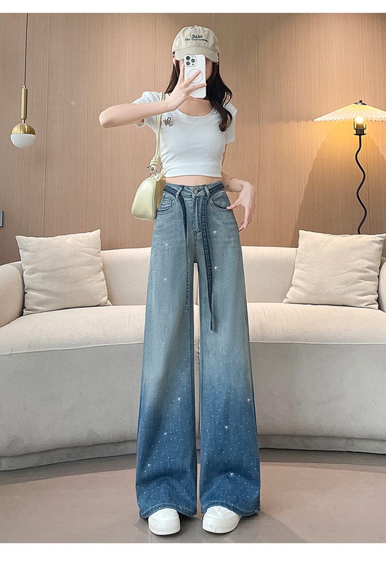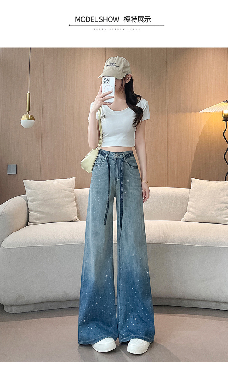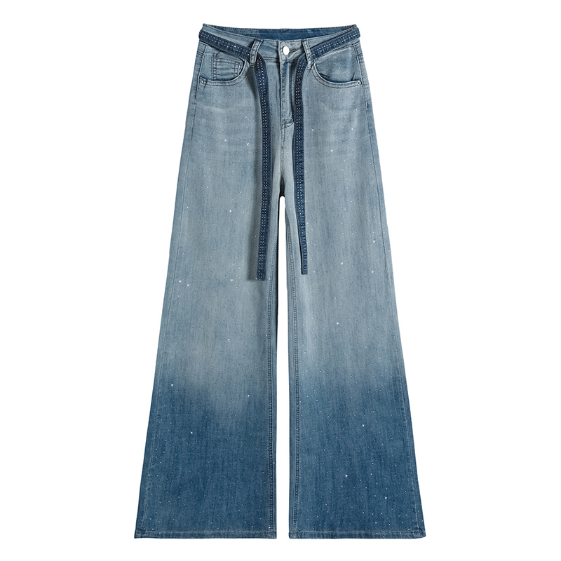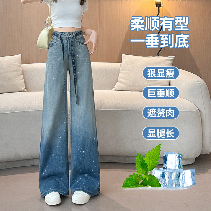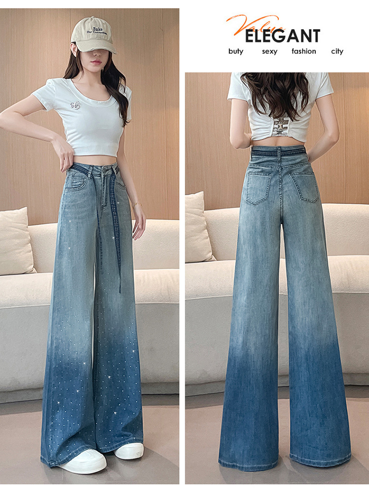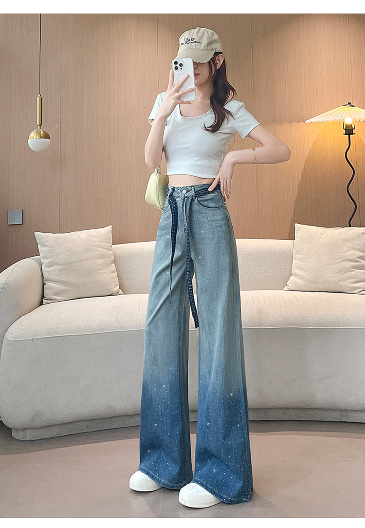 여성을위한 그라디언트 컬러 핫 다이아몬드 스트레이트 청바지 2025 여름 얇은 드로우 스트링 하이 웨이스트 슬리밍 드레이프 와이드 레그 바닥 길이 바지