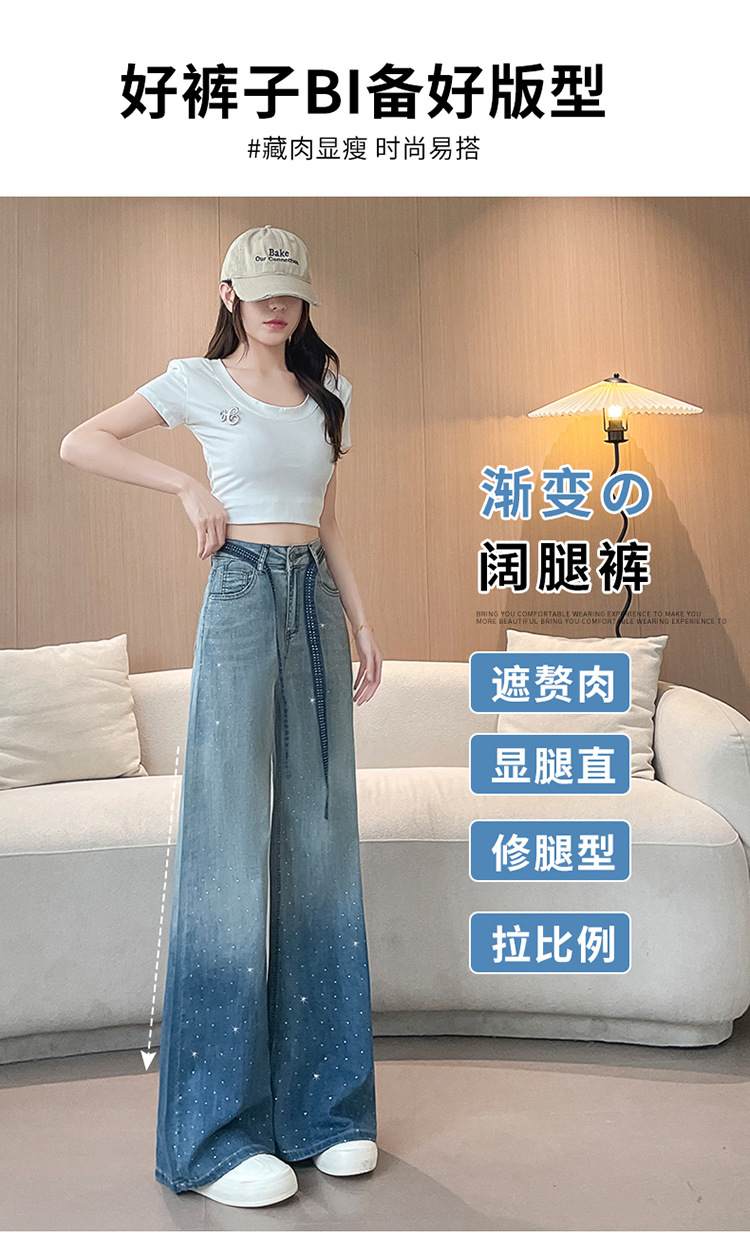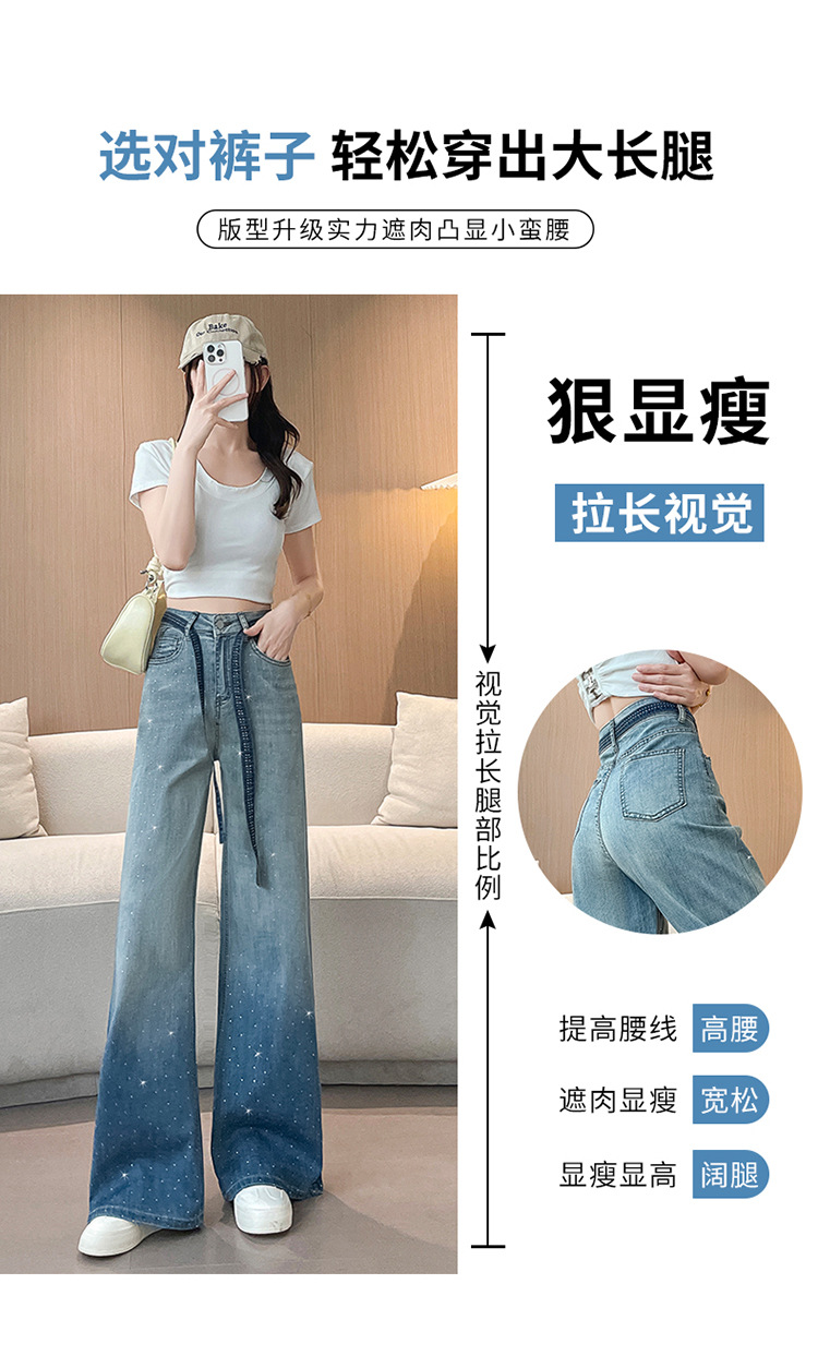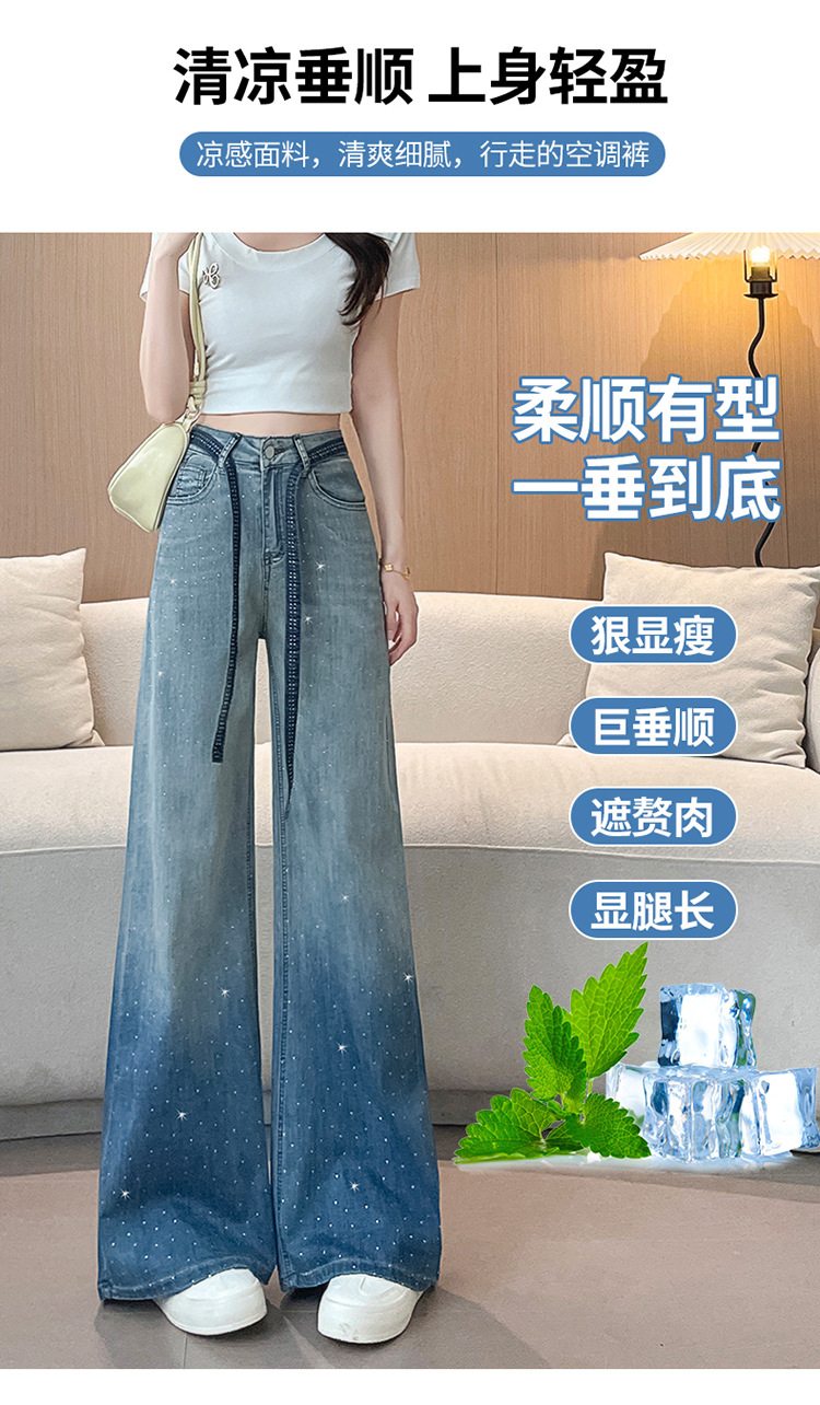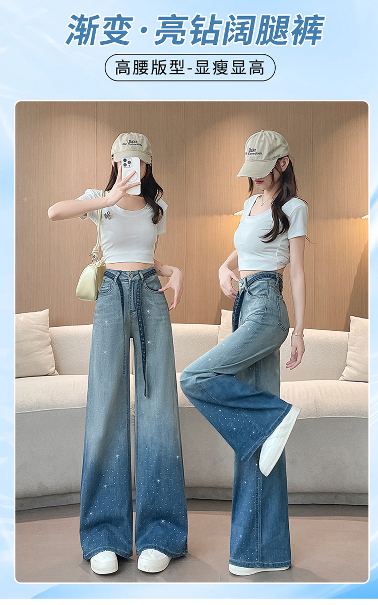 여성을위한 그라디언트 컬러 핫 다이아몬드 스트레이트 청바지 2025 여름 얇은 드로우 스트링 하이 웨이스트 슬리밍 드레이프 와이드 레그 바닥 길이 바지