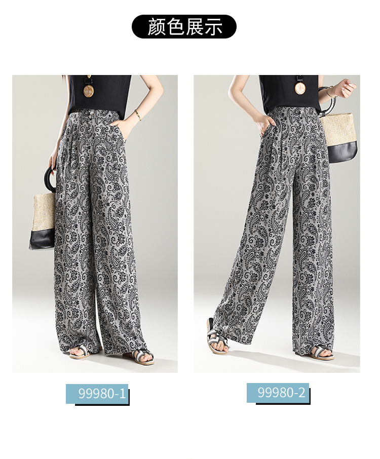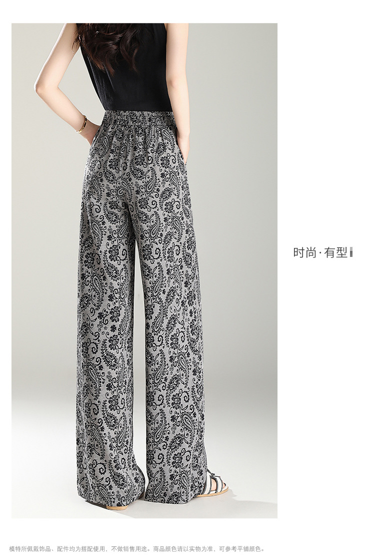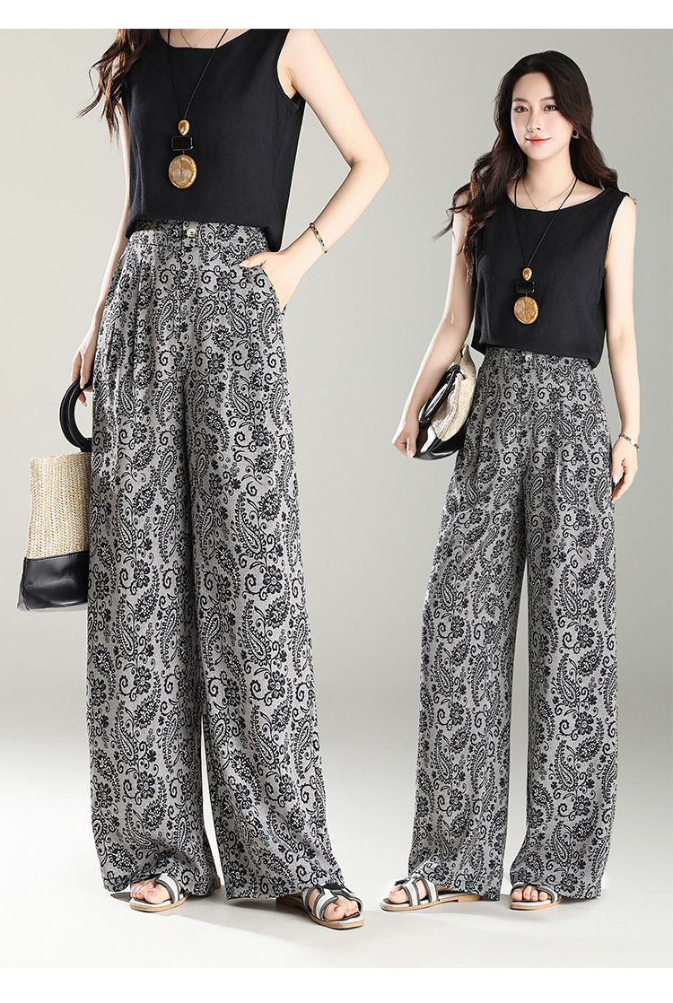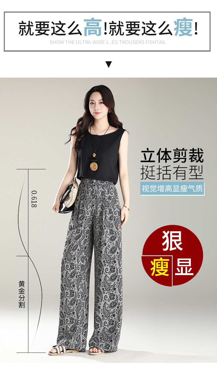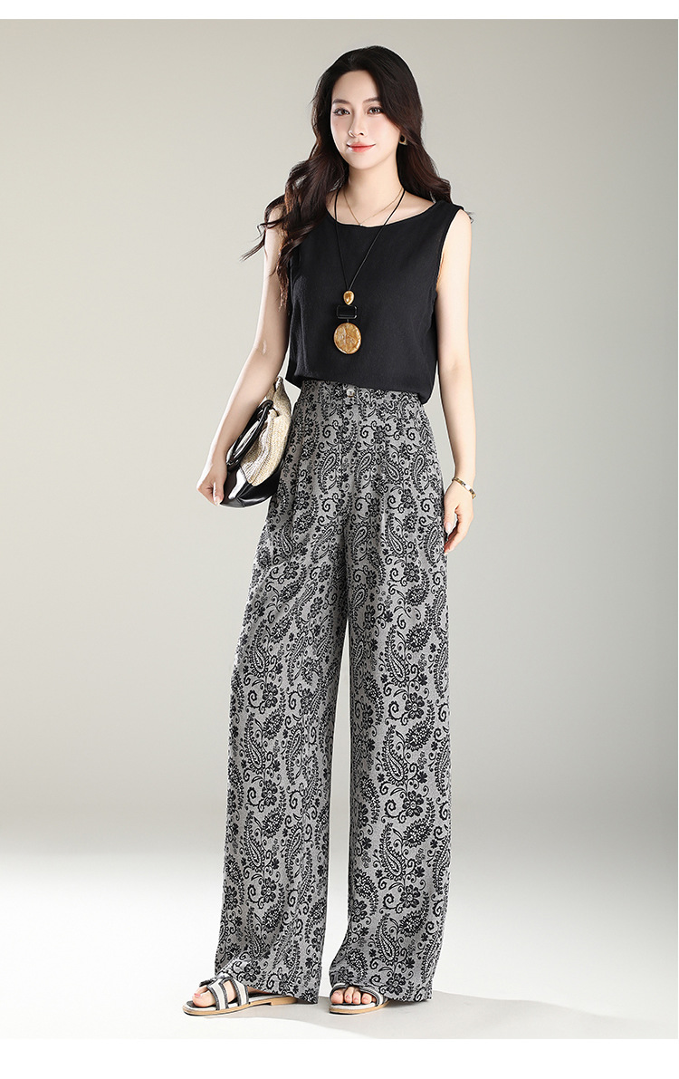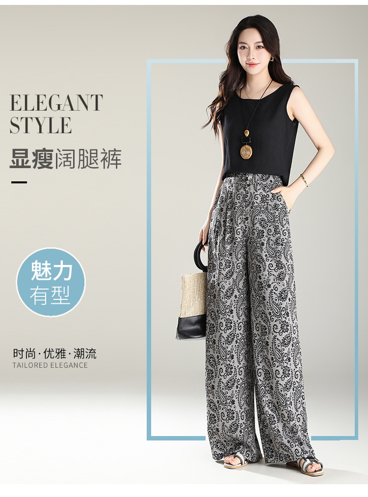시폰 인쇄 캐주얼 바지 2025 여름 뾰족한 허리 좁은 판 슬림 모양 넓은 다리 바지 선량 슬림 스트레이트 바지