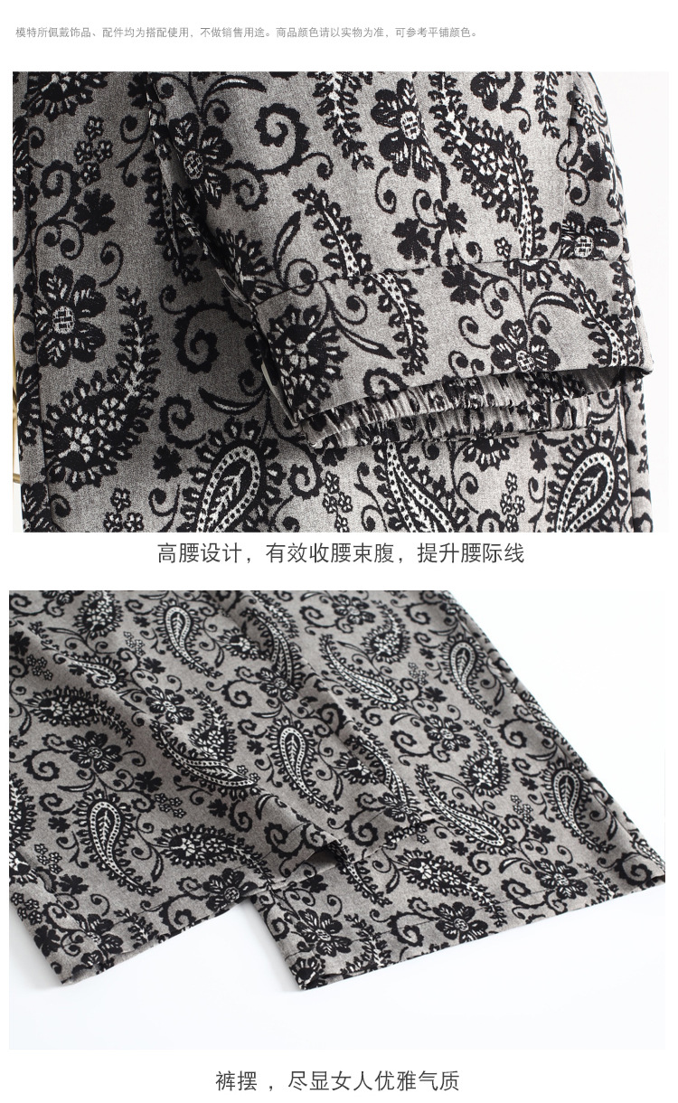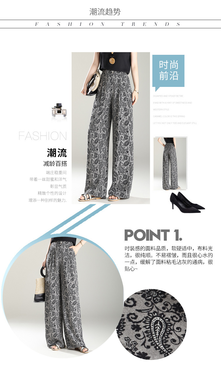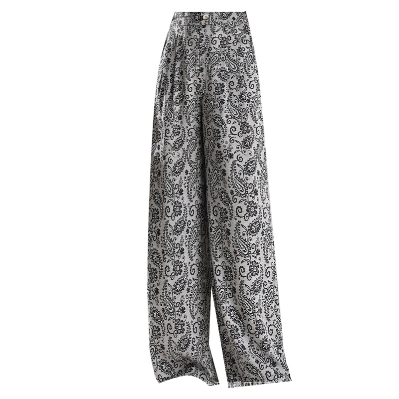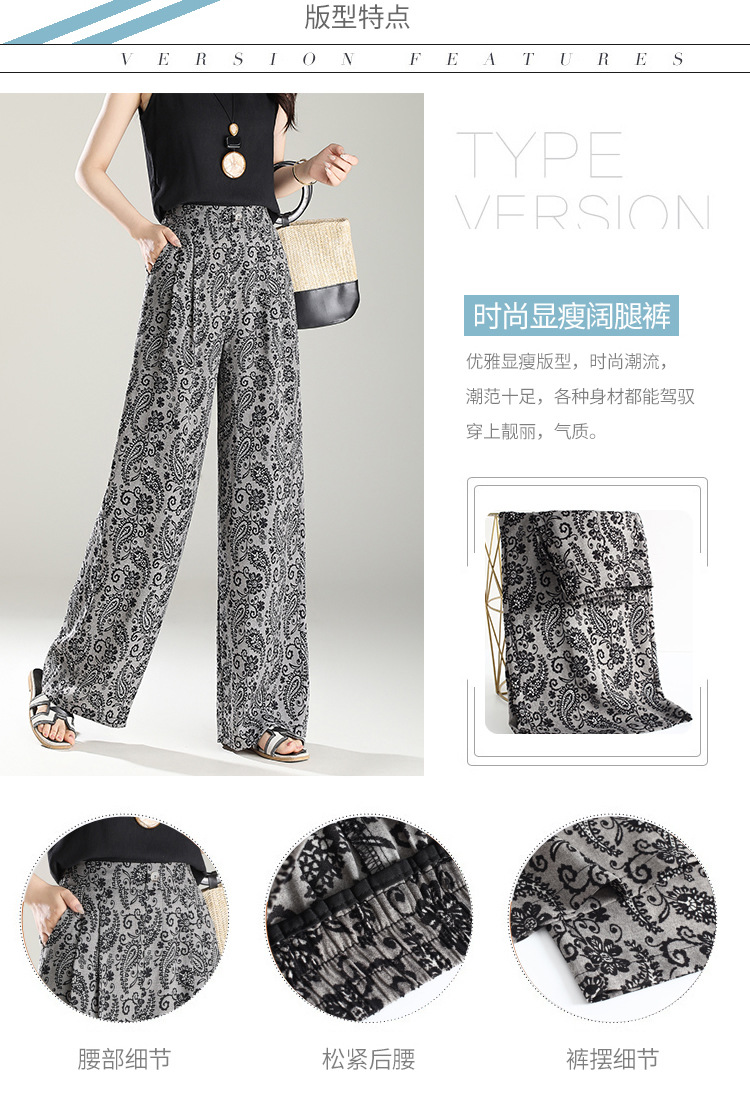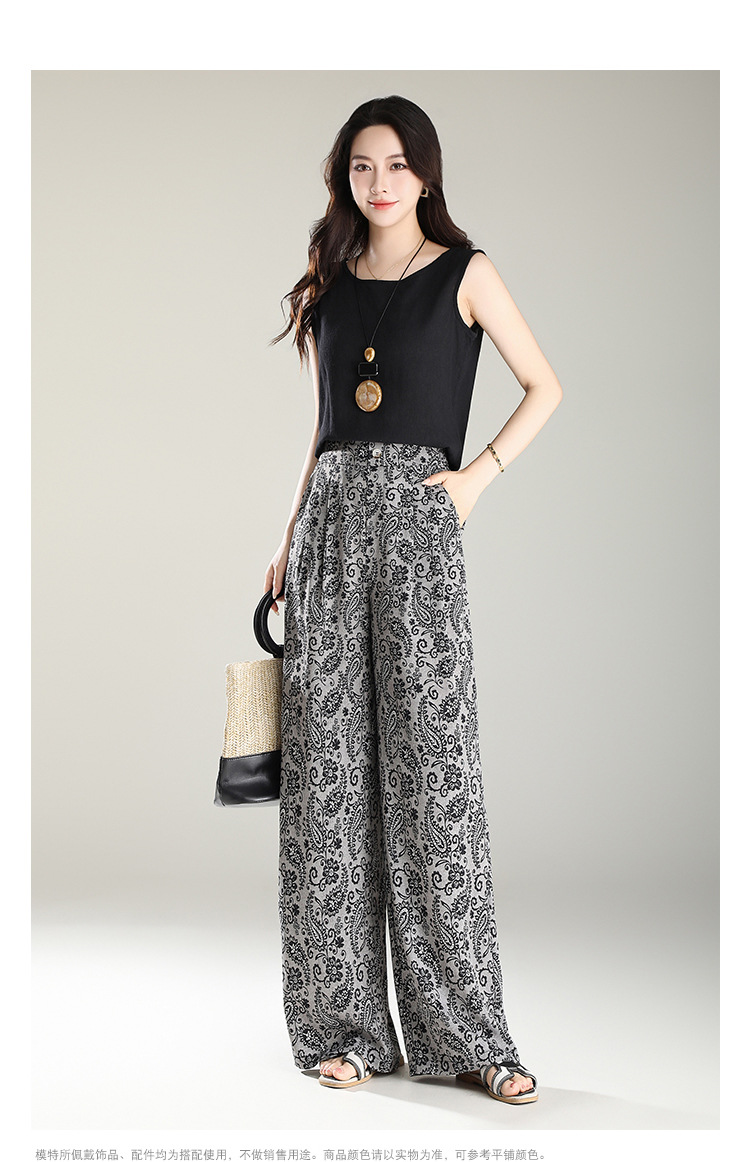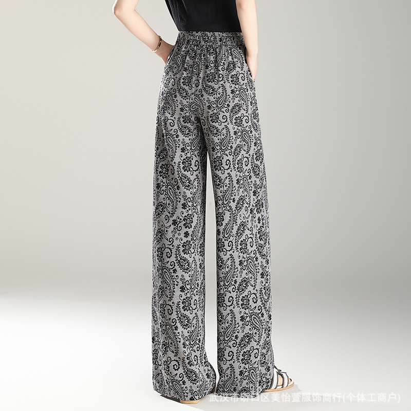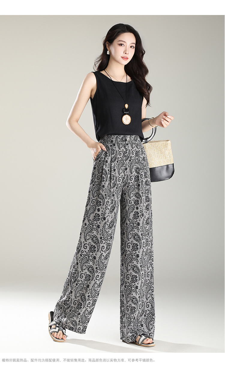 시폰 인쇄 캐주얼 바지 2025 여름 뾰족한 허리 좁은 판 슬림 모양 넓은 다리 바지 선량 슬림 스트레이트 바지