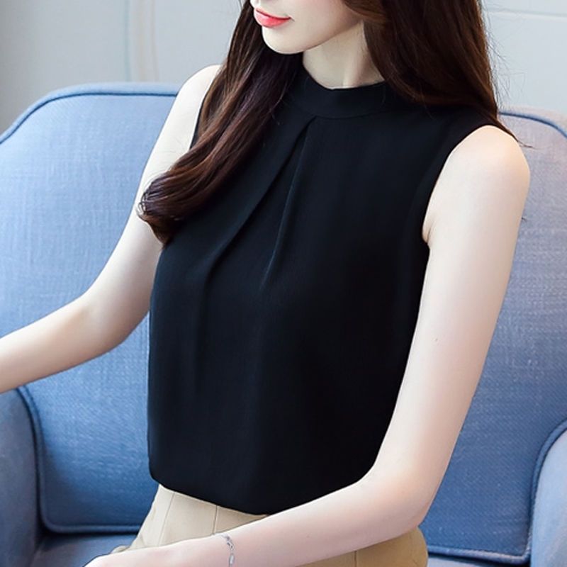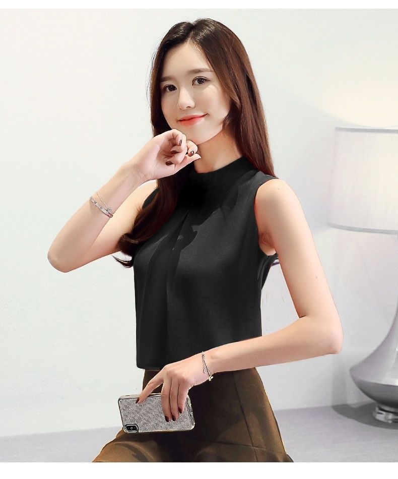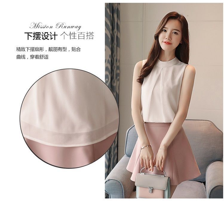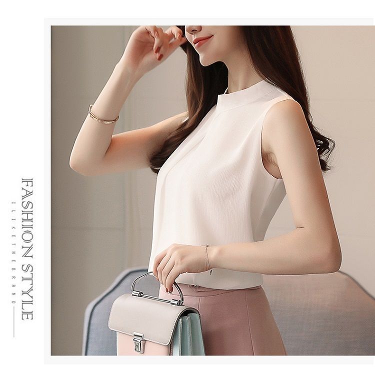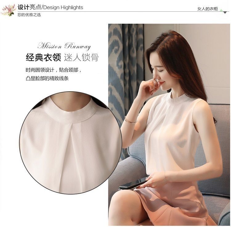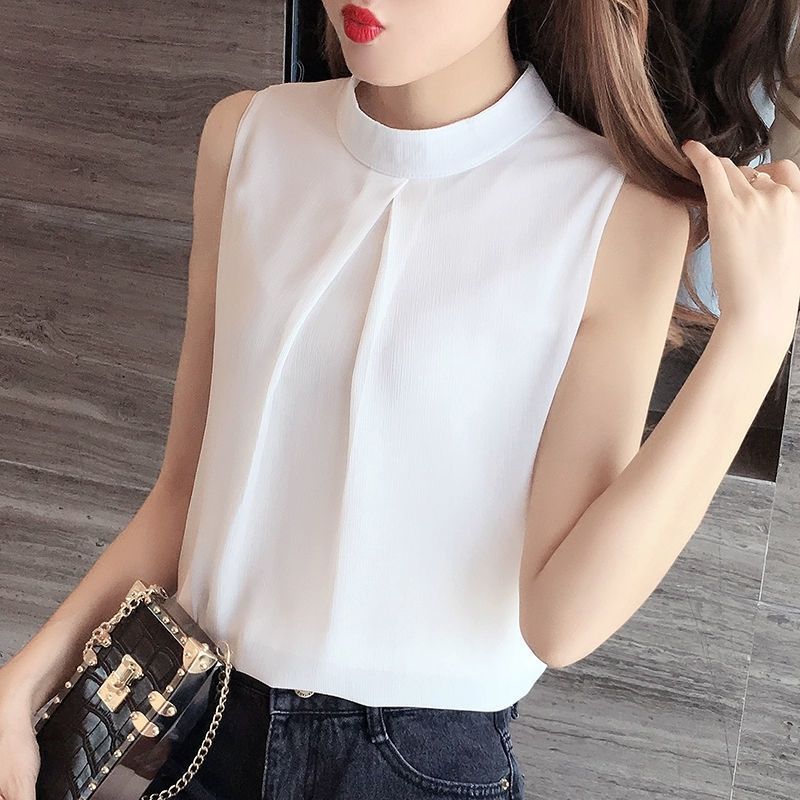 여성용 화이트 민소매 셔츠 여름 한국 스타일 슬림 OL 전문 통근 라운드 넥 셔츠 쉬폰 탑 베이스