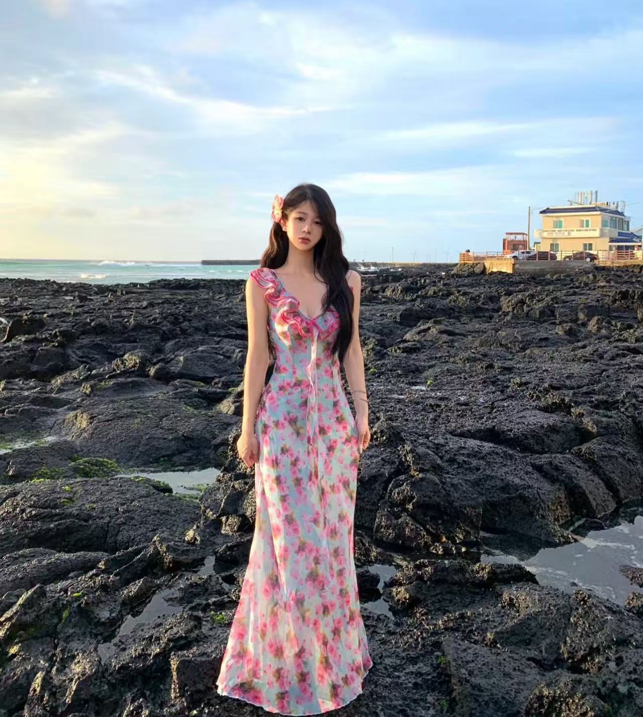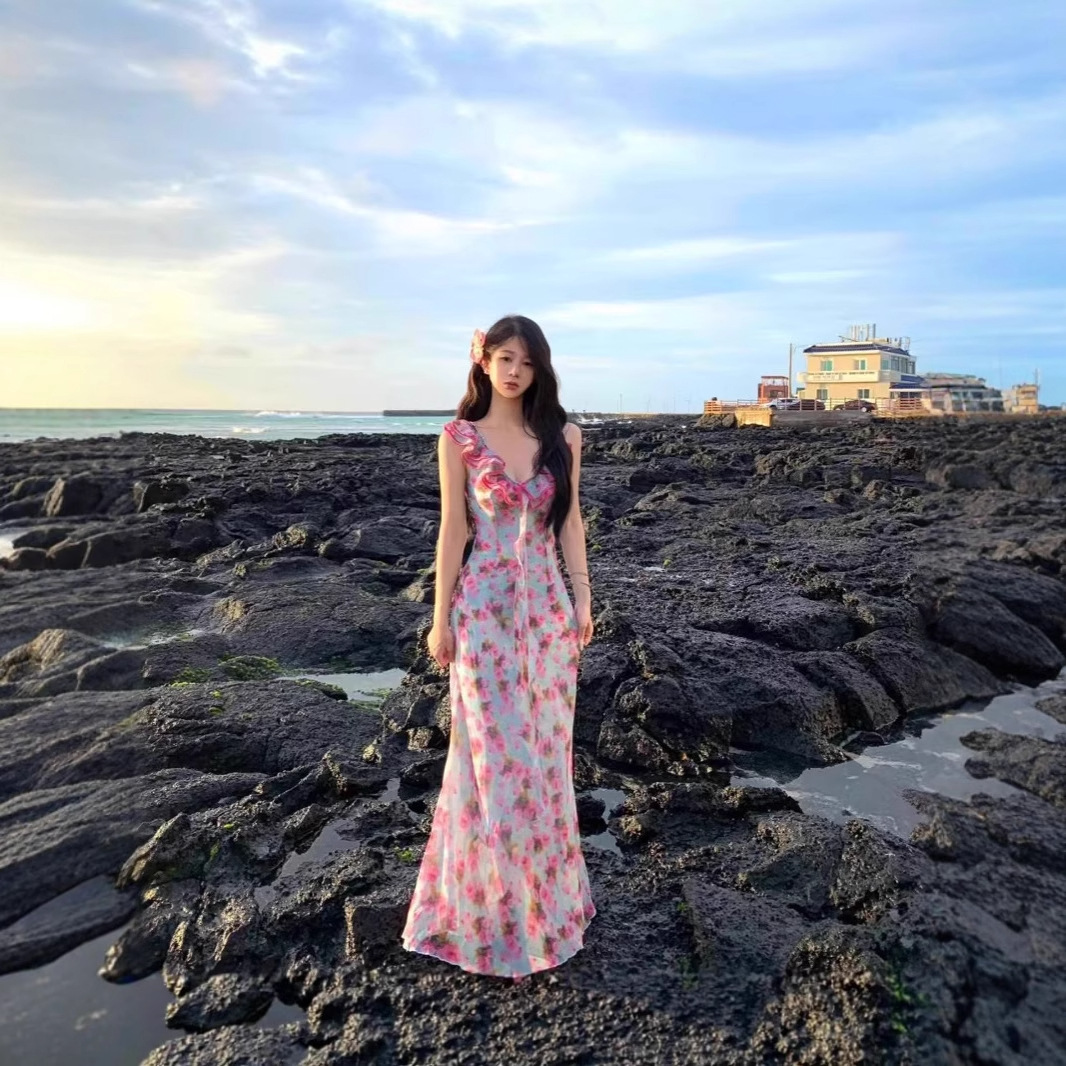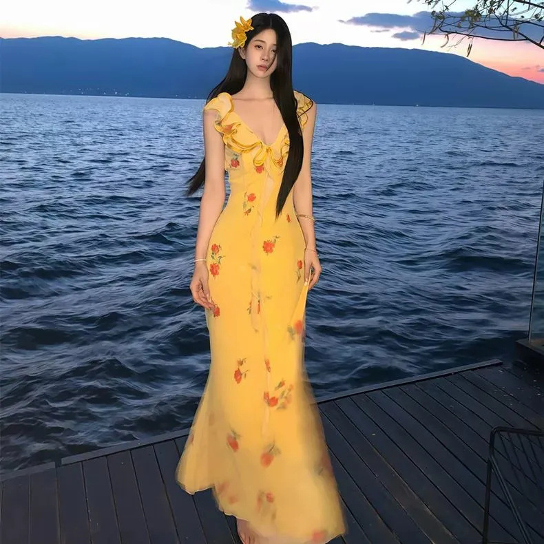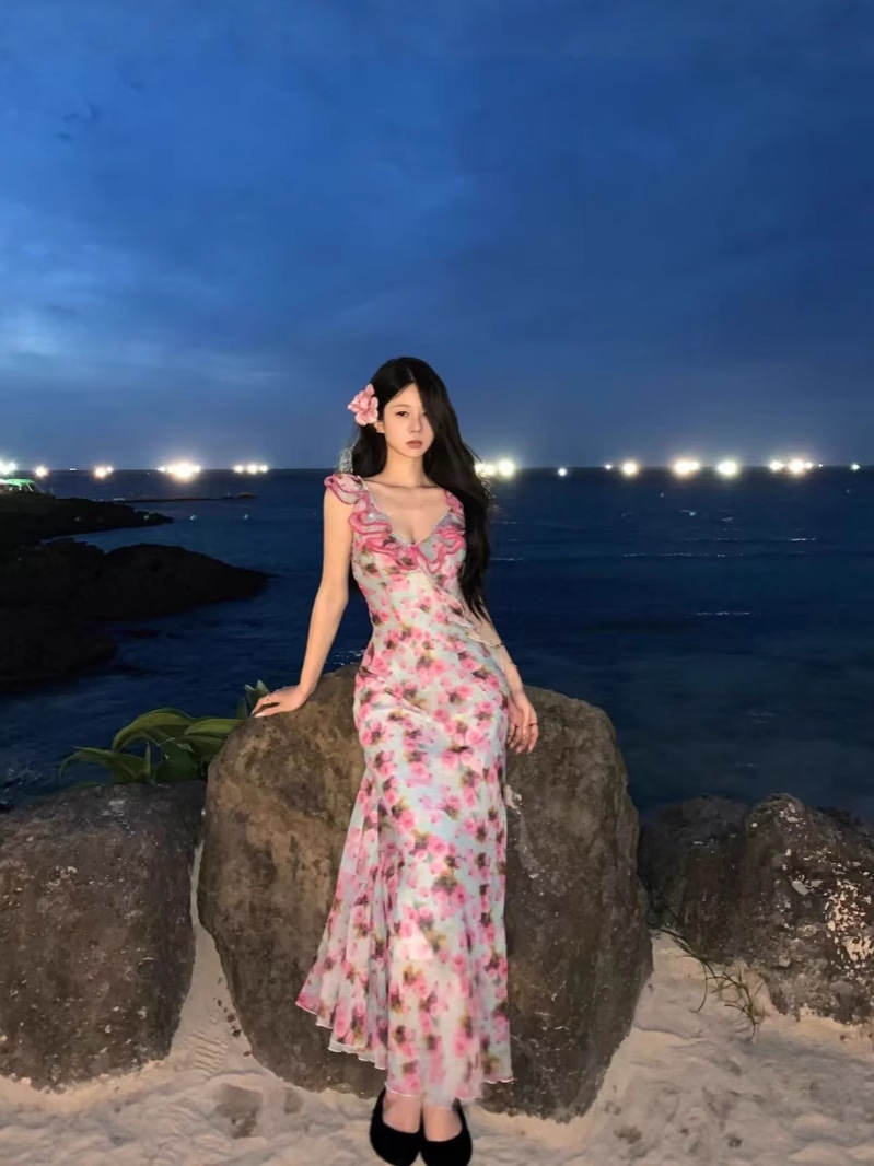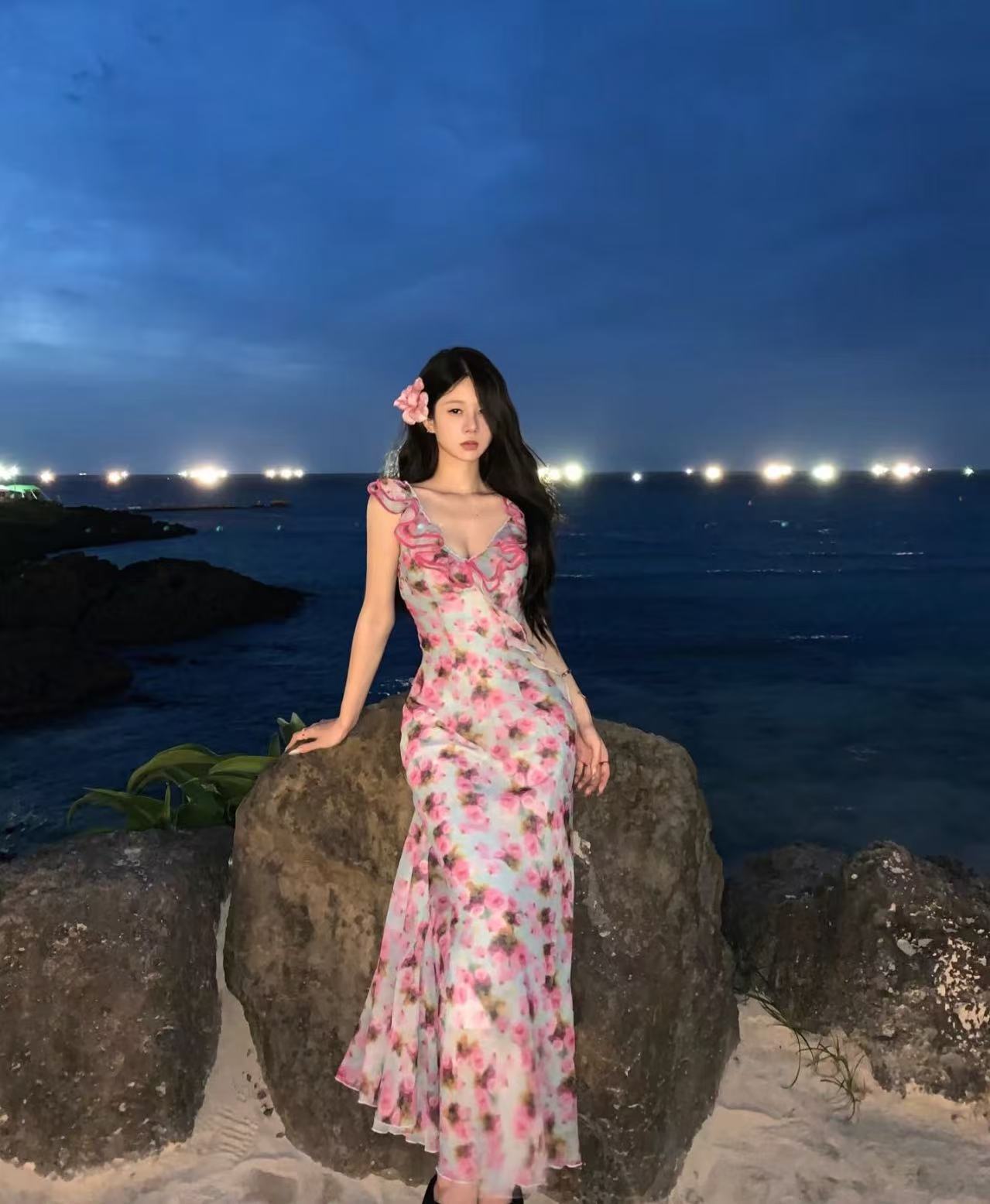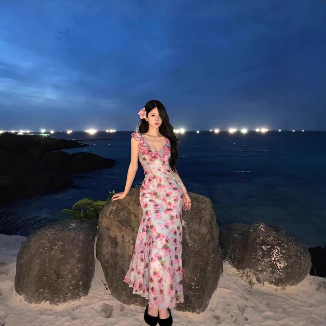 프렌치 황혼 장미 브이넥 허리 섹시 슬림 꽃무늬 드레스 아일랜드 리조트 스타일 피쉬테일 롱 스커트