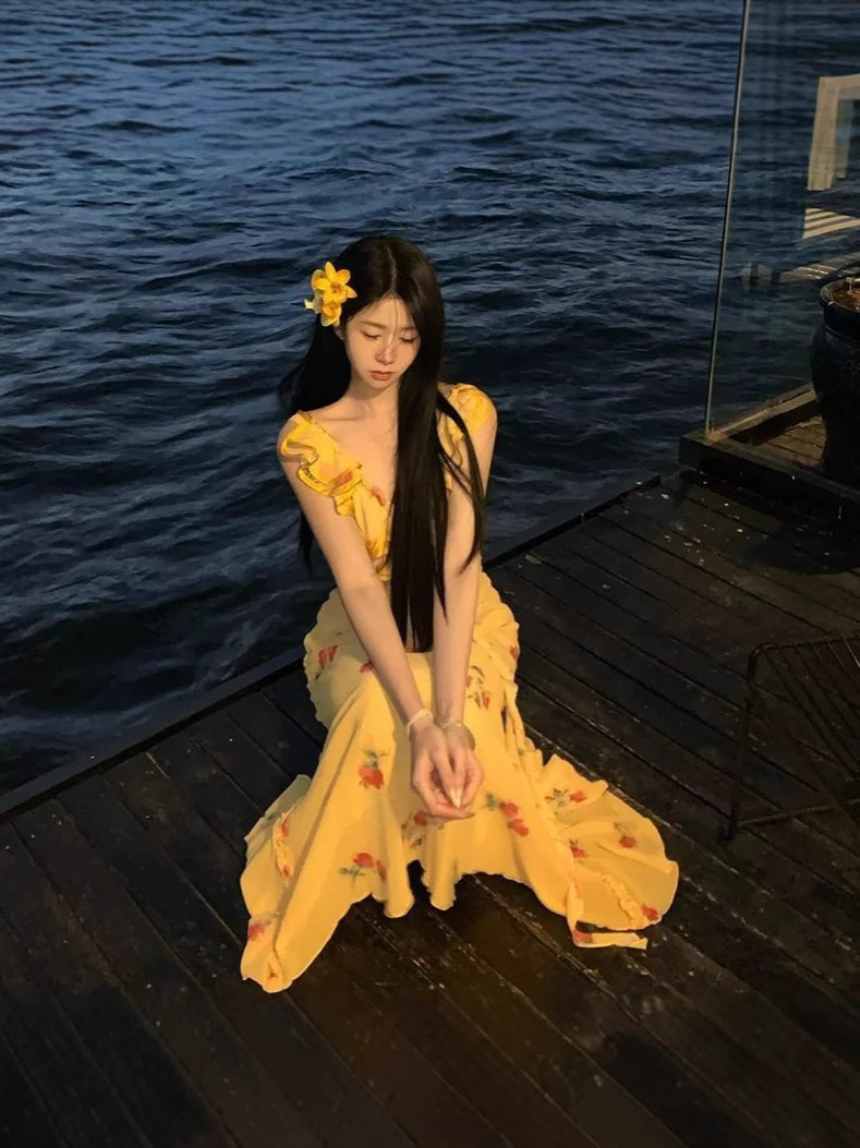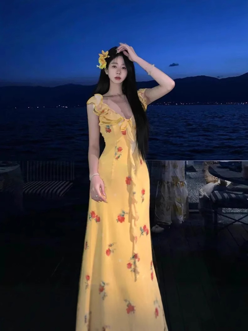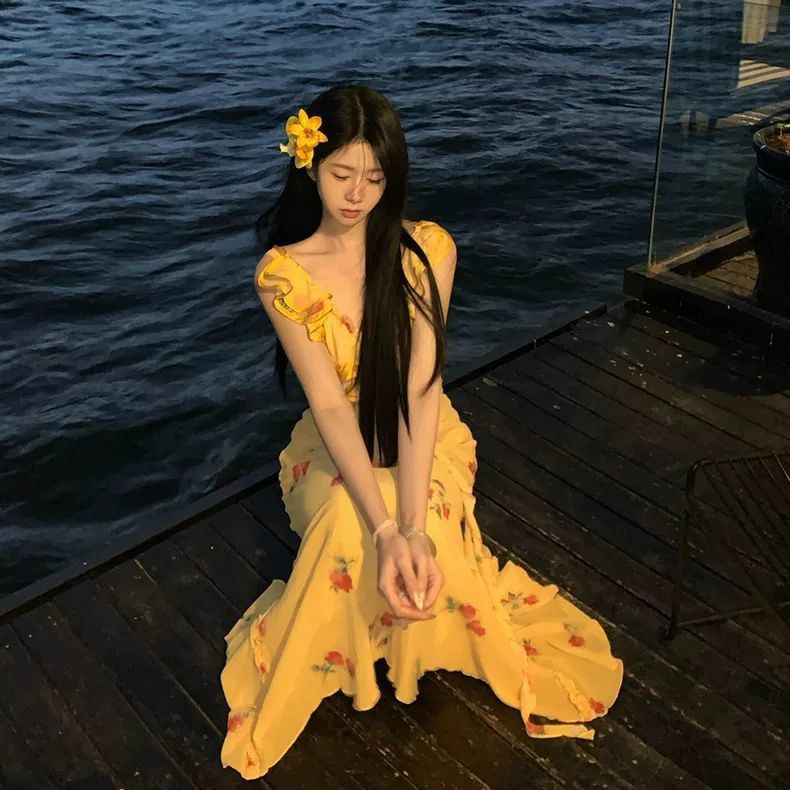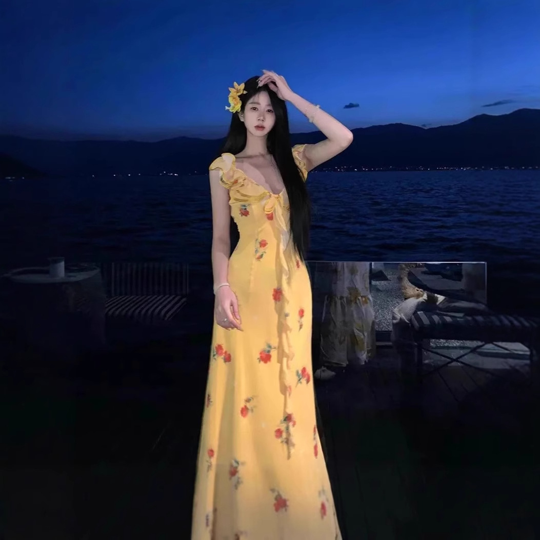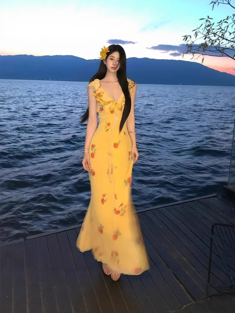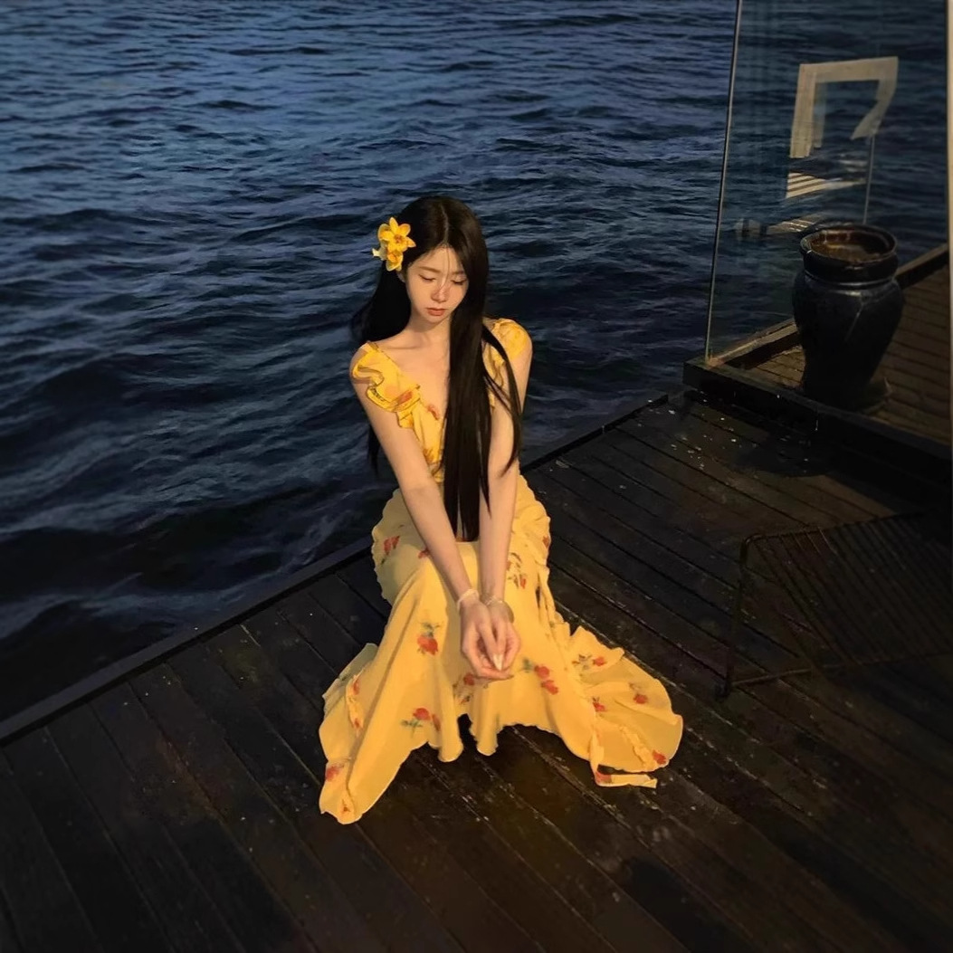 프렌치 황혼 장미 브이넥 허리 섹시 슬림 꽃무늬 드레스 아일랜드 리조트 스타일 피쉬테일 롱 스커트