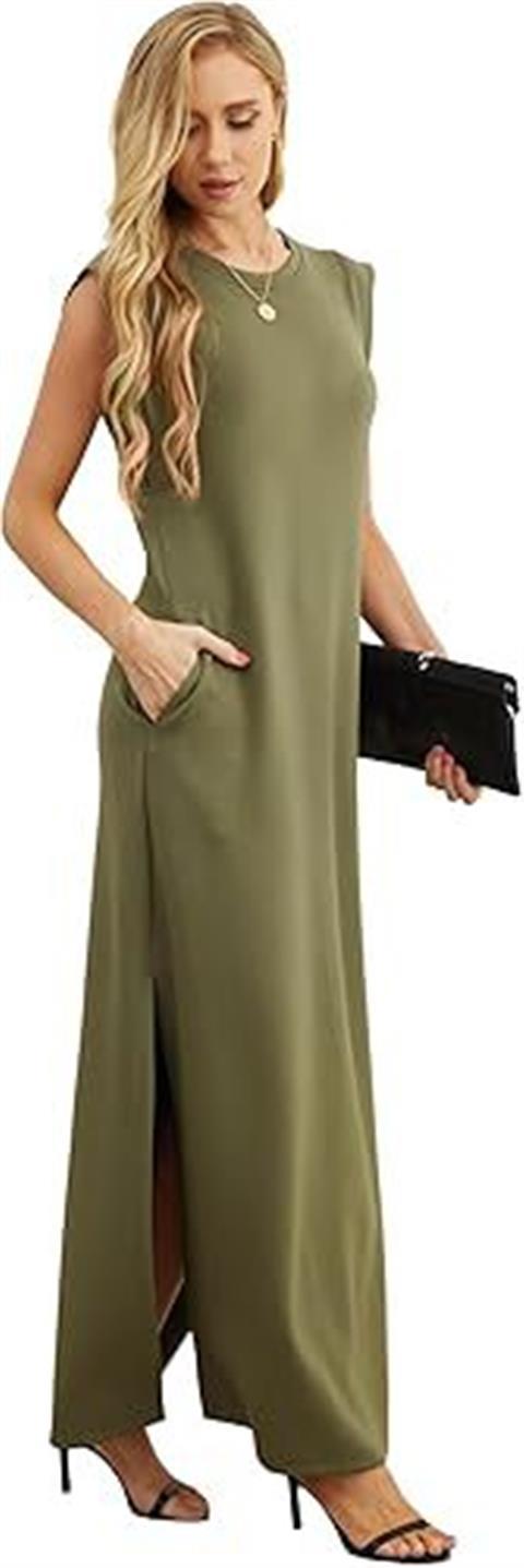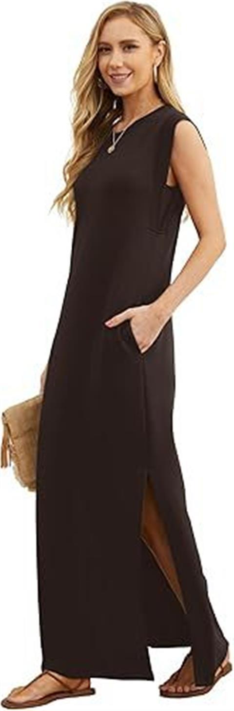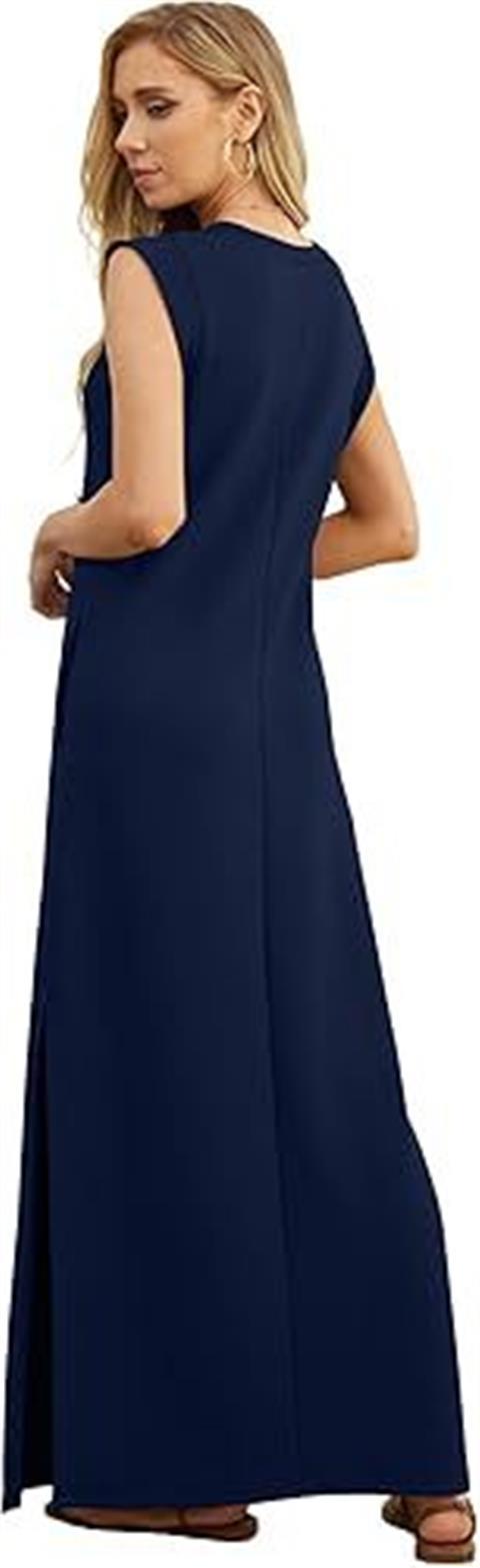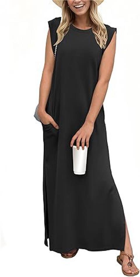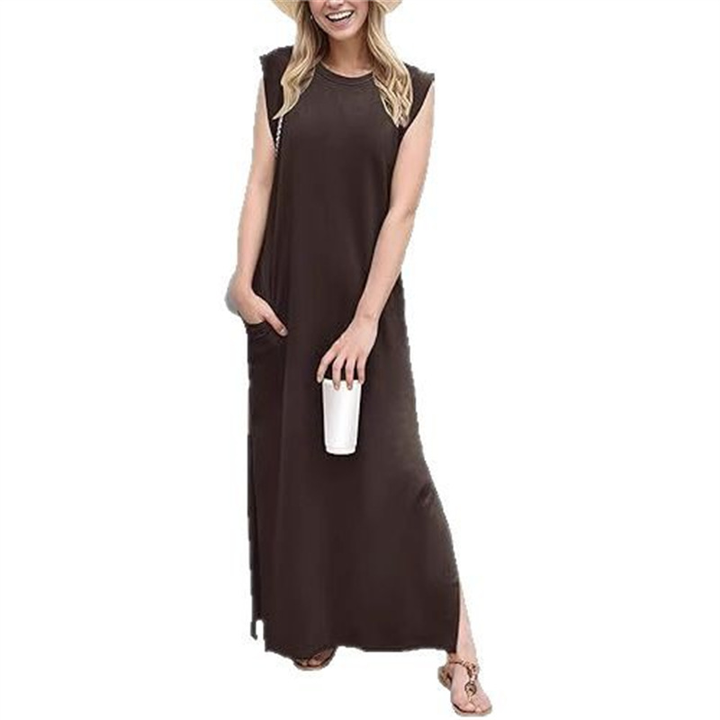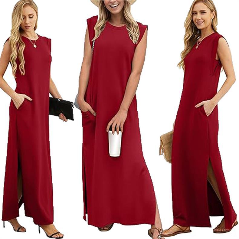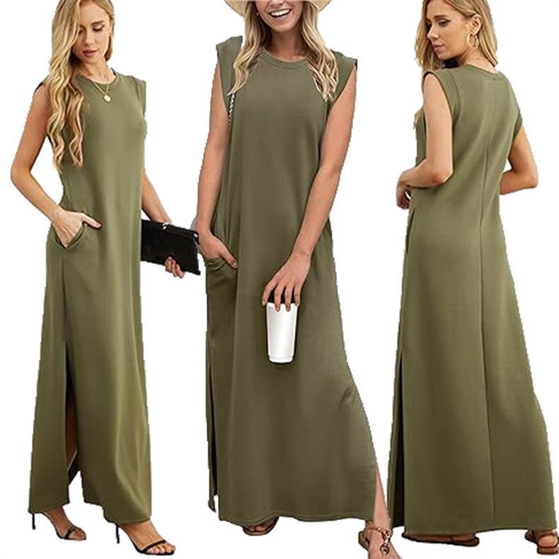 유럽과 미국의 국경 간 아마존 여성 캐주얼 민소매 라운드 넥 느슨한 슬릿 주름없는 긴 해변 포켓 드레스