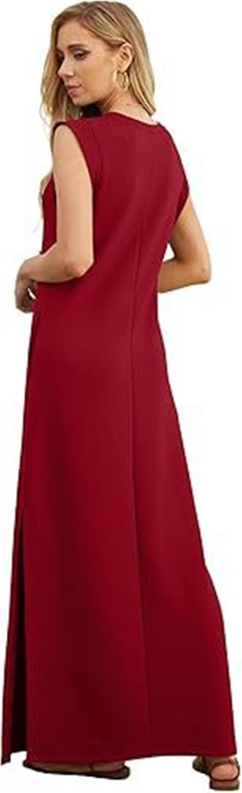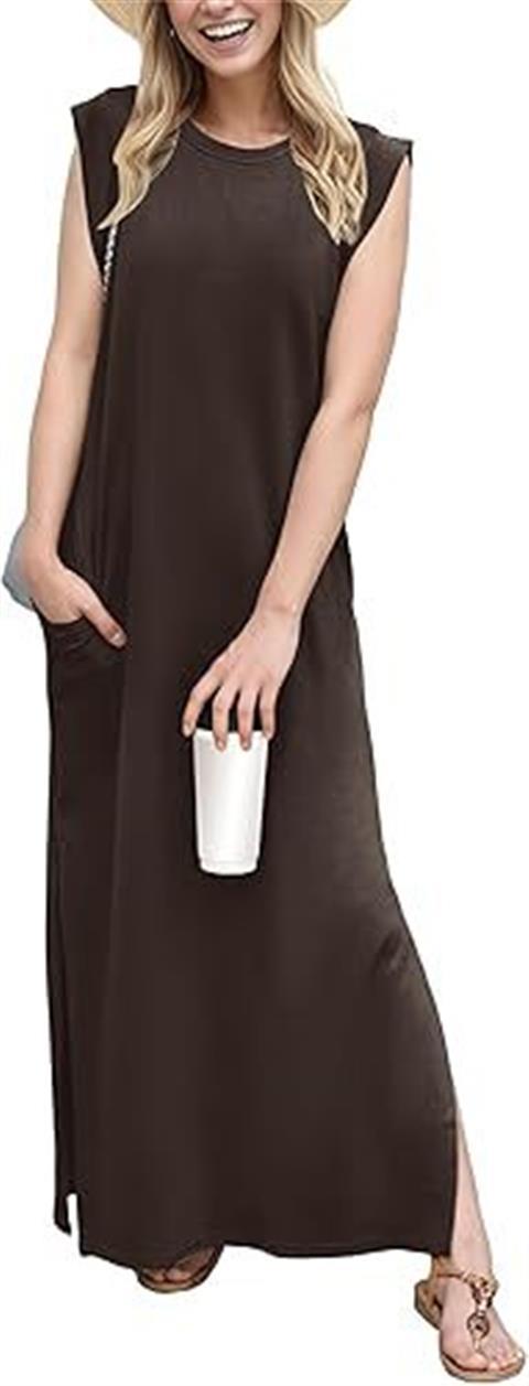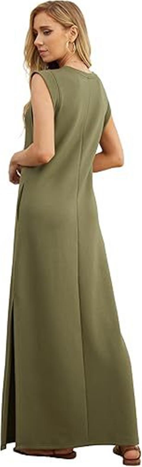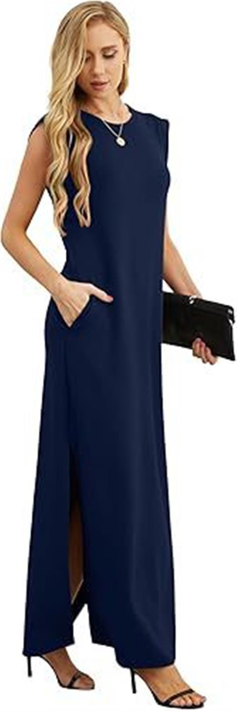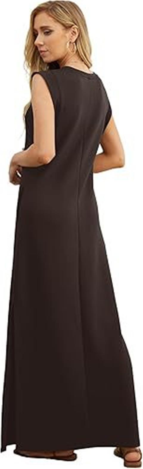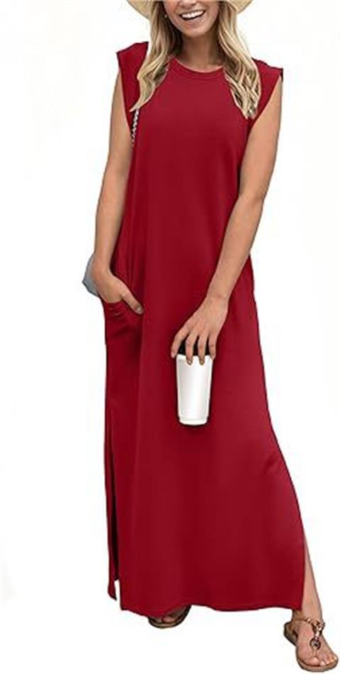 유럽과 미국의 국경 간 아마존 여성 캐주얼 민소매 라운드 넥 느슨한 슬릿 주름없는 긴 해변 포켓 드레스