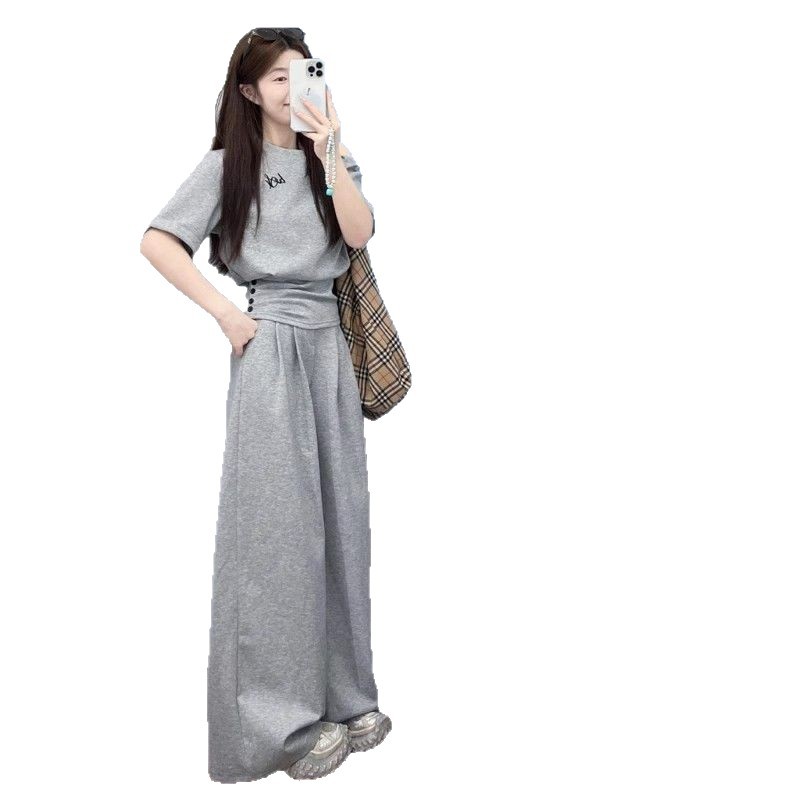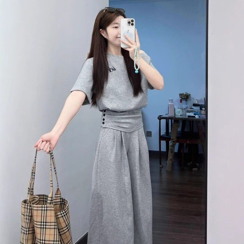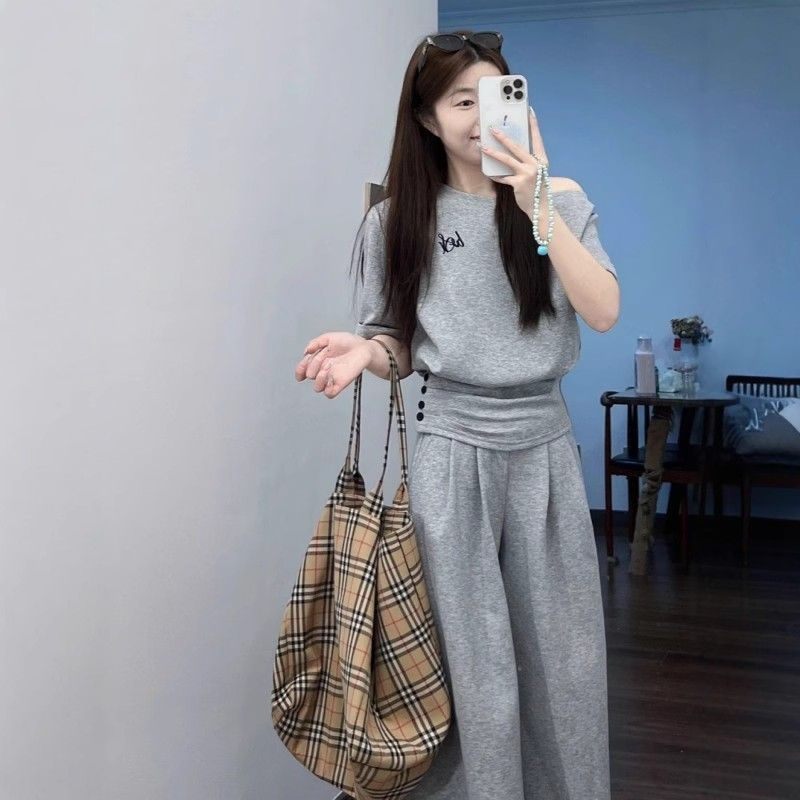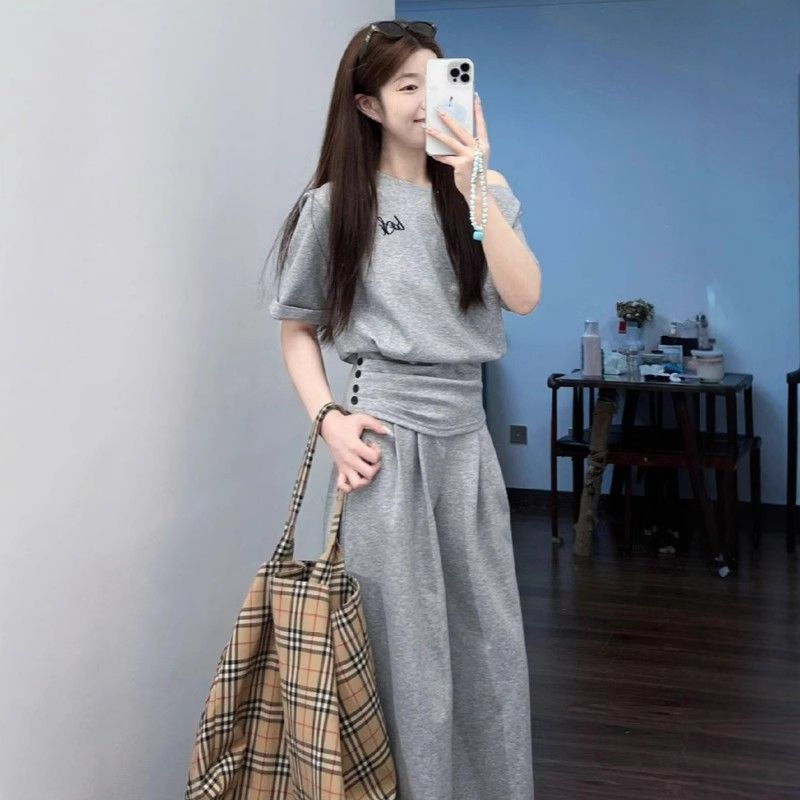 여성용 캐주얼 스포츠 스타일 슈트, 신상 여름 스타일 허리 슬랜트 숄더 탑, 하이웨이스트 와이드 팬츠 투피스 트렌디 세트