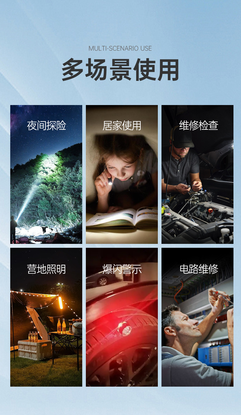 10.远离易燃物:在使用本品时,尤其是长时间开启高亮度模式,灯头部位可能会产生一定热量。使用过程中,要远离纸张、布料、干草等易燃物品,避免因热量积聚引发火灾。
