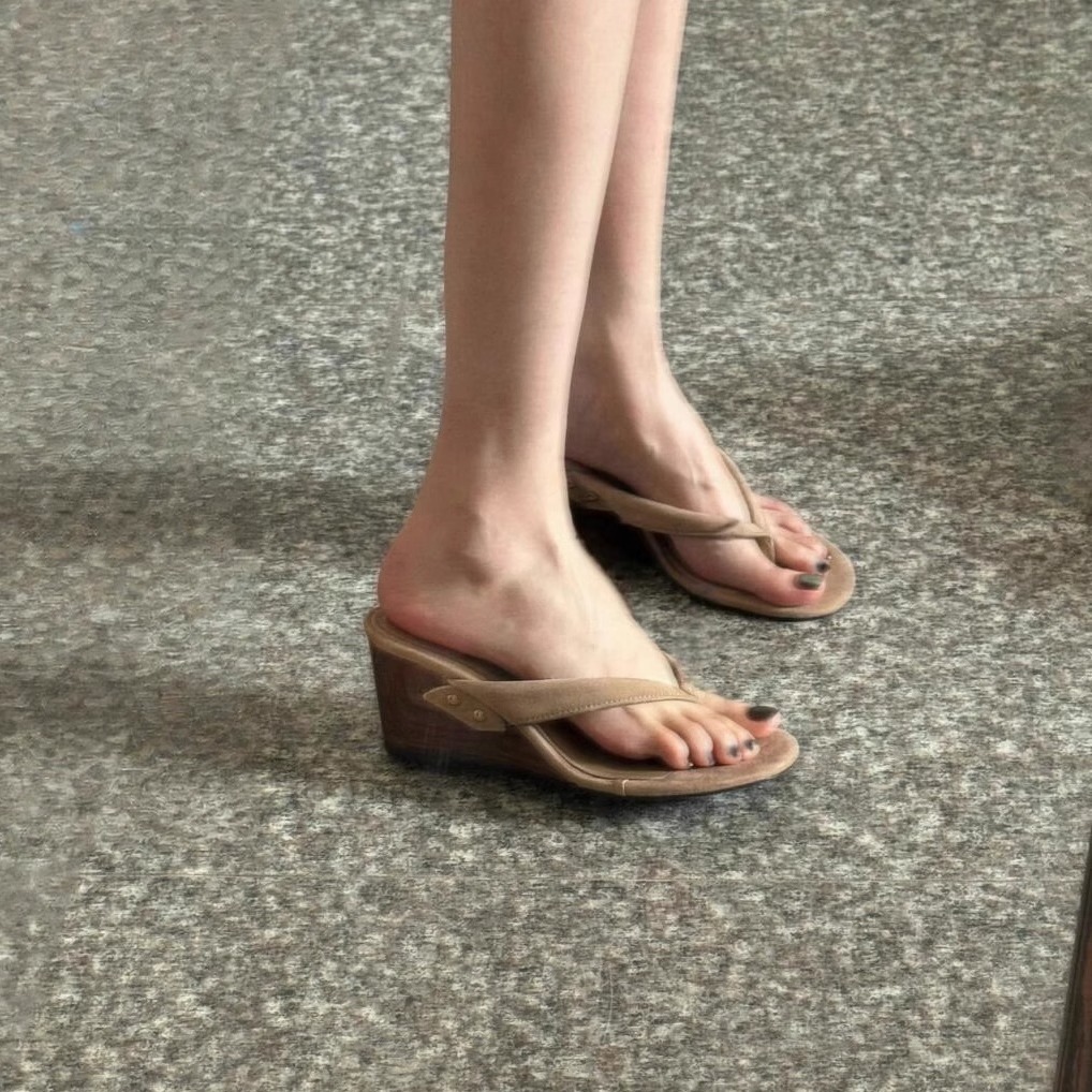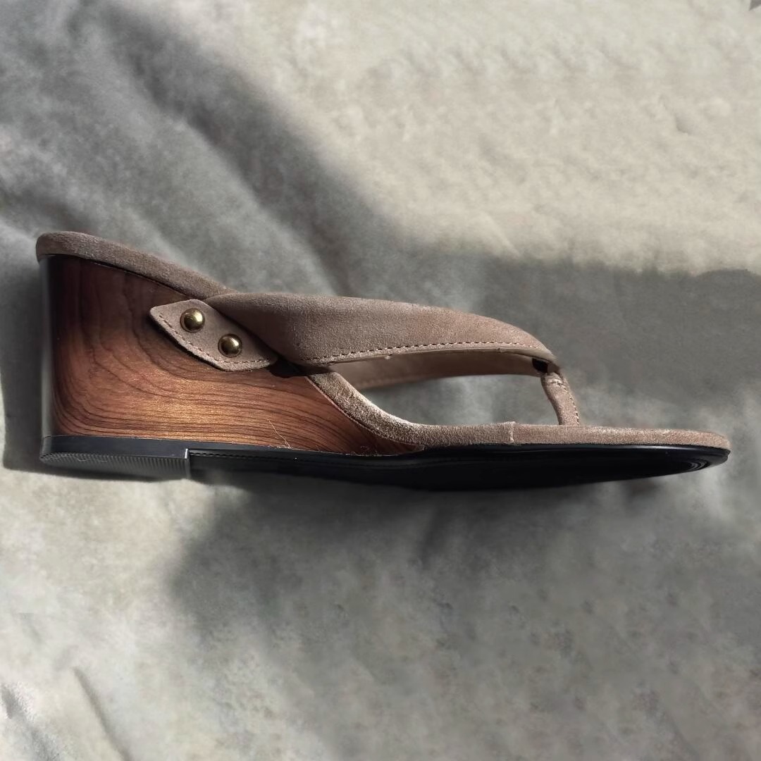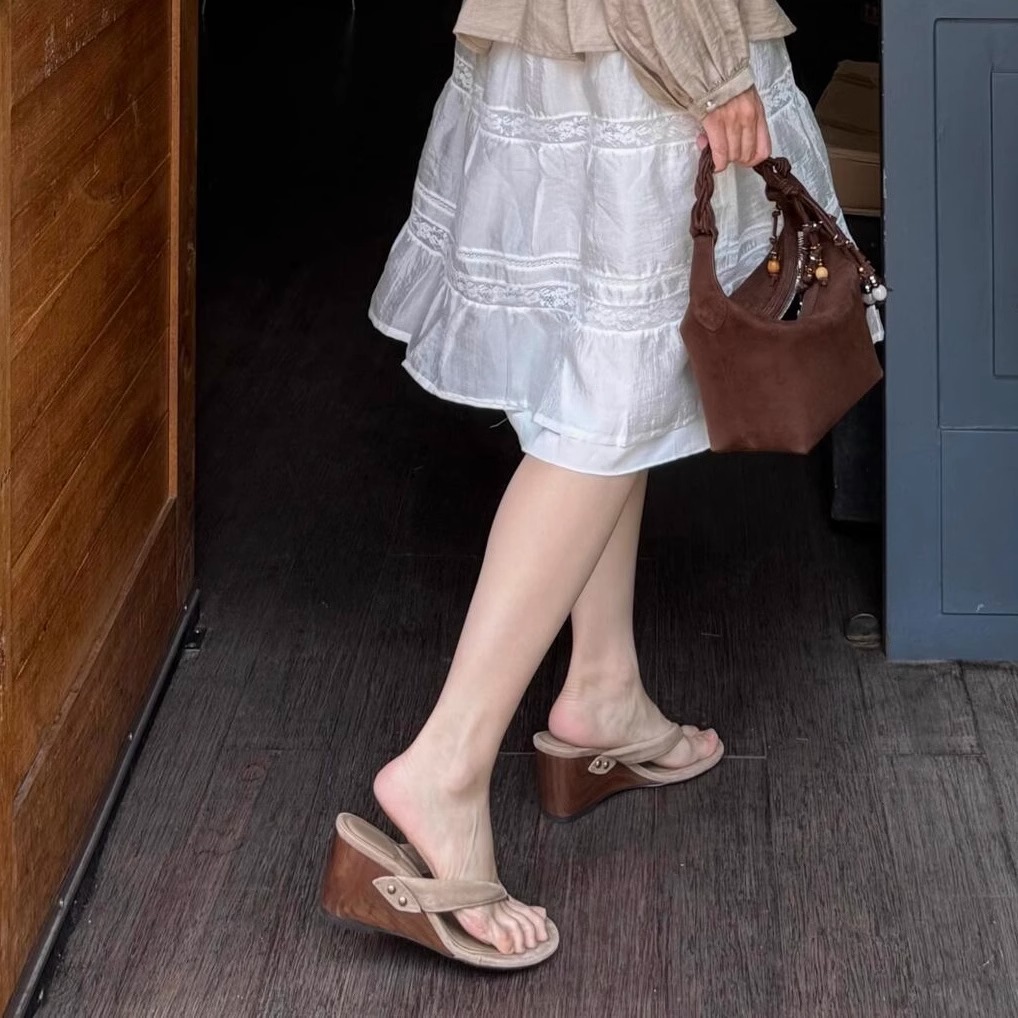 재고 있음 ~ 레트로 우드 그레인 웨지 하이힐 슬리퍼 여성 여름 리벳 두꺼운 밑창 하프 슬리퍼 작은 샌들