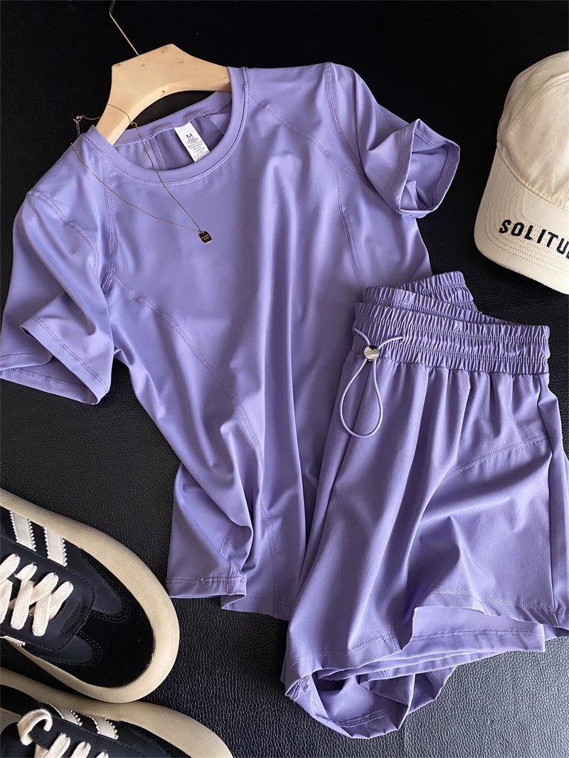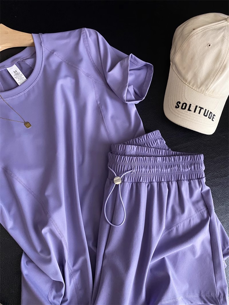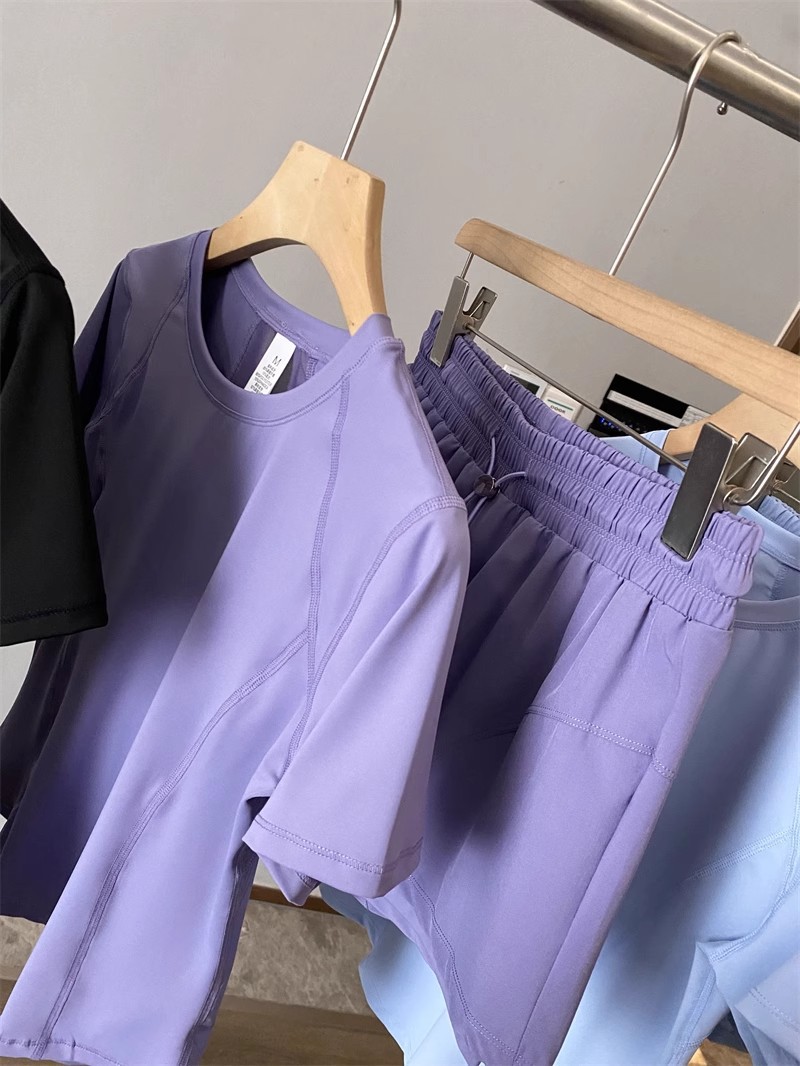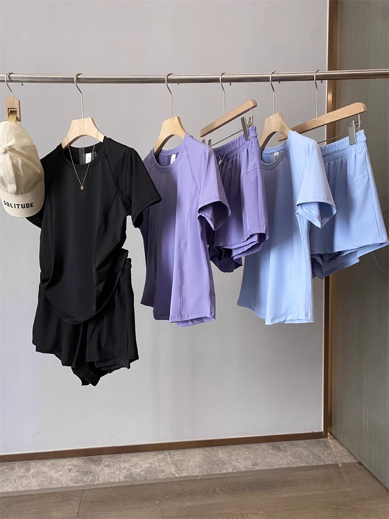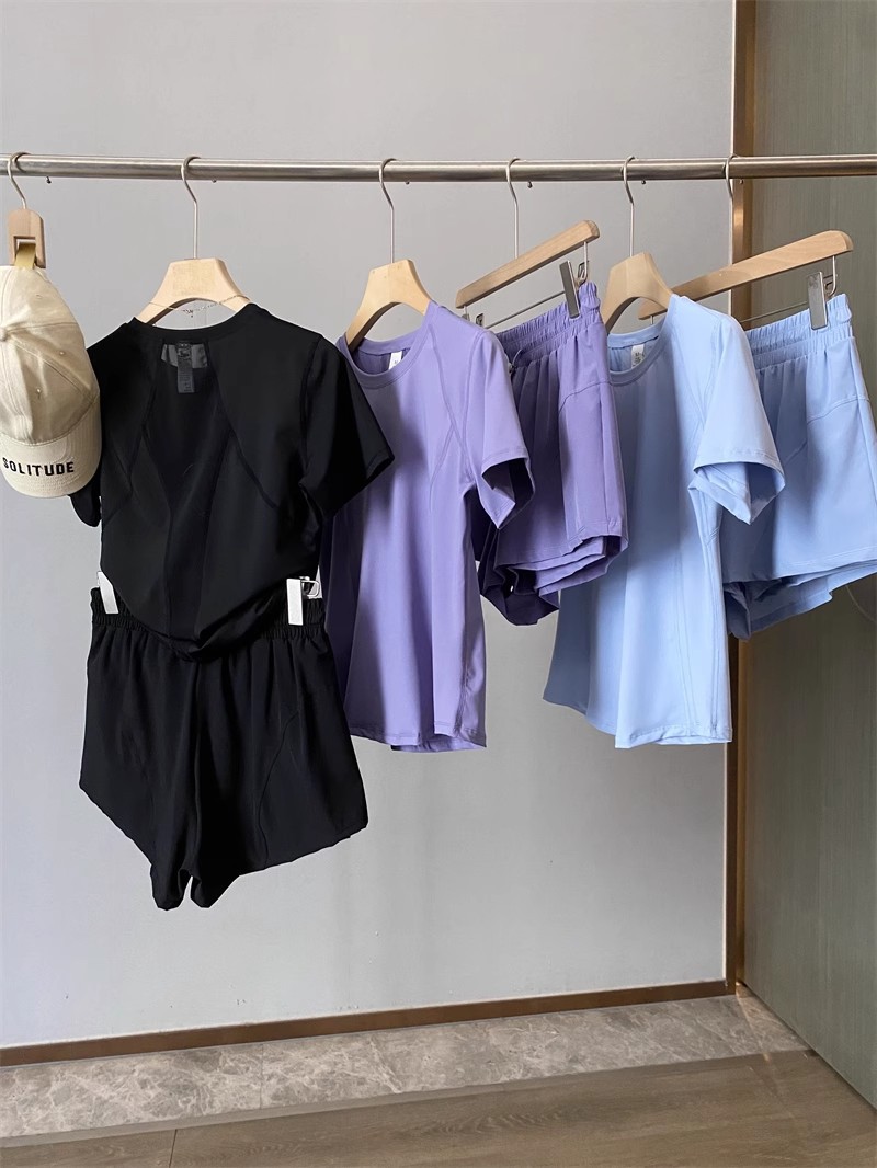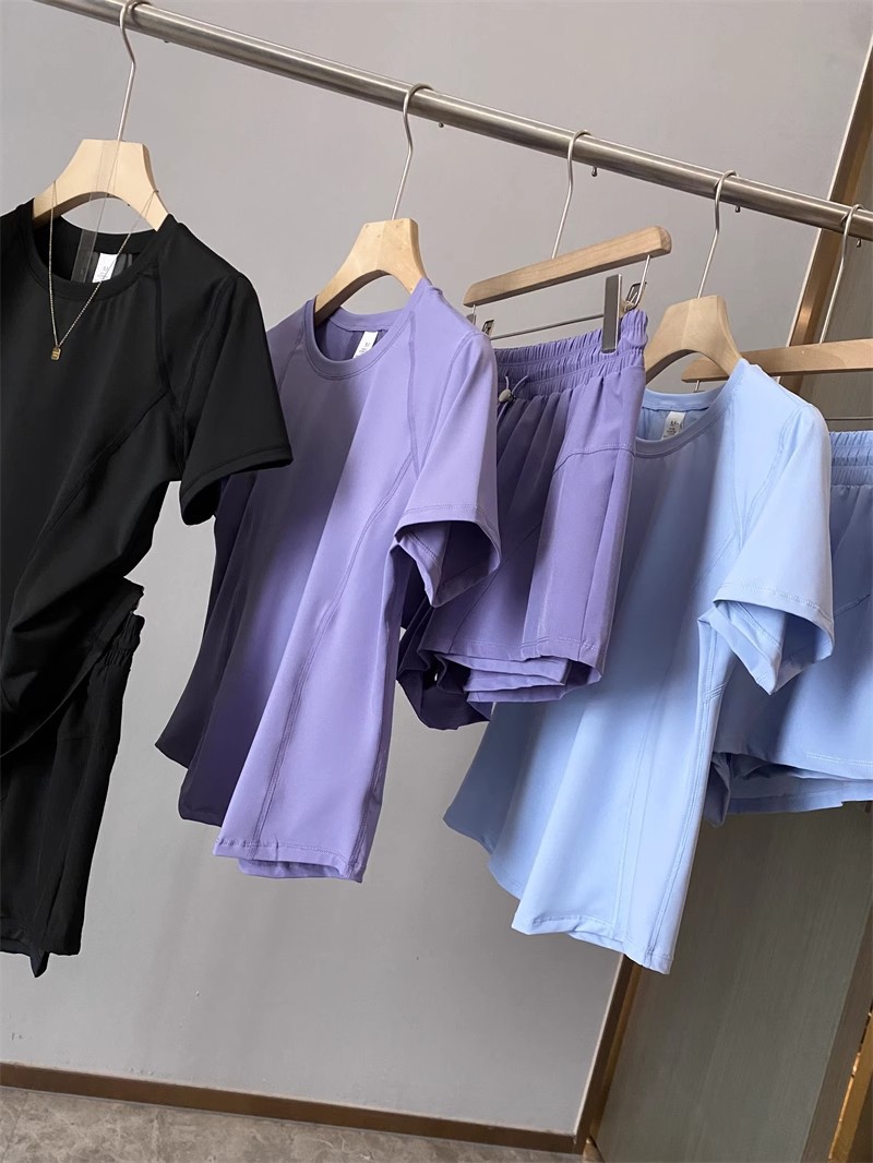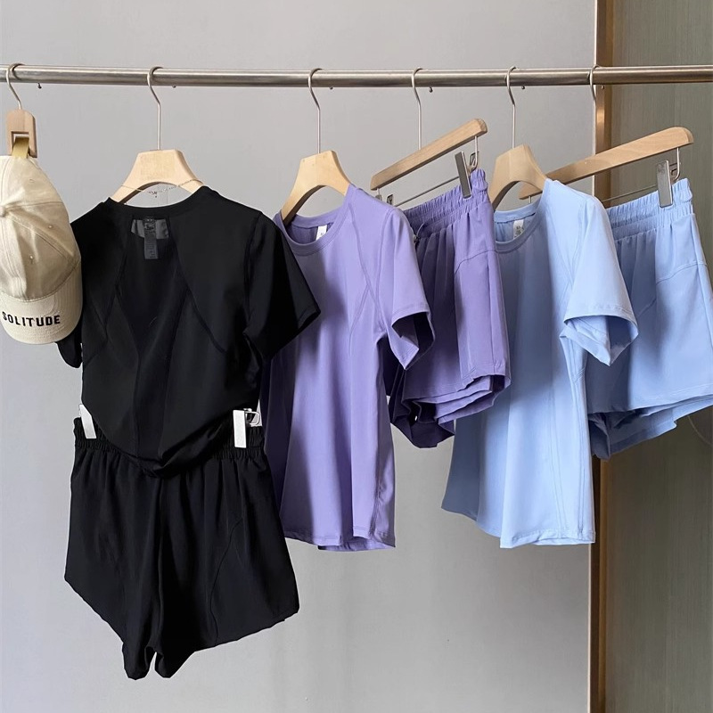 루 시리즈 패셔너블하고 심플한 속건성 스포츠 요가복 신축성 있는 슬림 반팔 반바지 투컬러 슈트 여성 여름 투피스 슈트