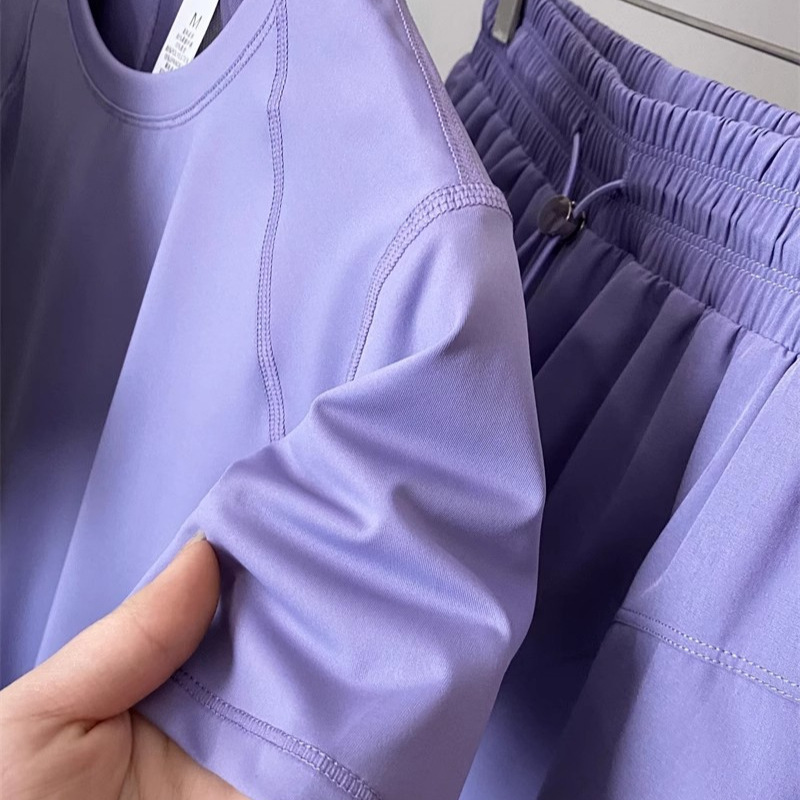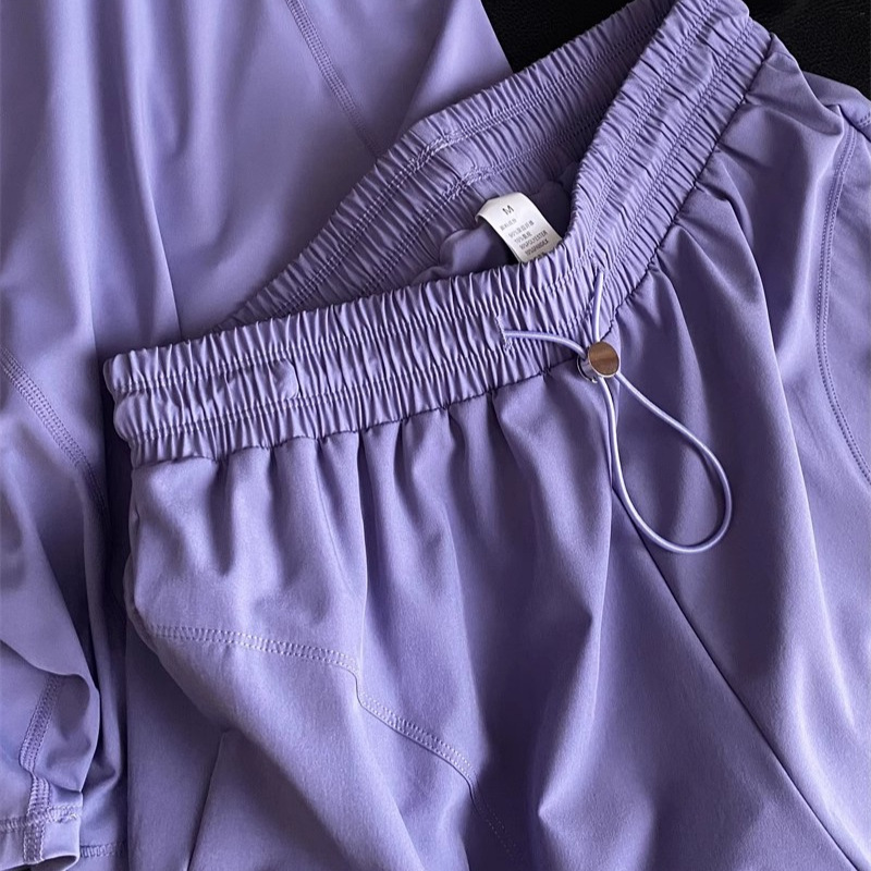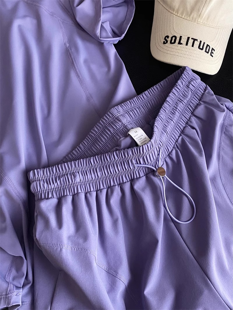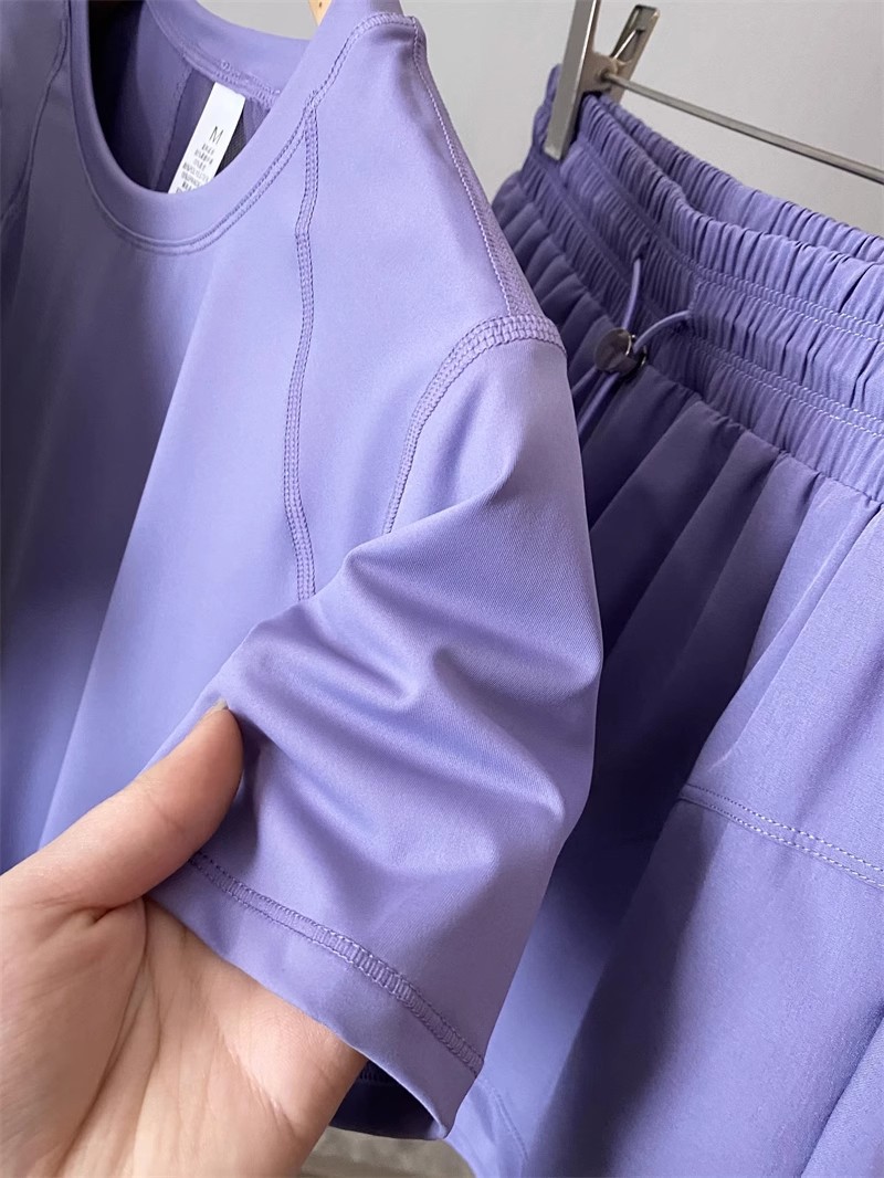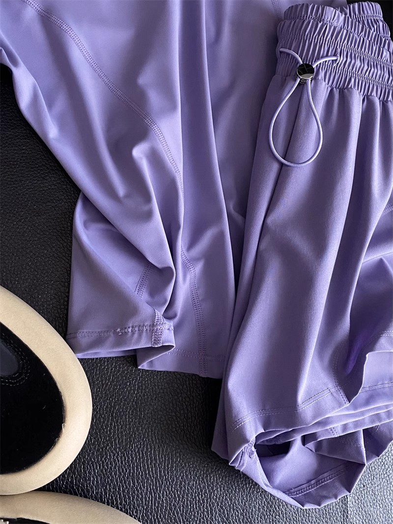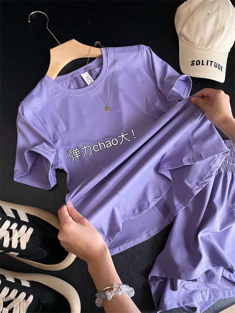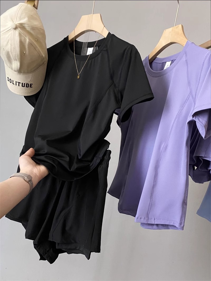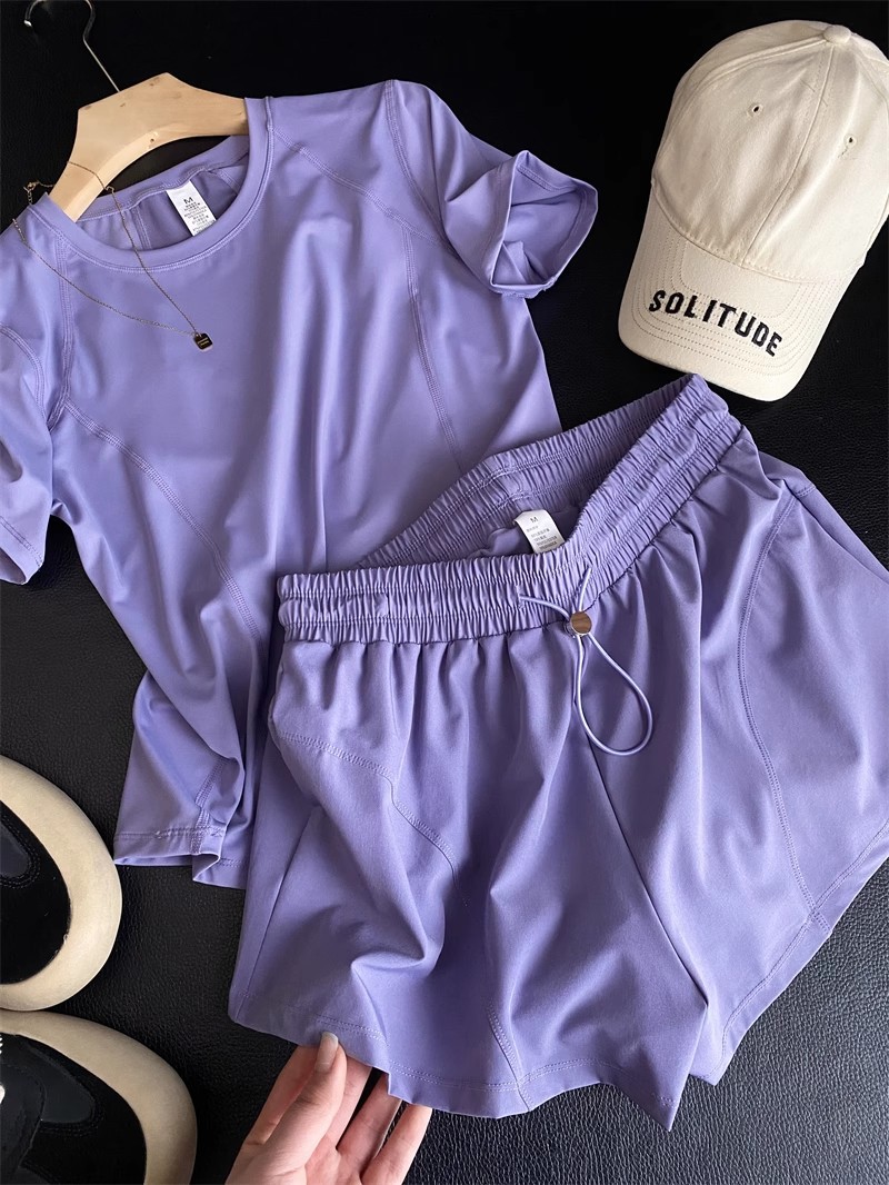 루 시리즈 패셔너블하고 심플한 속건성 스포츠 요가복 신축성 있는 슬림 반팔 반바지 투컬러 슈트 여성 여름 투피스 슈트