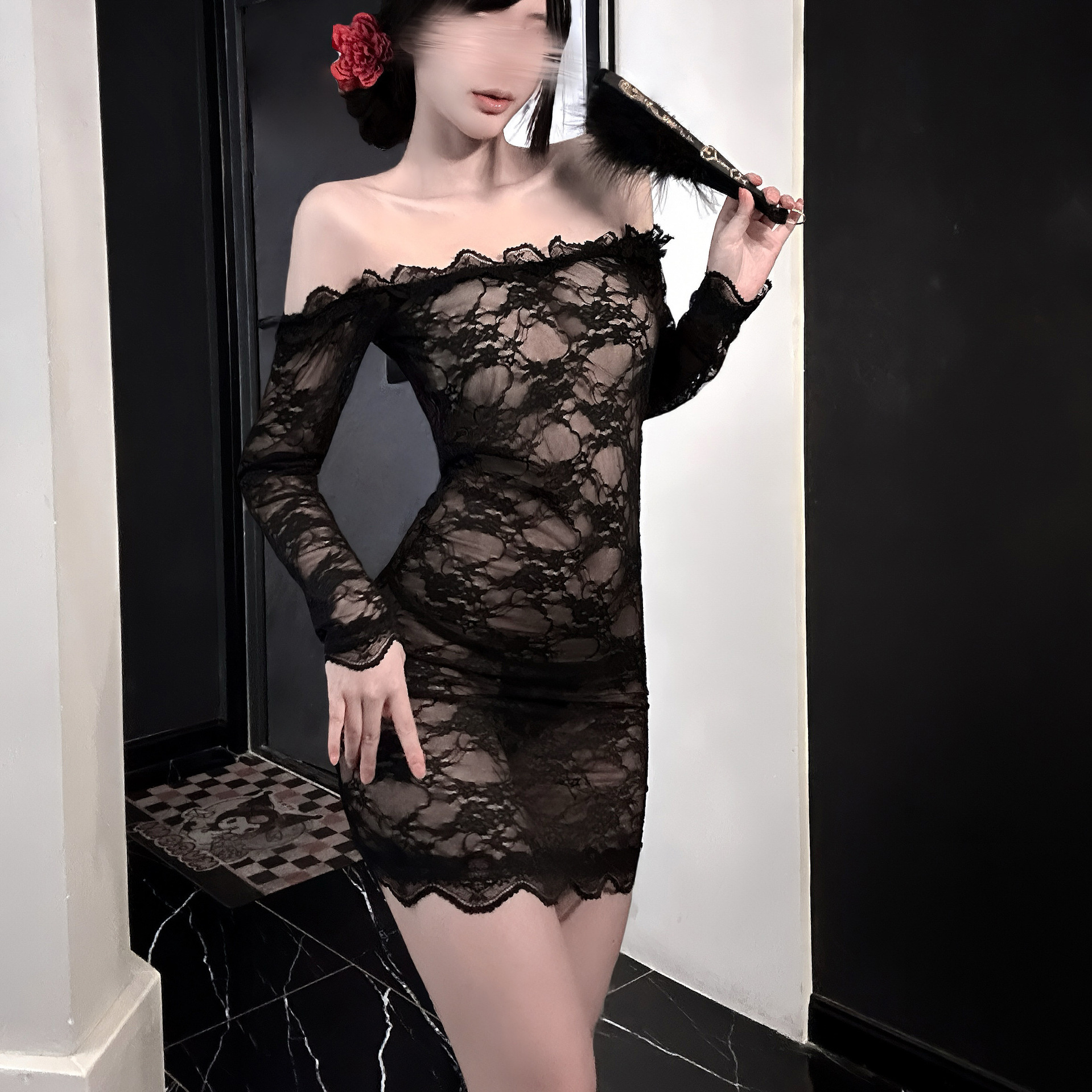 조무 섹시 란제리 레이스 원피스, 스타킹과 함께 입는 섹시한 시스루 원피스, 몸매를 돋보이게 하는 힙 라인을 강조하는 순수한 욕망의 나이트가운