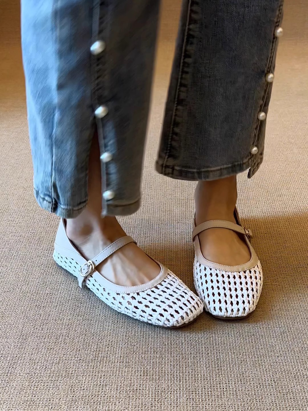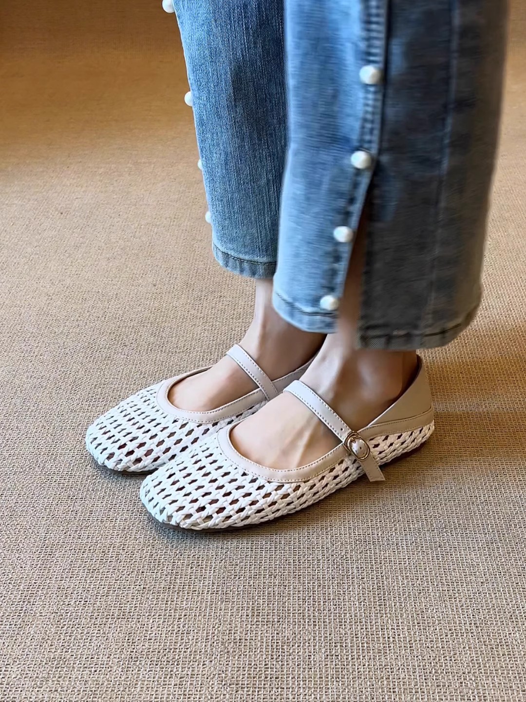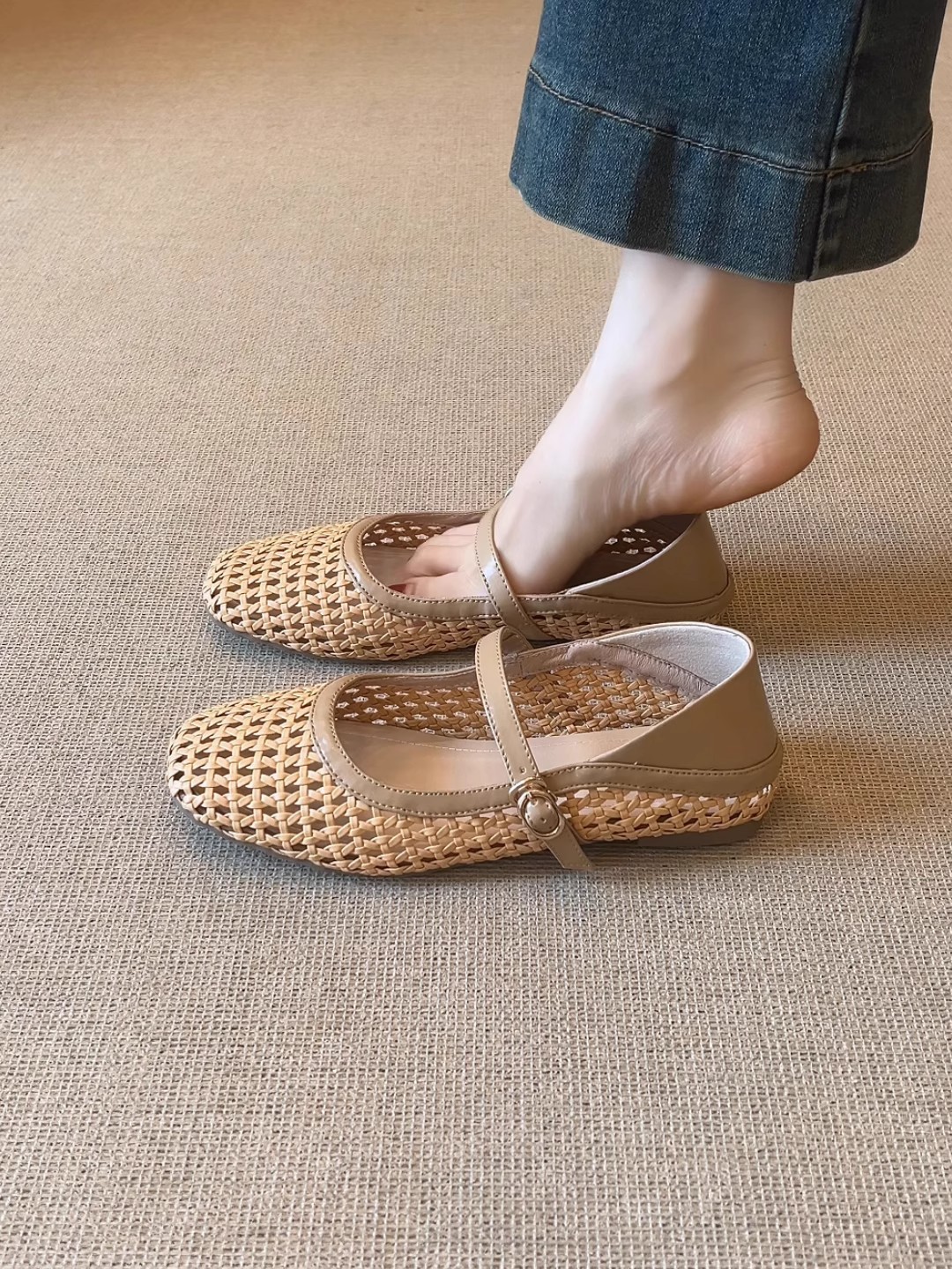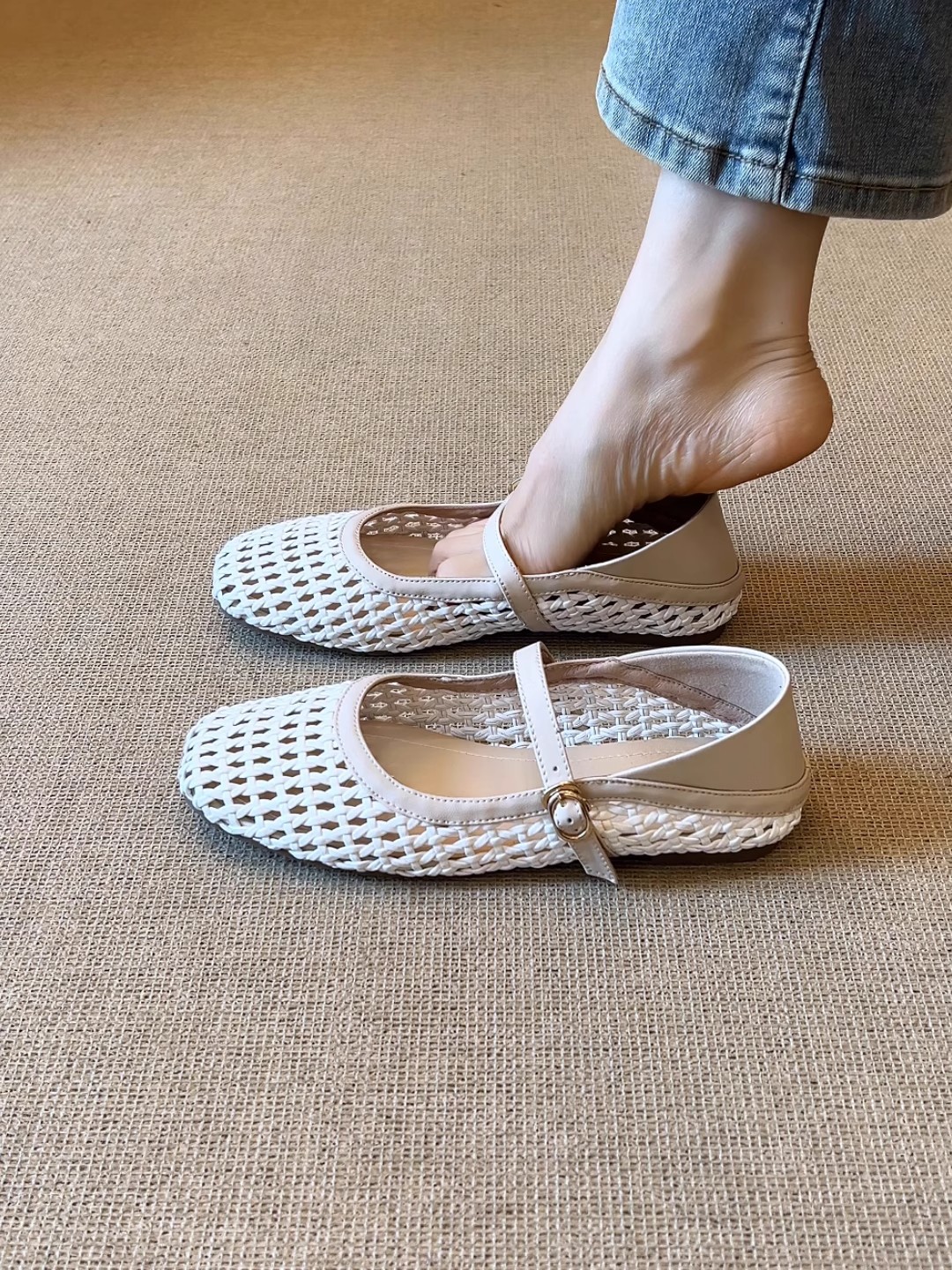 양가죽 손으로 짠 프렌치 메리 제인 신발 여름 펌프 플랫 슈즈 중공 통기성 나막신 샌들 여성용