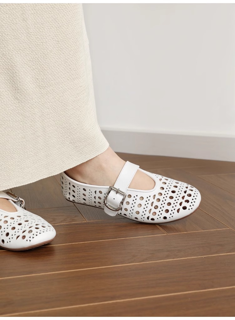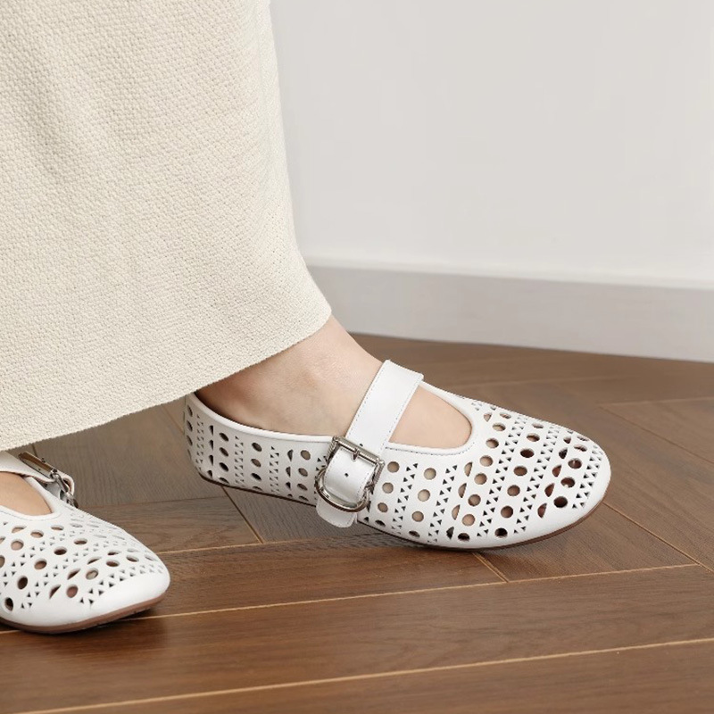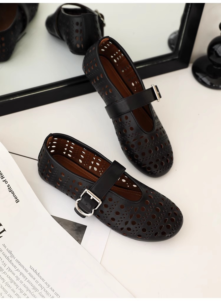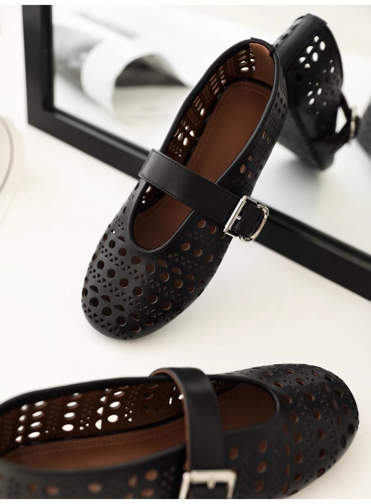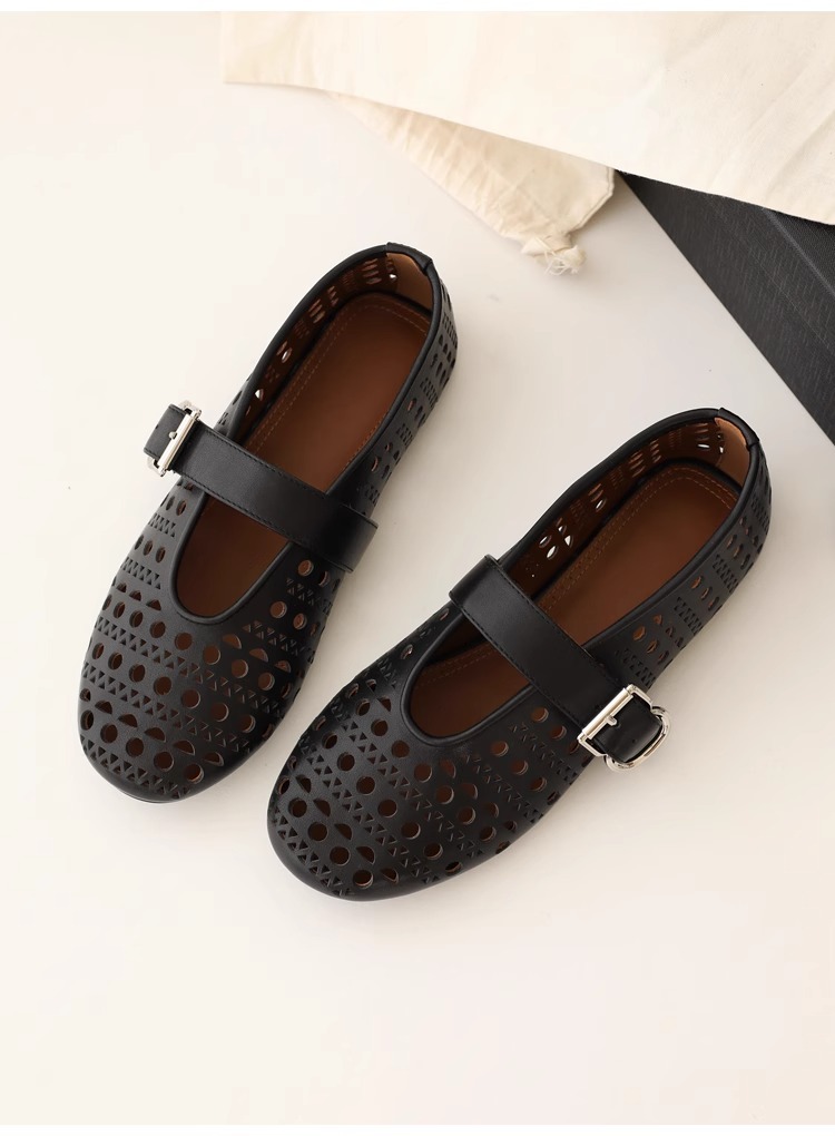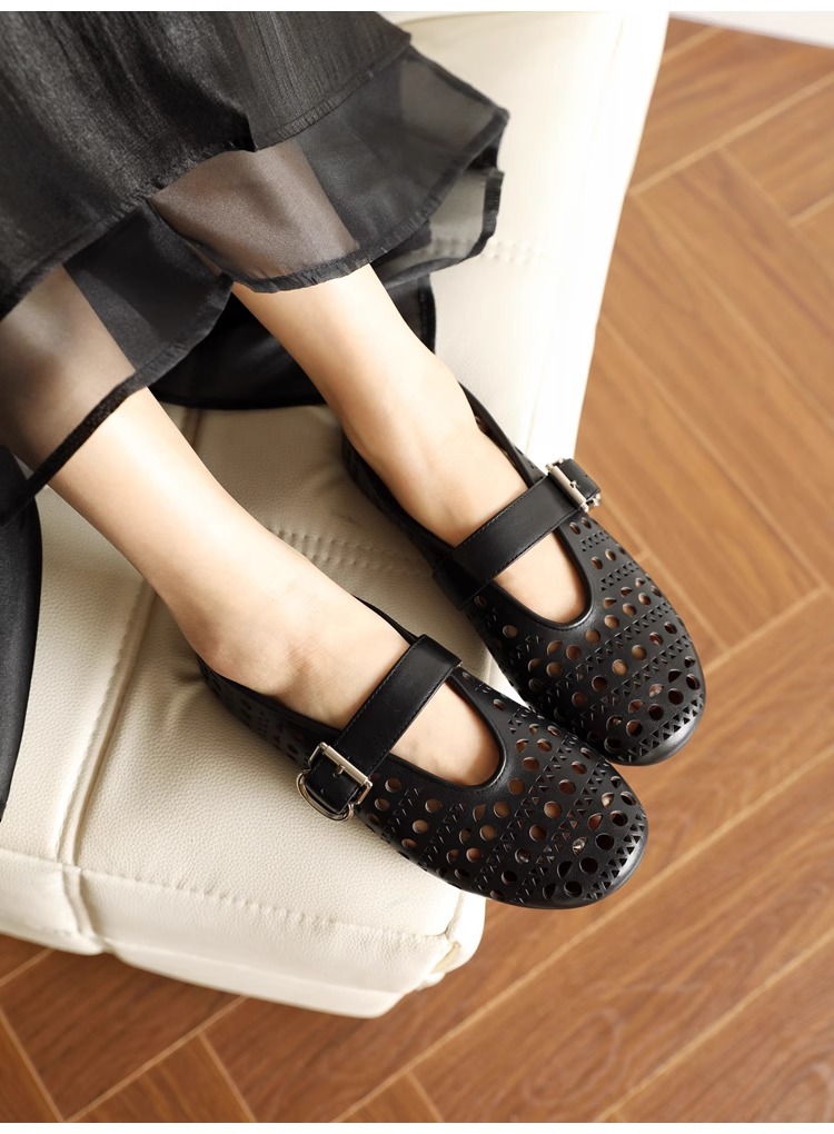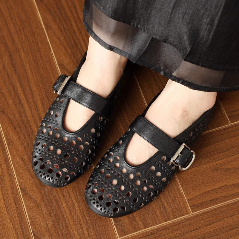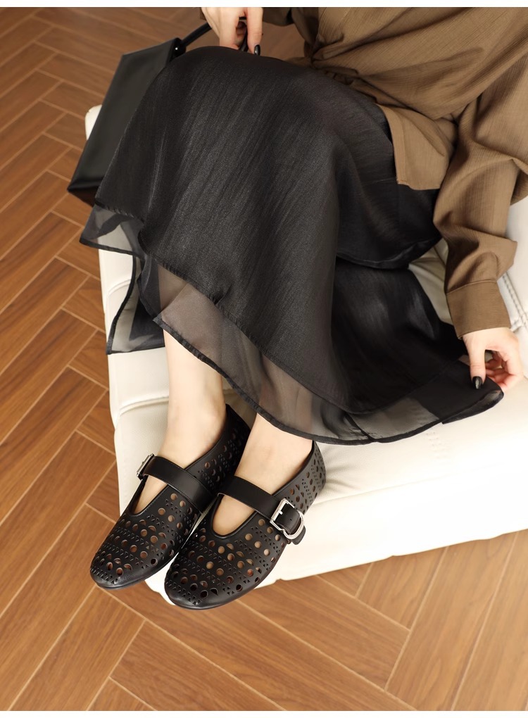 2025 새로운 스타일 중공 간단한 정품 가죽 메리 제인 여성 신발 플랫 바닥 할머니 신발 여성 원 라인 버클 스트랩 여성 신발