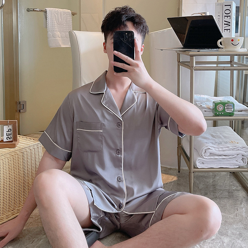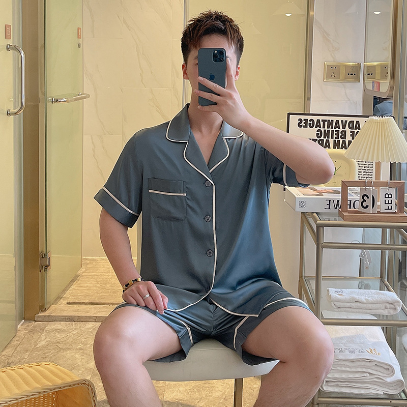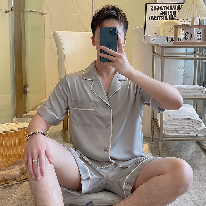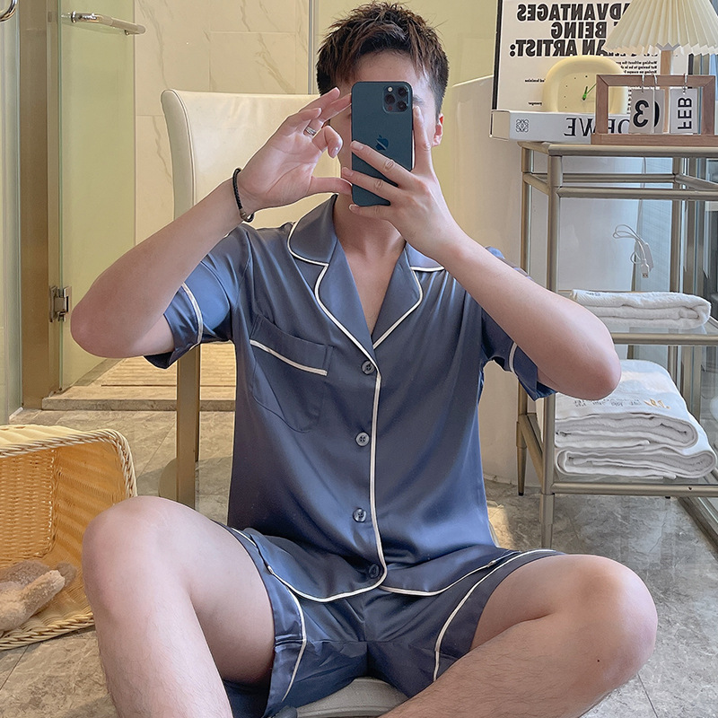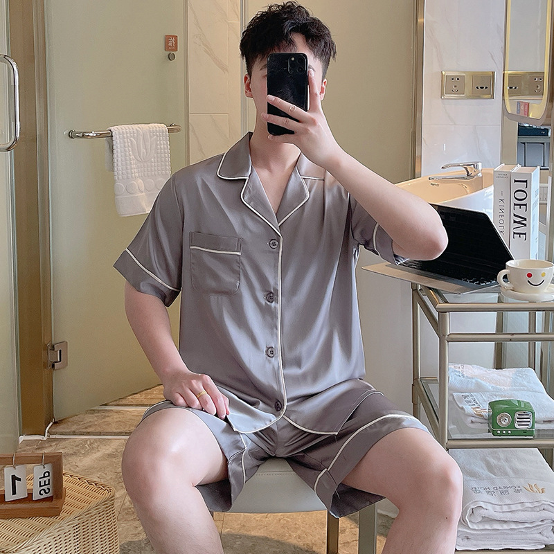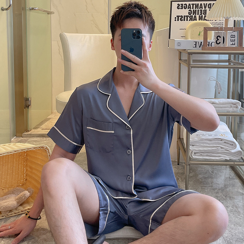 남성용 잠옷 여름 실크 아이스 실크 반팔 반바지 홈웨어 남성용 카디건 여름 얇은 모조 실크 슈트