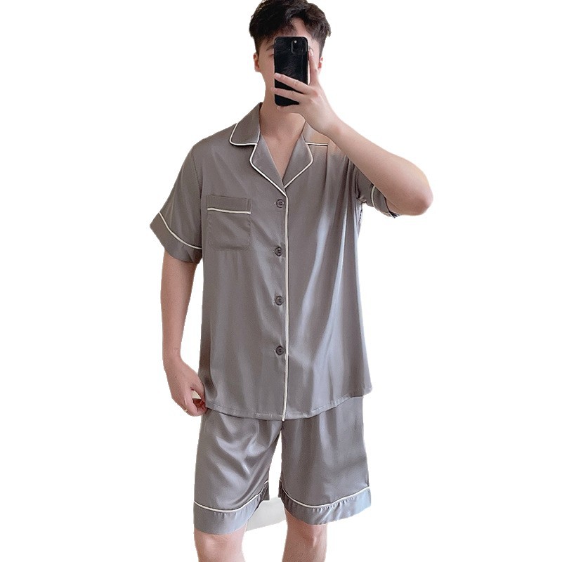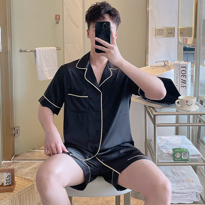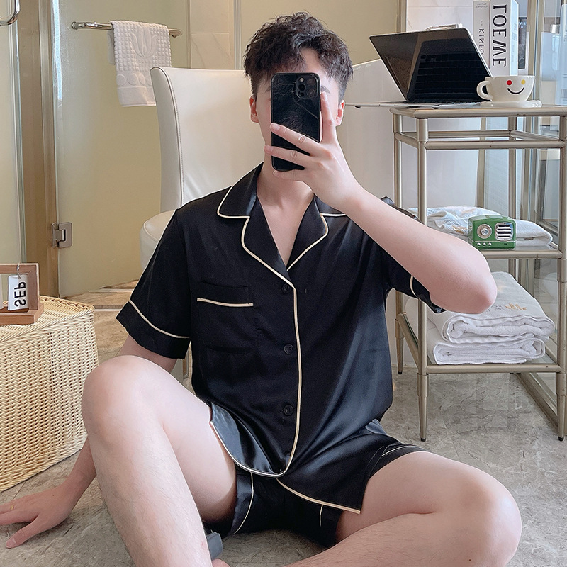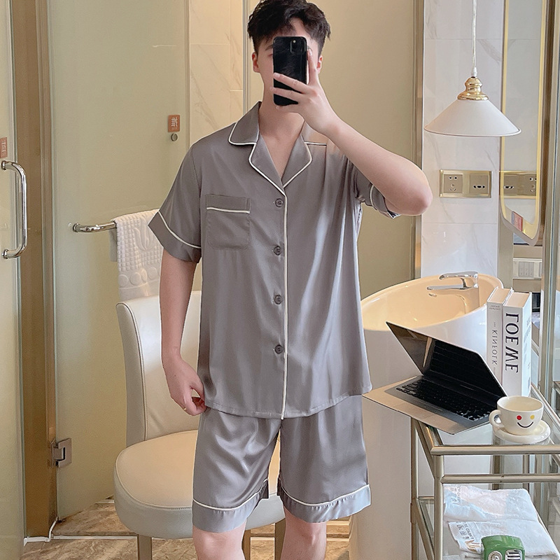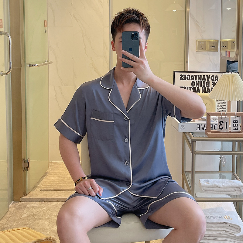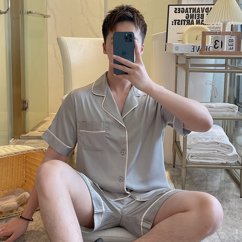 남성용 잠옷 여름 실크 아이스 실크 반팔 반바지 홈웨어 남성용 카디건 여름 얇은 모조 실크 슈트