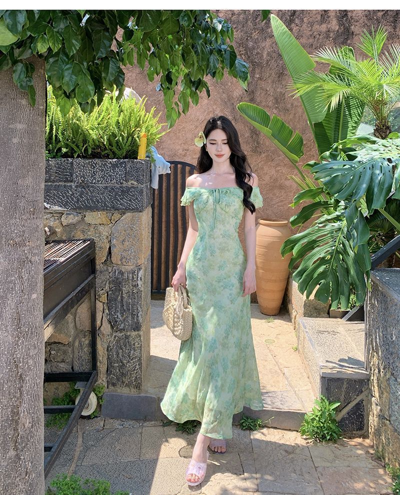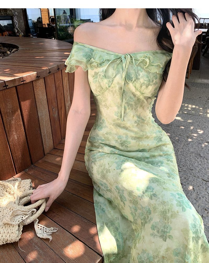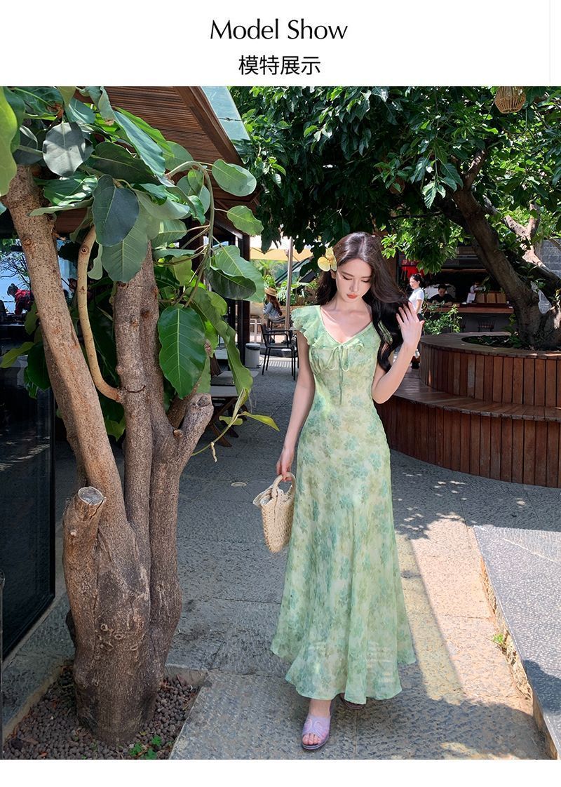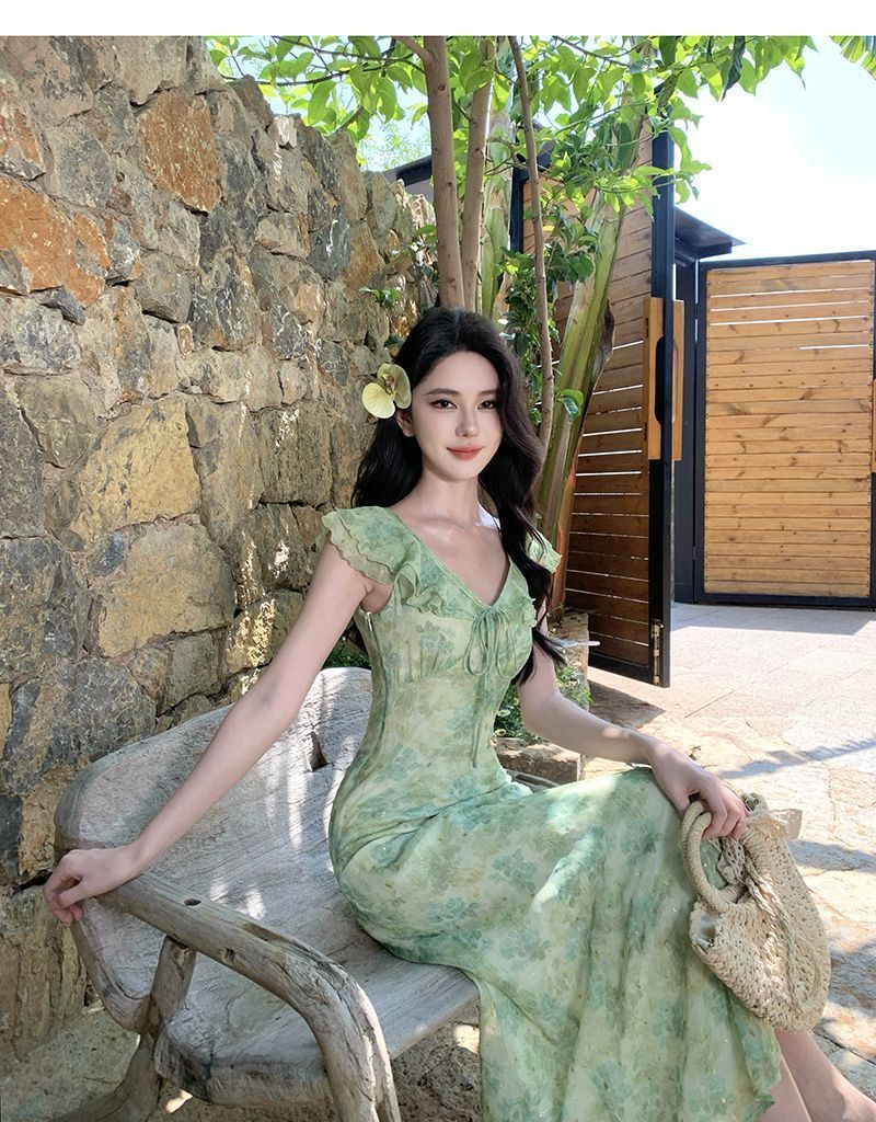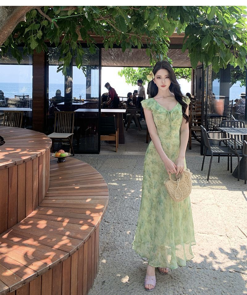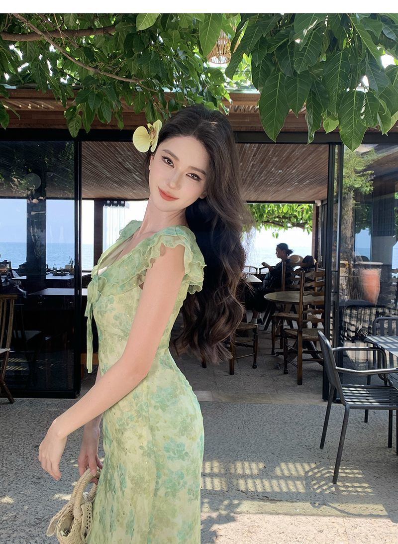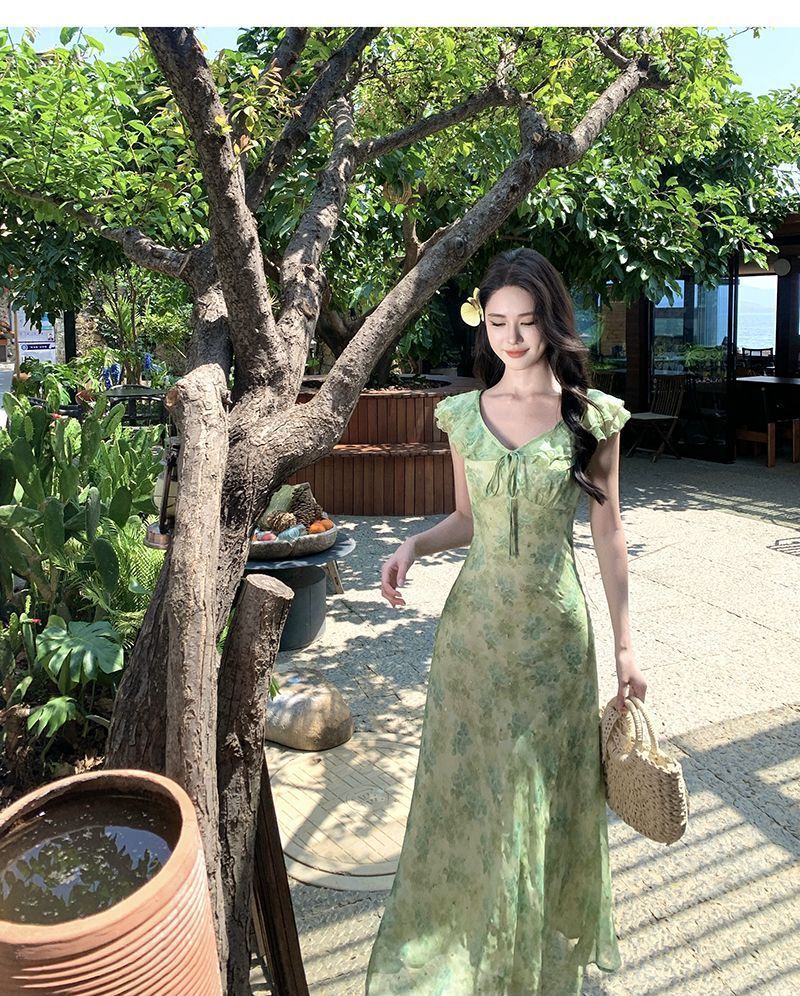 해변 휴가 녹색 꽃무늬 작은 플라잉 슬리브 드레스, 부드러운 기질, 독특하고 아름다운 허리라인 A라인 비치 롱 드레스